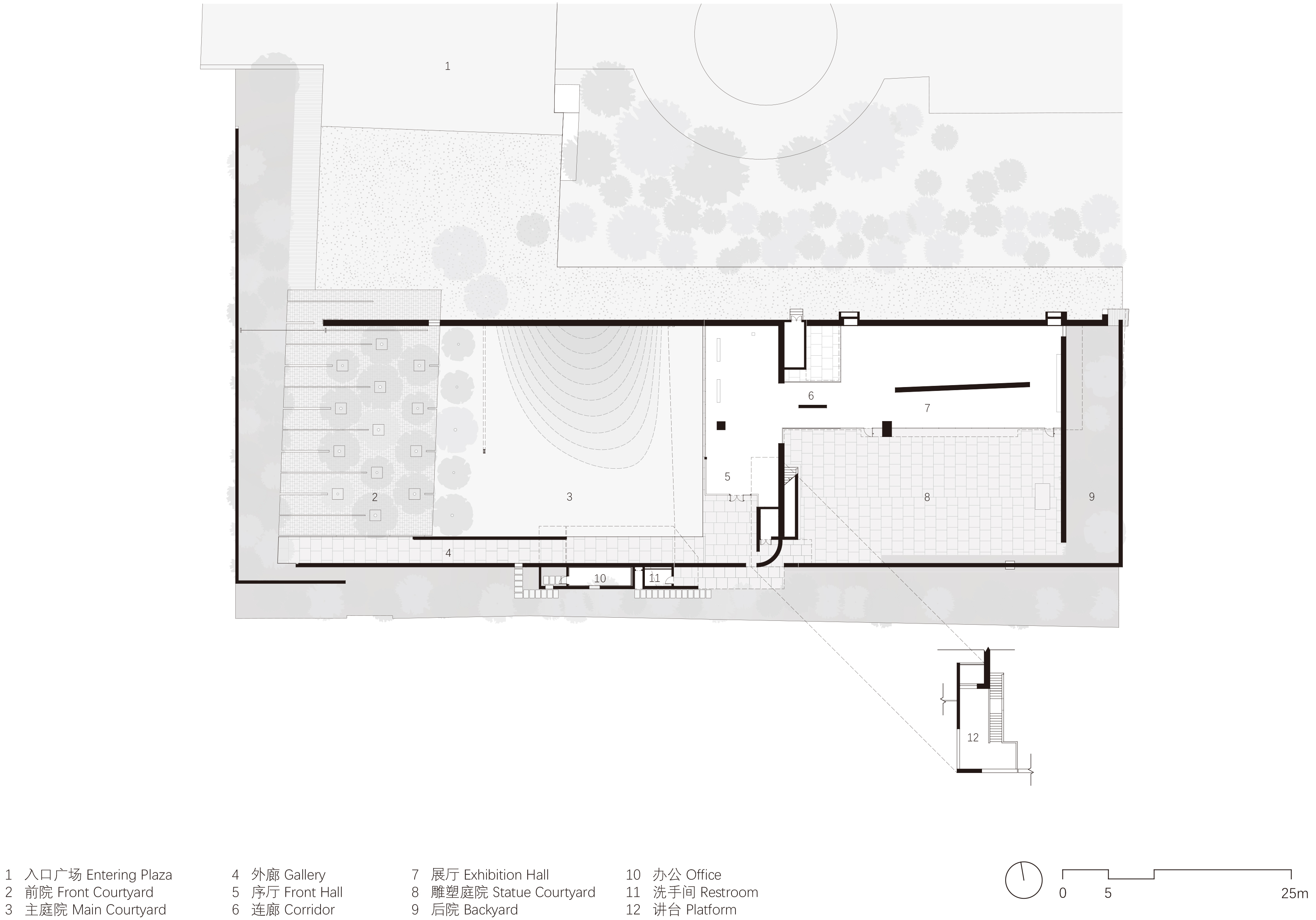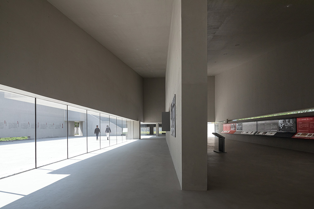The design regards the memorial hall as a place for the preservation and transmission of memory. By creating a calm and restrained atmosphere, visitors can escape from the mundane surroundings, focus on gazing, listening and contemplating, and reflect on life through memorizing the role model. Two sets of walls of different heights are designed along the perimeter of the site to moderately separate the memorial hall's area from the surroundings and to exclude the service buildings from the visitors' sight. The interior area of the memorial hall is divided into five main themed exhibition spaces, front yard, main courtyard, front hall, exhibition hall and the statue courtyard. These are linked into a sequence from west to east along the depth the site, incrementally separating from the surrounding daily scenes.