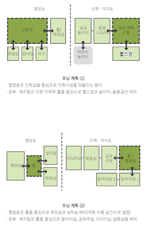 계획안의 가장 큰 개념은 주변 맥락에 대한 이해이다. 대지 주변에는 도심지처럼 큼직한 건물들이 있는 것이 아니라 작고 낮은 건물이 모여있어, 주변을 바라보면 산과 논밭들이 한눈에 보인다. 이러한 상촌리의 도시 맥락 속에서 건축물이 어떻게 자리 잡아야 할지를 먼저 고민했다. 이에 대한 첫 번째 해답은 분절과 조합이다. 프로그램과 그 면적에 따라 매스를 분절하고 운영 시간과 관계성을 고려하여 분절된 매스를 조합했다. 따라서 하나의 큰 매스 형태의 건물이 아니라 상촌리의 도시 맥락과 어울리는 작은 스케일의 공간이 모인 마을 형태의 건물을 계획했다. 두 번째는 이용자에 대한 이해와 주변 시설과의 연계이다. 본 건물은 행정 업무공간과 주민들이 이용하는 문화 · 복지 공간이 함께 있으므로 행정동과 문화 · 복지동으로 분리하여 계획했다. 또한 인근 면민회관의 기존 옥외 공간과 연계하여 건물의 중심에 행사용 마당인 중앙광장과 어린이 놀이터와 다목적 쉼터가 있는 휴식의 숲을 조성했다.