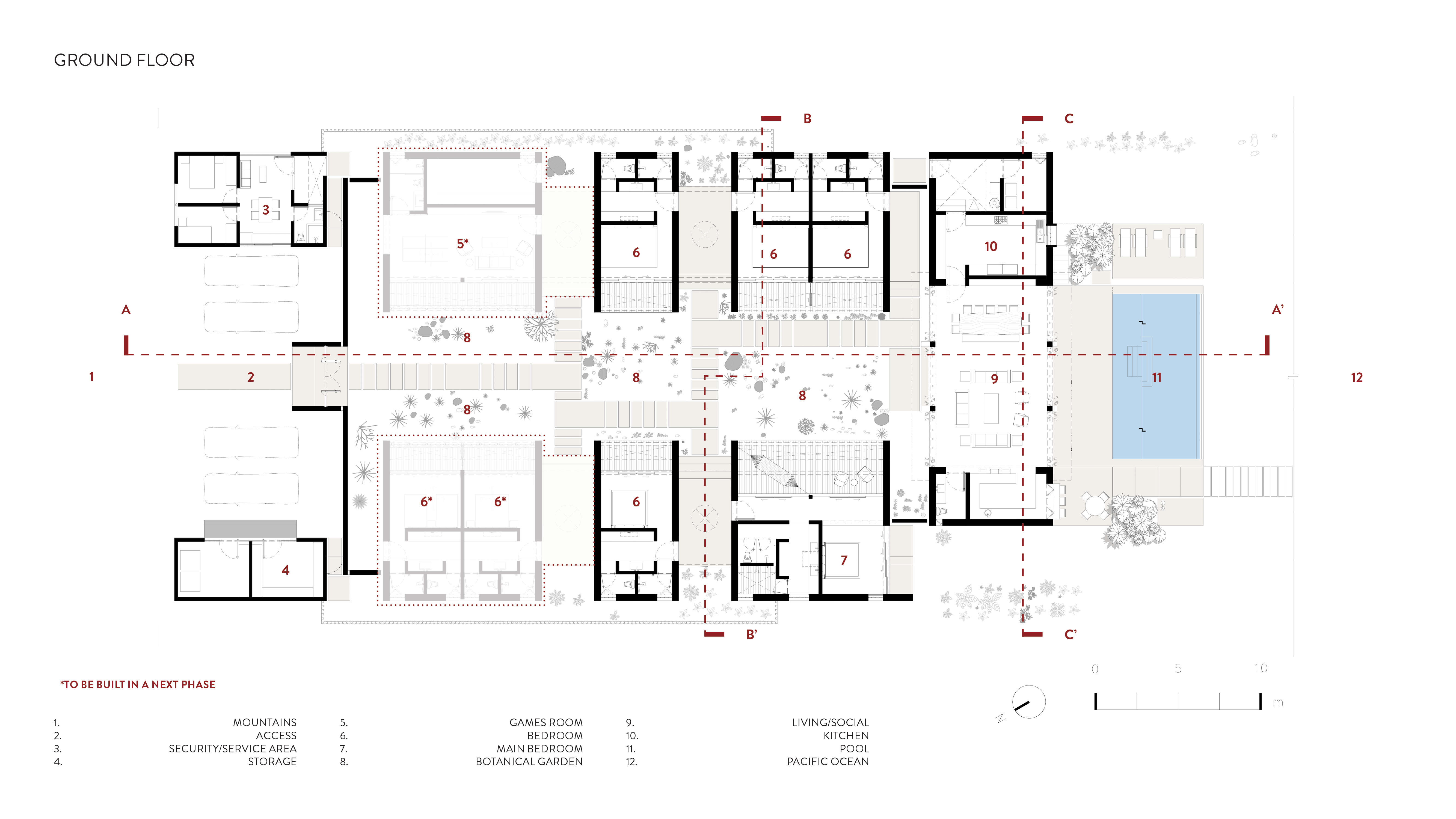 The first is an open and unobstructed garden that stretches from the living area to the ocean—a natural dune. Privacy from neighboring properties is ensured by a layer of denser foliage composed of native tropical jungle species on the laterals of the property. The project's centerpiece is a desert botanical garden showcasing endemic species. The selection and placement of each plant were carefully considered, complementing the pathways that interconnect the pavilions. The seasonal cycle of diverse agaves, cacti, bromeliads, and trees such as pochote (Ceiba pentandra), copal (Bursera simaruba), and guayacán (Guaiacum coulteri) is exemplified through blooming and altering textures.