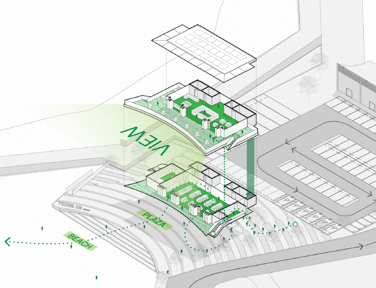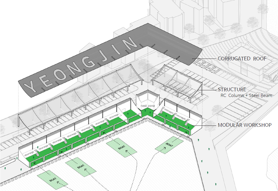 선착장의 형태를 따라 영진항 서측과 북측에 배치한 공동작업장은 쾌적한 작업환경에 최적화된 디자인을 제안한다. 자연환기의 흐름을 유도하기 위해 곡선형 지붕을 계획하였고 겨울철 차가운 북서풍을 막기 위해 서측은 솔리드한 벽체를 계획하여 쾌적한 작업환경을 조성하였다. 환경적 요인으로 디자인된 곡선형태의 지붕은 먼 바다에서 영진항의 정체성을 나타내는 랜드마크로서 역할을 한다. 북측와 서측작업장이 연결되는 공간은 어민들이 작업전후 세척할 수 있는 화장실과