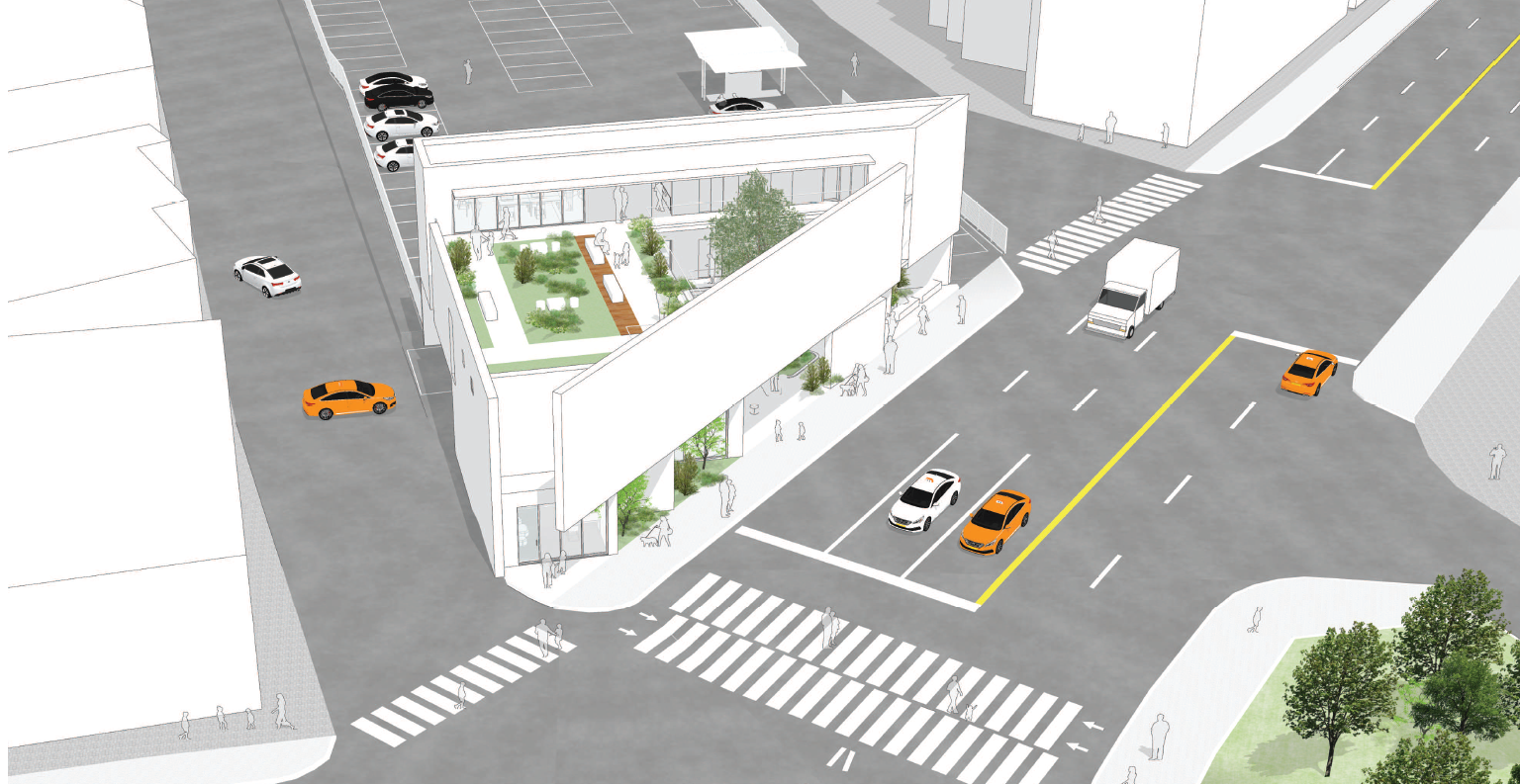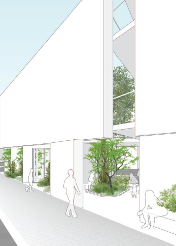 대지 외부의 녹지 축과 보도를 고려해 저층부에 커뮤니티 공간과 녹지공간을 마련하여 지역 주민들과 행인들의 안식처가 될 수 있도록 하였다. 녹지에는 수직 보이드를 두어 나무를 식재해 상층에서도 나무와 저층과 관계 맺을 수 있도록 하였다. 보이드를 향해 층마다 데크를 마련하였고, 동선 또한 보이드와 인접해 배치하였다. 동선은 외부인도 출입 가능하도록 계획하여 녹지를 따라 옥상 정원까지 지역 주민들의 쉼터로 활용된다.