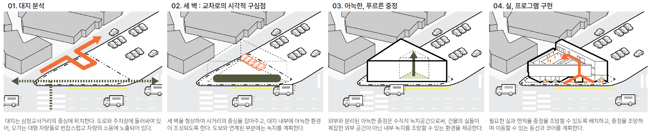 해당 대지는 삼정교 사거리의 한 가운데 위치해 있다. 사거리는 위요감 없이 황량하며, 번잡한 간판과 건물들, 도로와 차량의 소음에 둘러싸여 있다. 우리는 사거리의 중심을 잡아 줄 수 있도록 외부에서는 묵직함과 깔끔함을 주되, 내부는 외부와 분리되어 아늑하면서도 개방감 있는 공간을 목표했다.