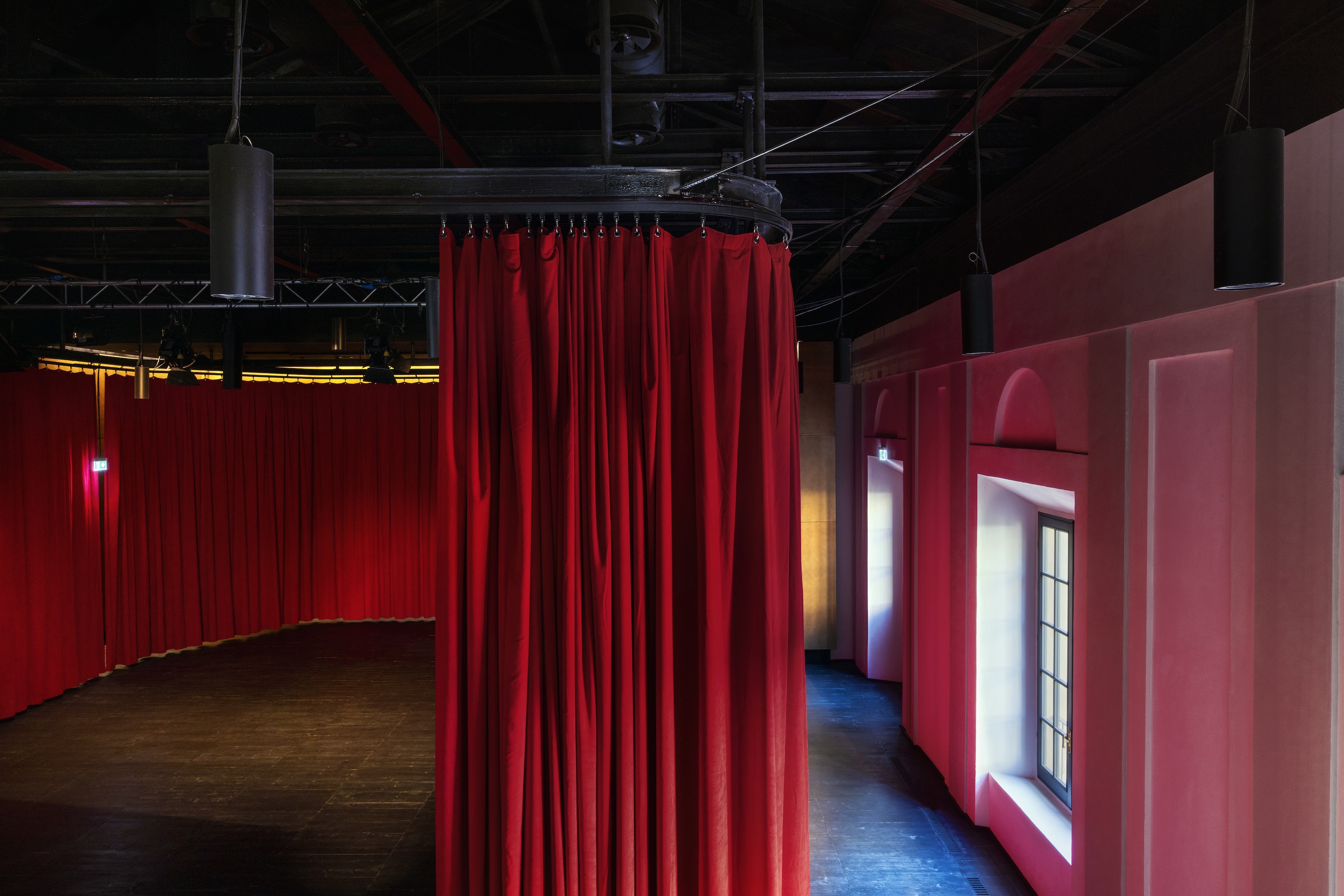 But what defines the space of FLEXI, allowing for ever-changing configurations, is the system for sliding a double layer of fabric walls along a track suspended from the ceiling, housing a theatrical grid. The curtains can close or open the space as needed, offering the opportunity to engage with the rediscovered architectural layout from the 1930s. This solution further controls the isolation of the hall and the requirements for refraction or acoustic absorption depending on the events hosted, which may take place simultaneously in the historic hall and the new Ridotto. Using the stratagem of the movable textile wall, the enclosed space can accommodate 150 seated places while maintaining service circulation and potential evacuation from the boxes outside it. The floor is made of pine wood painted black on a framework of joists. In the dance theater, there is no distinction between the audience space and the performance space. Here, everything is a stage, and the performance enclosure is defined by the movable curtains, creating an intimate setting for the show.