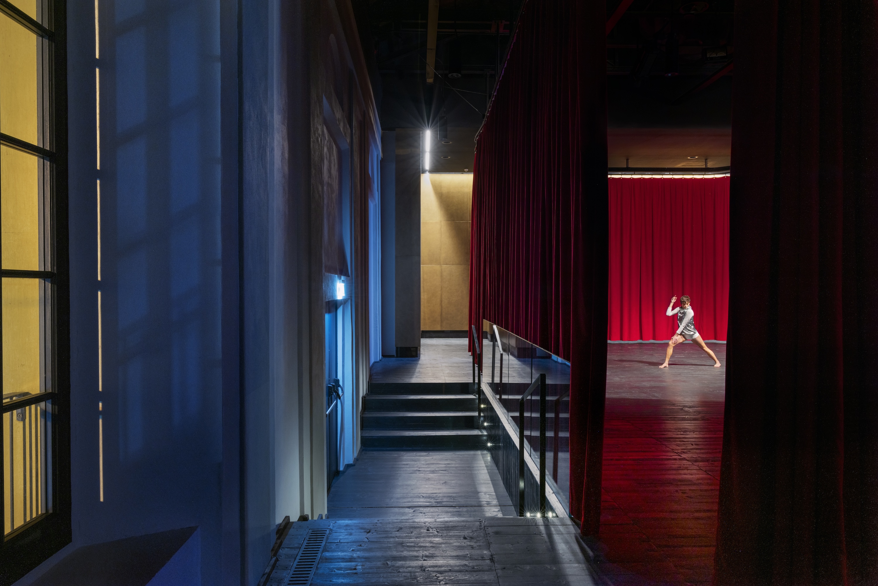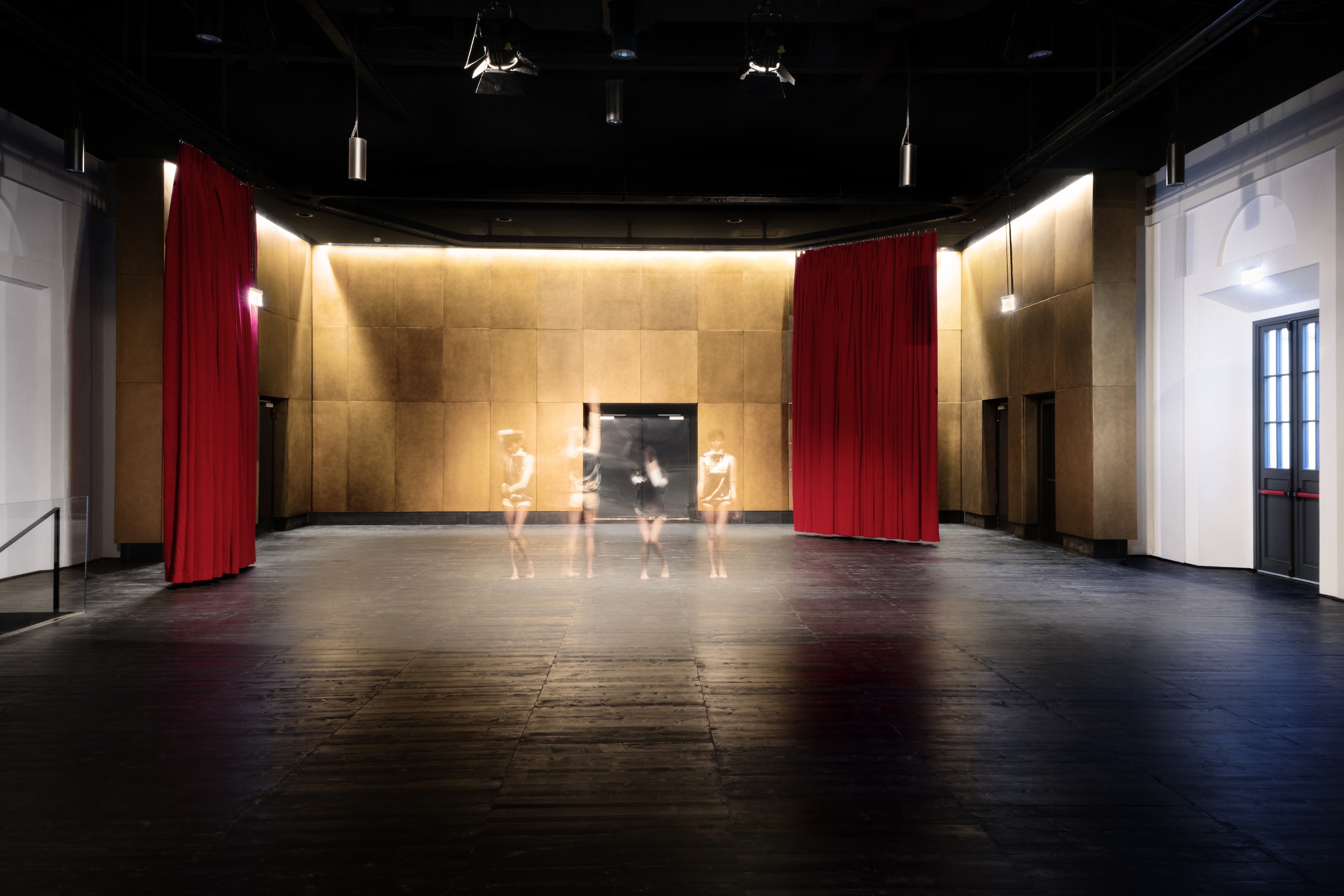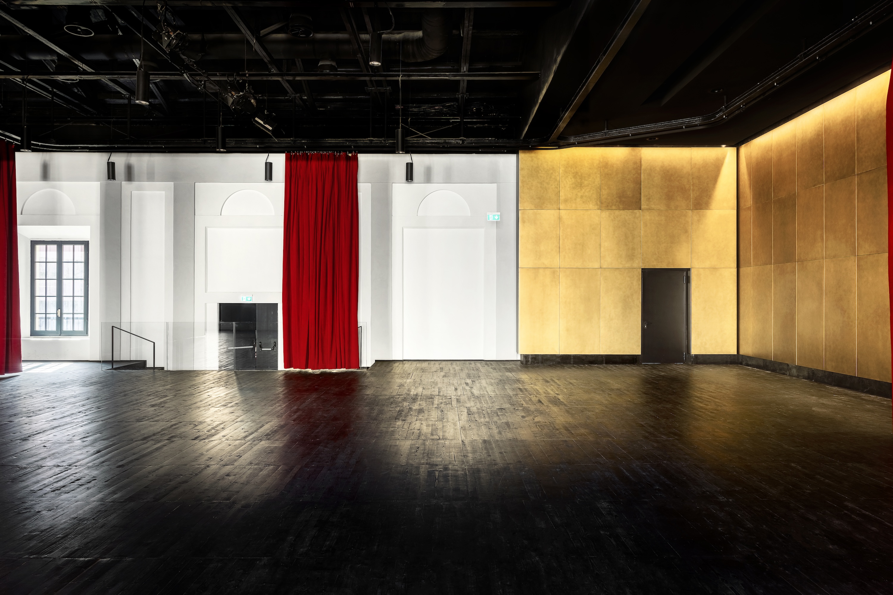 But what defines the space of FLEXI, allowing for ever-changing configurations, is the system for sliding a double layer of fabric walls along a track suspended from the ceiling, housing a theatrical grid. The curtains can close or open the space as needed, offering the opportunity to engage with the rediscovered architectural layout from the 1930s. This solution further controls the isolation of the hall and the requirements for refraction or acoustic absorption depending on the events hosted, which may take place simultaneously in the historic hall and the new Ridotto. Using the stratagem of the movable textile wall, the enclosed space can accommodate 150 seated places while maintaining service circulation and potential evacuation from the boxes outside it. The floor is made of pine wood painted black on a framework of joists. In the dance theater, there is no distinction between the audience space and the performance space. Here, everything is a stage, and the performance enclosure is defined by the movable curtains, creating an intimate setting for the show.