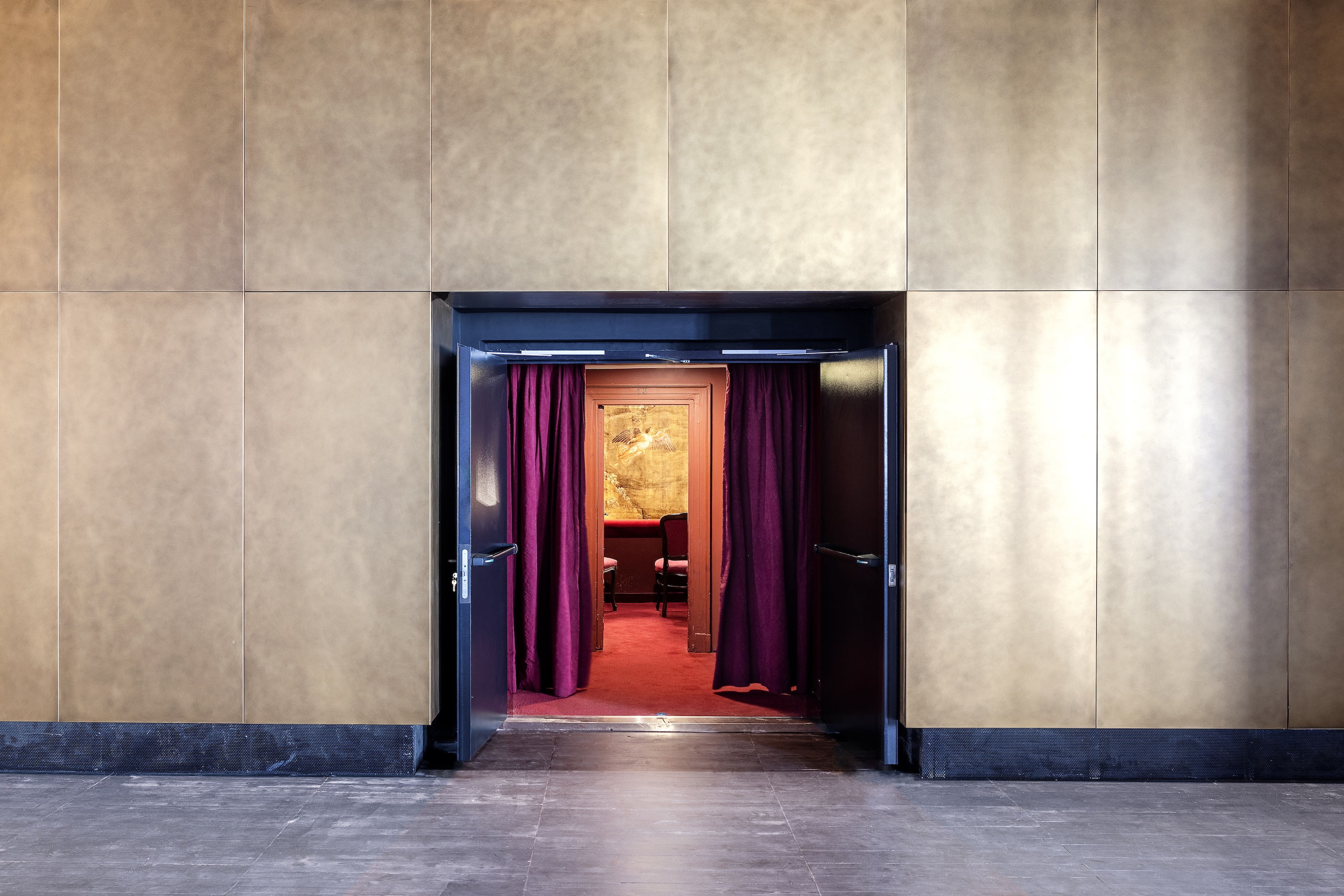 The Sala della Repubblica has been redesigned to bear witness to and reinterpret the evolutionary history of this portion of the theater. This begins with the highlighting of the original 18th-century facade of the building, later incorporated into the theater. Where the facade once stood, STARTT has arranged a large wall, emphasized by a covering of expansive golden panels. These panels simultaneously indicate the lost urban dimension and foreshadow the preciousness of the baroque theater’s stucco. The golden wall conceals technical and mechanical systems, ensuring they remain out of sight while serving the crucial function of acoustic insulation. In the Ridotto (namely the Second Hall) volume, other elements have also been recovered that narrate the relationship with the city. These include the apparatus of pilasters and lunettes elaborated during the modifications in the thirties, traces of which had been lost.