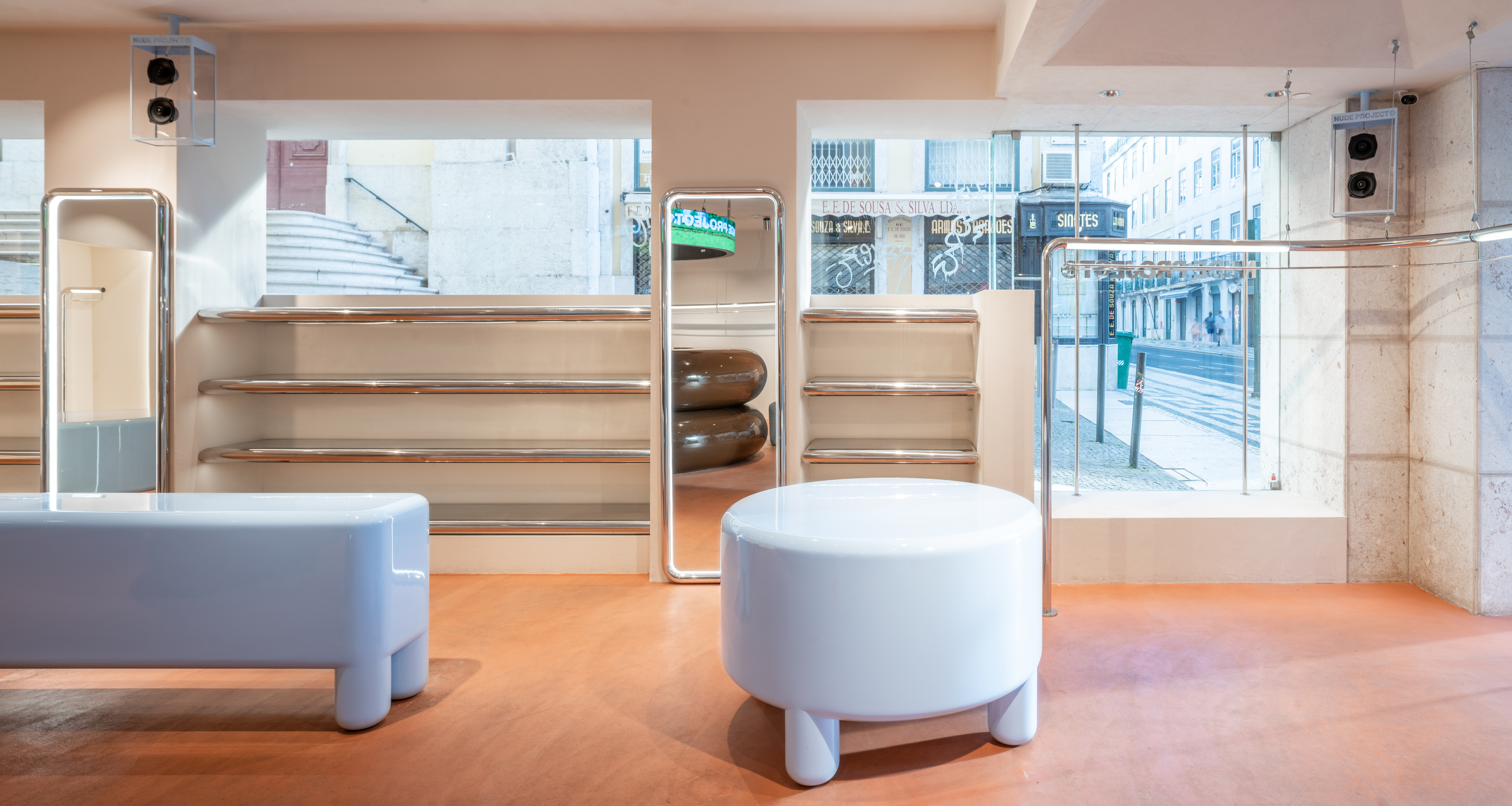 In this context, El Departamento's creative team, led by architect Alberto Eltini and interior designer Marina Martín, finds inspiration in Lisbon's unique charm: its Atlantic light, sea breeze and deeply-rooted culture, always open to innovation. This duality of the city is also reflected in the space's atmosphere. A typically Portuguese building houses Nude Project's new store. Its large corner façade maximizes space exposure while catching the attention of passersby.