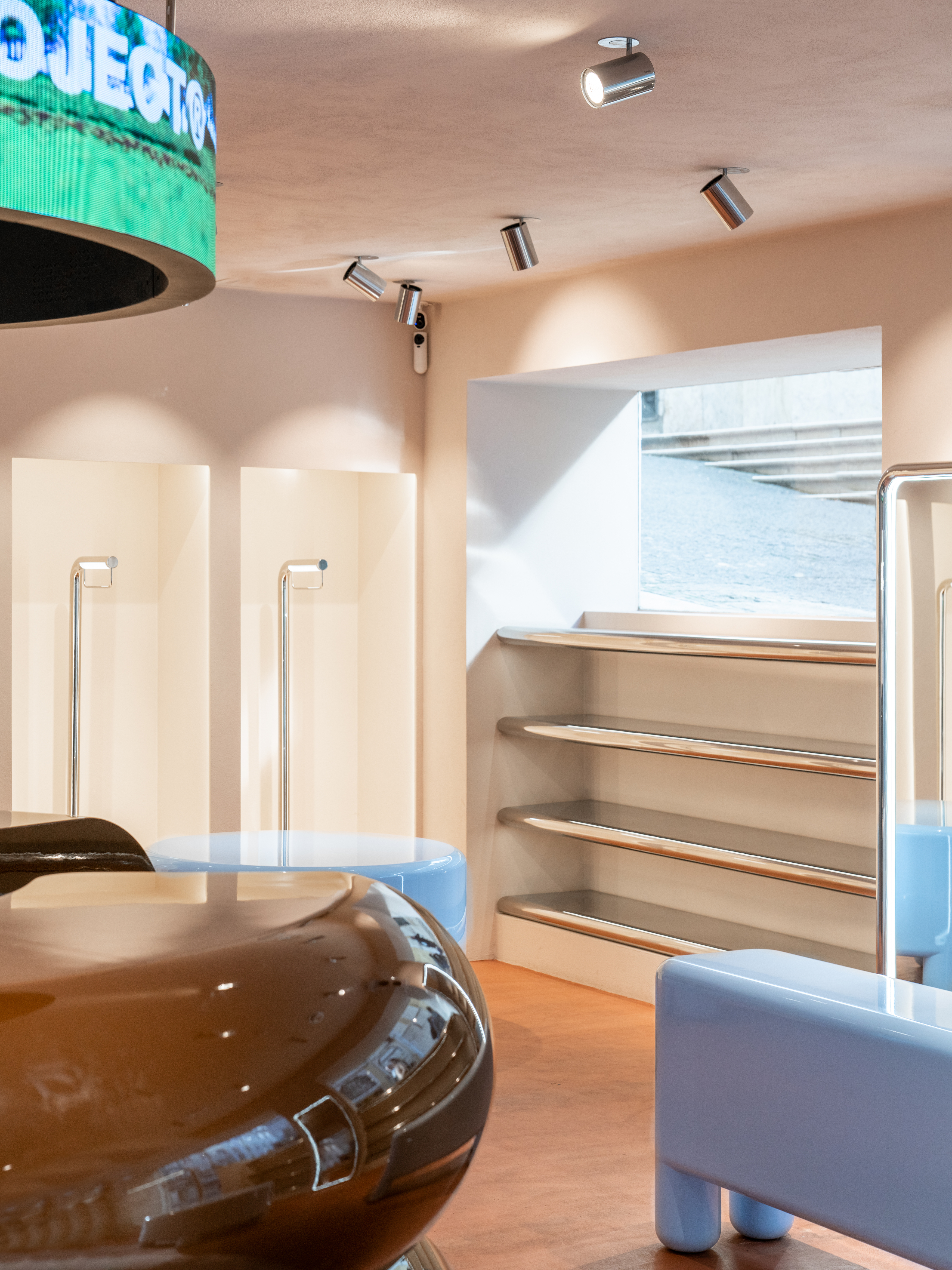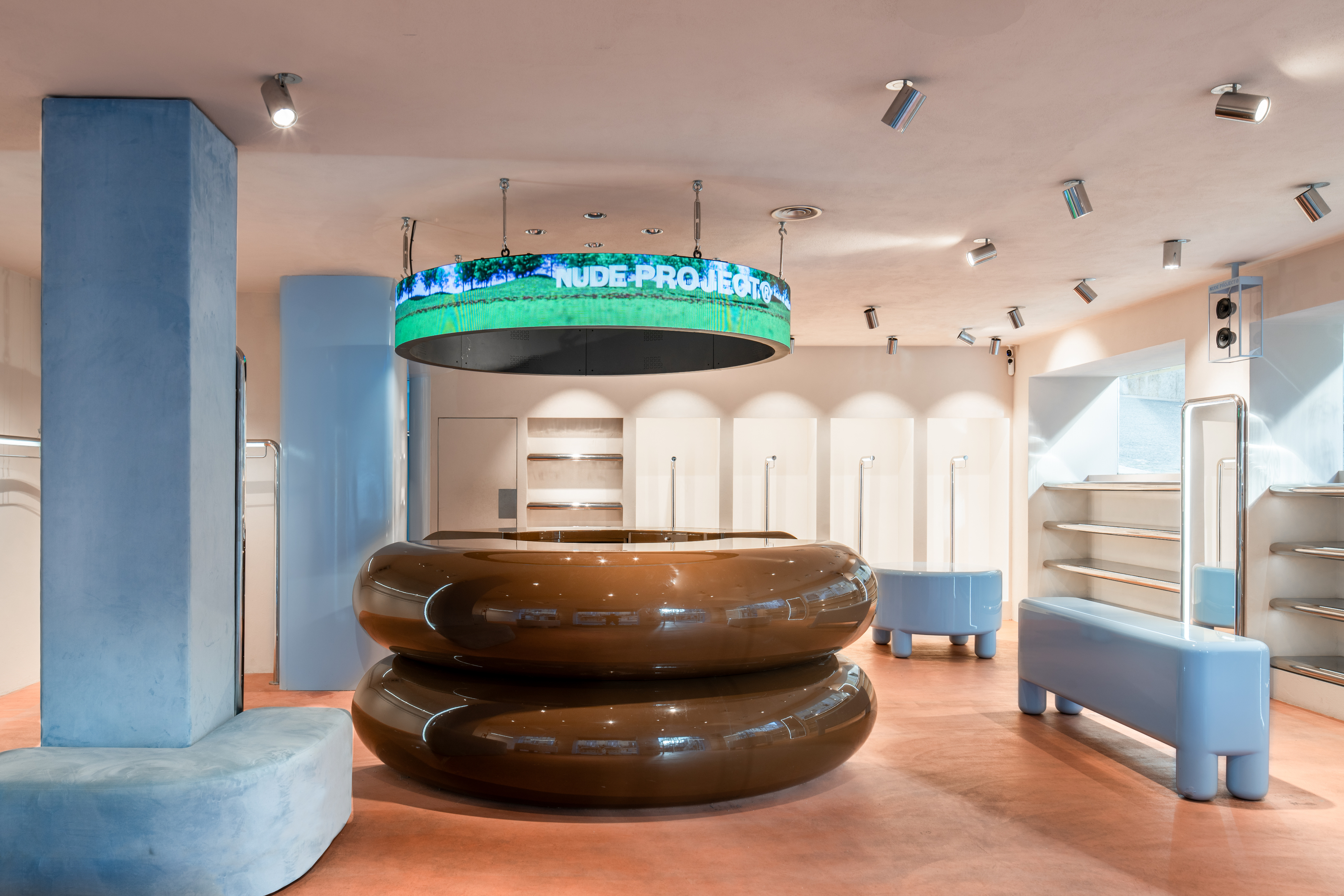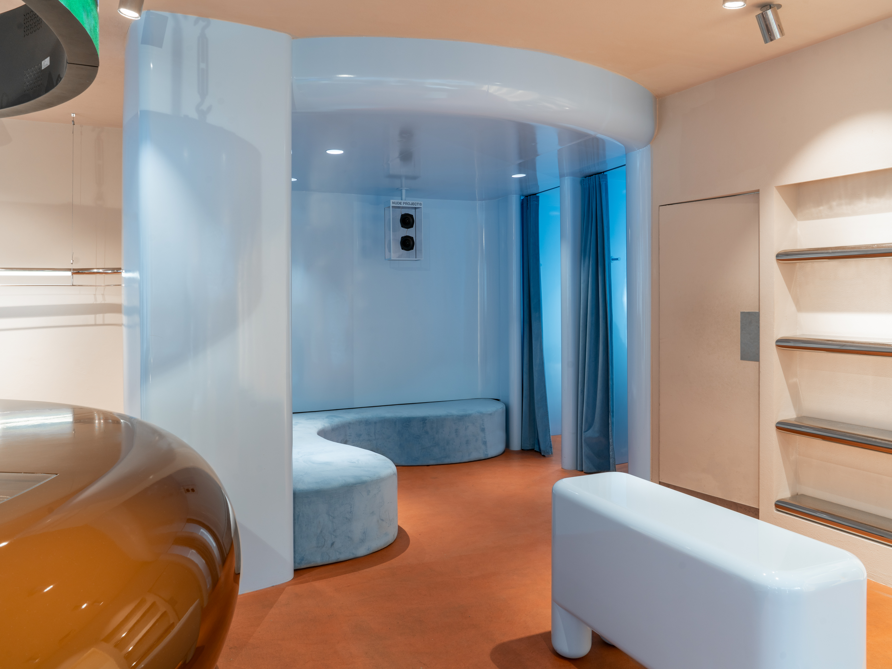 Open spaces, velvet-draped walls, curved forms, glossy finishes, circular screens and a burst of Nude Project's corporate colors. This is the new flagship store designed by the creative team at El Departamento for the streetwear brand, continuing its expansion strategy in physical retail.