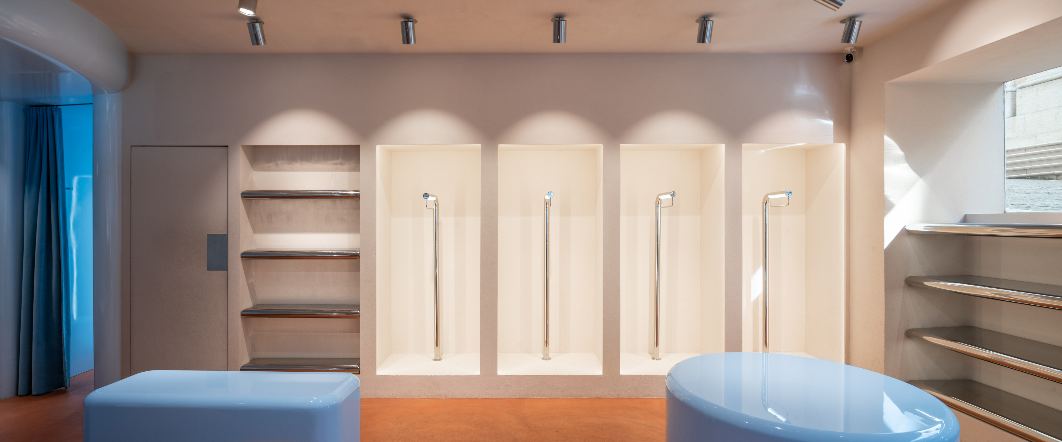 Premium outfits adorn the backdrop of the store, displayed on backlit showcases designed ad hoc in niche form to highlight the products. Additionally, within the store, El Departamento has created an oasis: an organic Krion structure with a friendly silhouette that delimits an exclusive reserved space. Inside, there is a sinuous velvet sofa that serves as a meeting point, as well as a fitting area with an almost celestial atmosphere enclosed by long blue curtains.