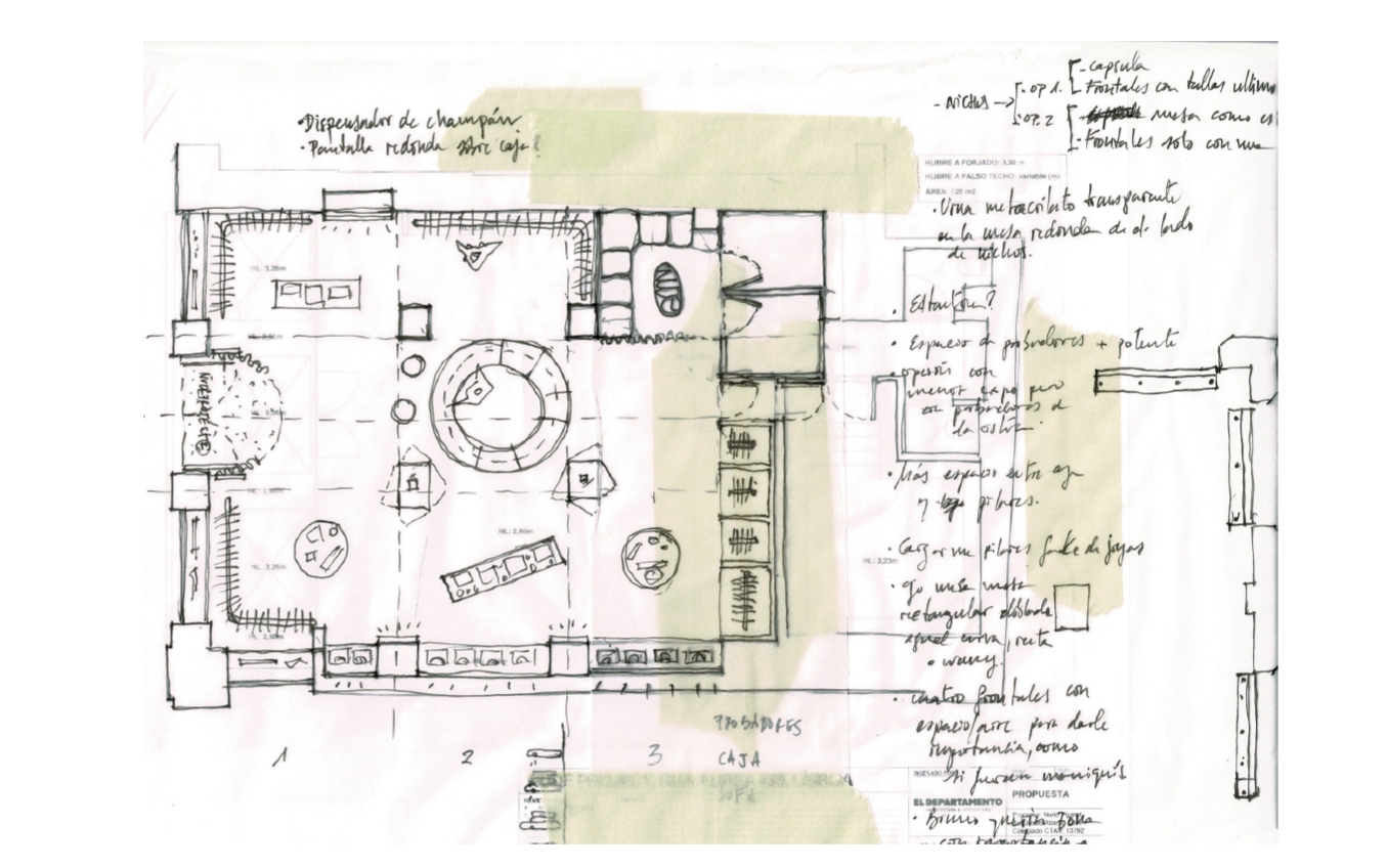 Inside, a nearly square, open-plan layout surprises visitors. Two pillars rise to disrupt its potential symmetry and draw the central axis of the space, aligned with the entrance, dividing the space into two distinct areas. The layout is articulated through a velvet-draped column that gains strength with two accessory displays dressed in the same fabric. In the middle of this central axis, a sculptural counter with gentle curves and a chocolate brown color stands as the centerpiece, topped by a large circular screen hovering above it.