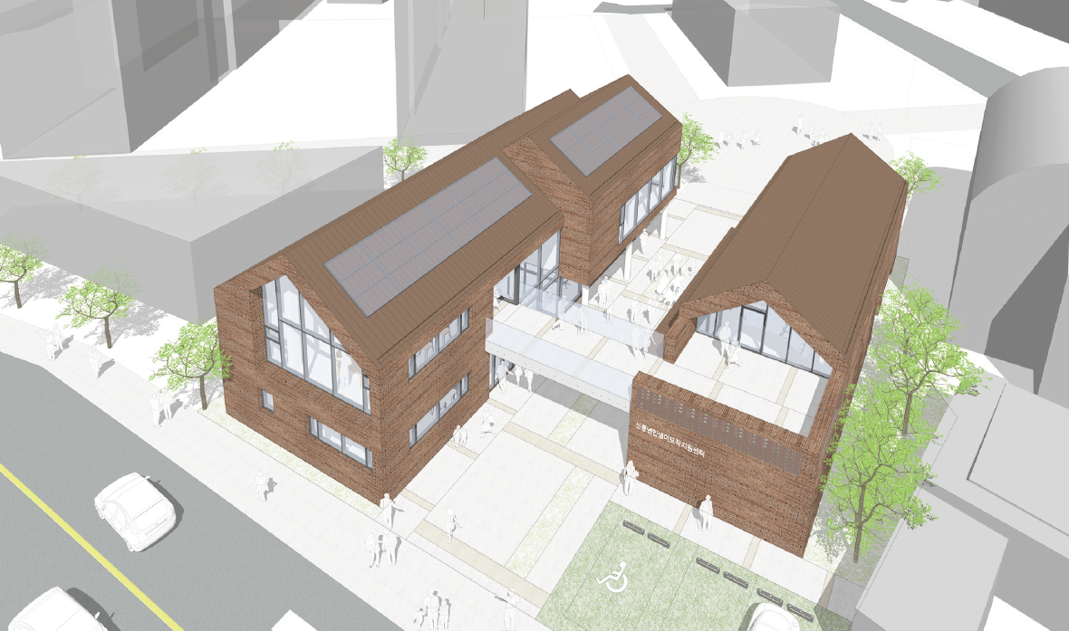 신중년 인생이모작지원센터는 새로운 인생 설계를 앞두고 있는 신중년 세대를 위한 배움과 만남, 지원의 공간으로 계획했다. 외관 디자인에는 마을과 어울리는 박공 지붕, 단순한 매스, 익숙한 재료인 벽돌을 사용해 신중년 세대가 친숙하게 다가갈 수 있도록 했다.