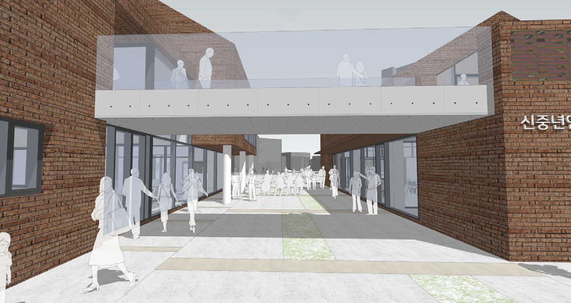 신중년 인생이모작지원센터는 새로운 인생 설계를 앞두고 있는 신중년 세대를 위한 배움과 만남, 지원의 공간으로 계획했다. 외관 디자인에는 마을과 어울리는 박공 지붕, 단순한 매스, 익숙한 재료인 벽돌을 사용해 신중년 세대가 친숙하게 다가갈 수 있도록 했다.