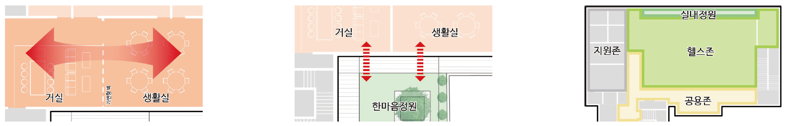 변경된 법규를 적용하여 바닥면적을 재산정하여 남는 면적을 공용 공간 확보에 사용하였다. 기존의 적은 공용 공간은 다양한 녹지의 이음과 함께 연계되어 사용자로 하여금 쉼과 편안함이 머무를 수 있는 복지관을 제안하였다.