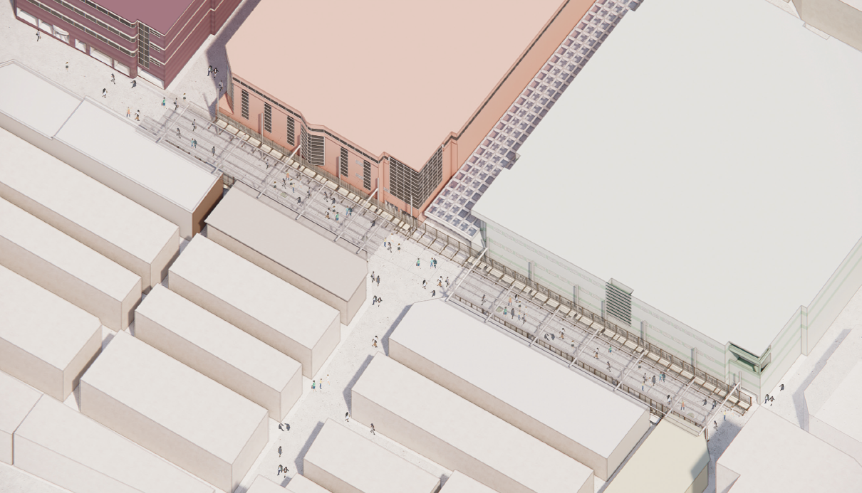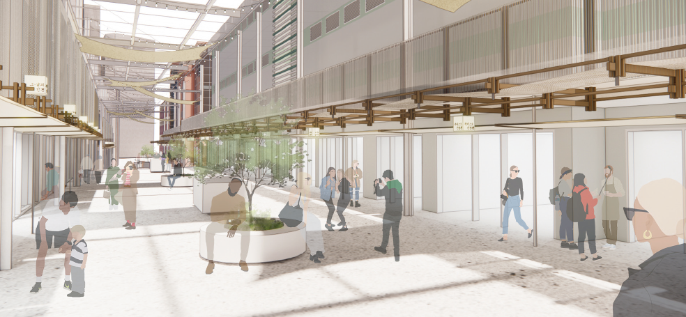 전통건축의 사이공간적 특성을 아케이드 형식에 녹여내고 시장에서 다루는 재료와 제조방식을 파사드에 드러내 전통시장의 정체성을 드러낸다.
