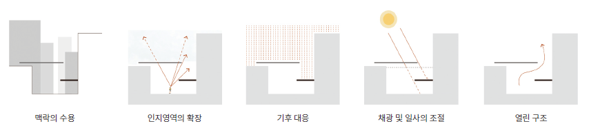 지붕의 레벨을 달리한다. 그 사이 비워진 공간은 차별화된 아케이드 거리환경을 만들어 낸다. 투명성을 가지는 소재로 시각의 연속성을 극대화한다. 이를 통해 영역은 가지나 완벽히 실내화되지 않은 반외부 공간을 구성해 자연과 주변 맥락을 하나의 경관으로 단절없이 연속시킨다. 기후에 대응하기 위한 하나의 큰 제스쳐를 취하는 방식을 통해 개입을 최소화하고 필요한 기능을 제한적으로 제시한다. 일사의 조절은 환경에 따라 사용자가 제어할 수 있는 가장 가벼운 방식으로 구성한다. 큰처마와 작은처마의 대비되는 형식은 가로를 하나의 거대한 영역으로 재구성하여 선형의 공간을 가로광장으로 면형 공간화한다. 이를 위해 가장 개방된 형태의 지붕구조를 취하고 가볍고 다루기 쉬운 소재를 선정한다.