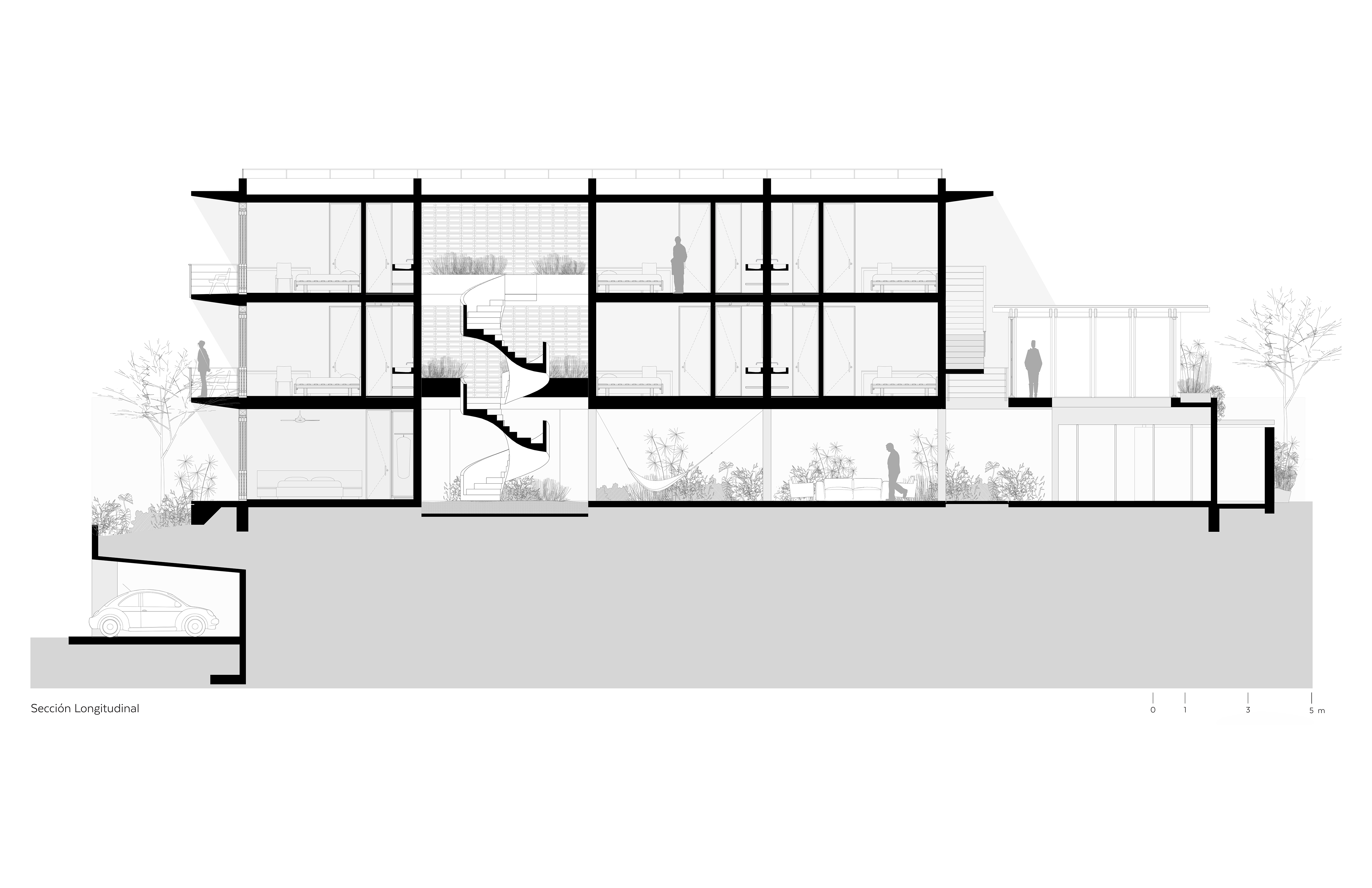 The third volume is a rectangular prism with an open, social ground floor and two upper levels of rooms, all connected by a large helicoidal staircase made of reinforced concrete. The ground floor functions as a shaded extension of the gardens and pool area, allowing guests to escape the midday heat without resorting to air conditioning.