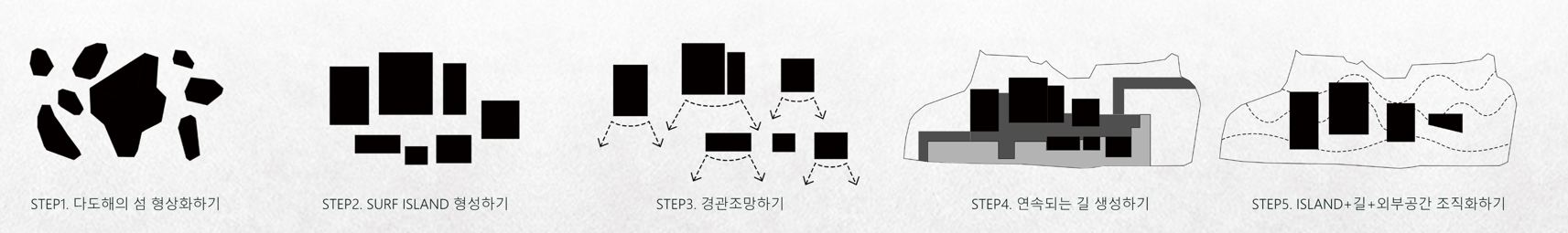 섬 사이로 생겨나는 입체적 정원은 다양한 풍경과 프로그램을 제안하고 자연경관을 받아들이는 역할을 한다. 건물과 건물사이의 길들은 산책로가 되고 길은 외부공간으로 확장되고 연결되어 상호작용하며 조화를 이룬다.유기적으로 조직화된 공간은 기존의 해수욕장 풍경을 조응하고 그 형상을 담아 파도가 대지까지 들이치는 듯한 모습이기도 하다. 관광객들이 ' SURF ISLAND ' 로 방문하는 자체가 파도 안으로 들어와 함께 서핑을 하는 기분이다.진입부로부터 연결되는 프로그램의 흐름은 방문객의 동선을 자연스럽게 유도하고, 건물로 관입되는 외부공간을 통해 내부로 진입하면 서핑을 하며 빼어난 바다의 경관을 조망하게 된다.