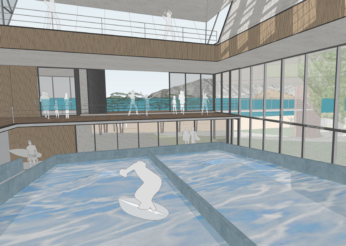 새로이 생기는 이 ‘섬’은 기존의 땅에 조응하고 랜드마크적인 입체적 볼륨과 풍경이 되어 대지로 스며든다. 잠자고 있던 땅을 작동시키듯 추가로 제안하는 프로그램들은 단순한 서핑스테이션의 역할을 넘어 복합문화공간으로 활성화된다.
