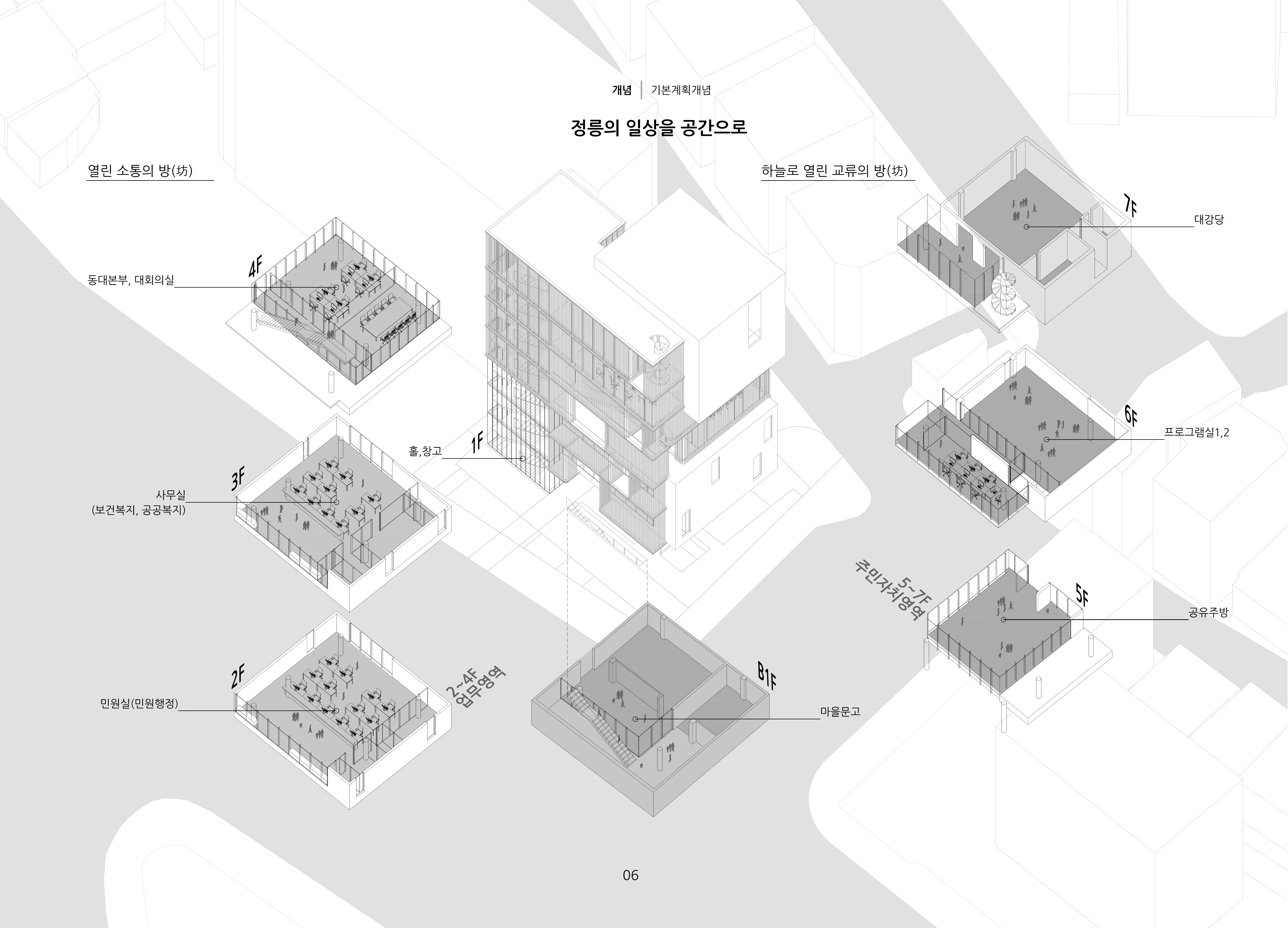 기존 청사는 오랫동안 정릉 주민과 관계를 맺어 왔지만 주민들을 위한 공간은 턱없이 부족했다. 이 자리에 들어설 정릉다방은 정릉주민의 발길을 모으고 보다 오래 머물게 만드는 다양한 방들이 존재한다. 정릉다방의 방들은 비워지고 채워지며 일상공간과 비일상공간의 조화를 이루는 공공의 터가 된다. 이중 외피로 은은하게 드러낸 건물의 정면은 호기심을 자극하고, 외피 속 적층된 수직정원은 도시를 향해 열려 주민들에게 새로운 풍경을 제공한다. 정릉다방은 일부러 시간을 내어 방문하는 장소가 되기보다는 정릉2동 도시의 흐름 속에 녹아있는 공간이 되어 정릉의 소중한 일상을 품는 장소가 된다.