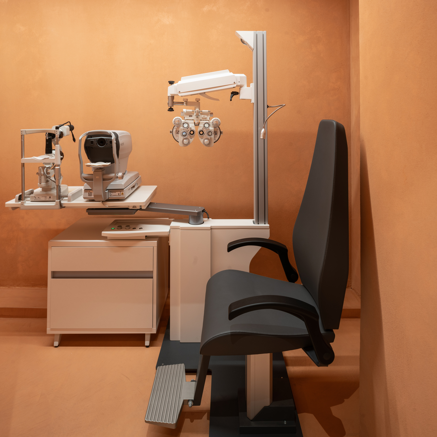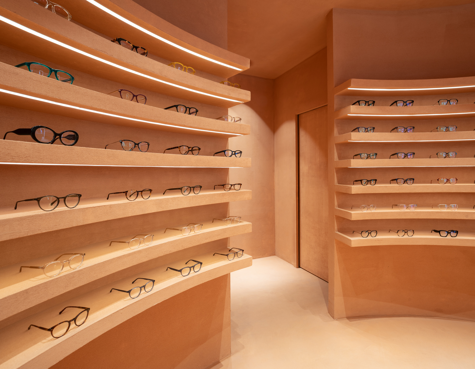 instruments are located. Curved walls are adorned with shelves of varying heights, illuminated with LED strips that serve as displays for the eyewear collection.