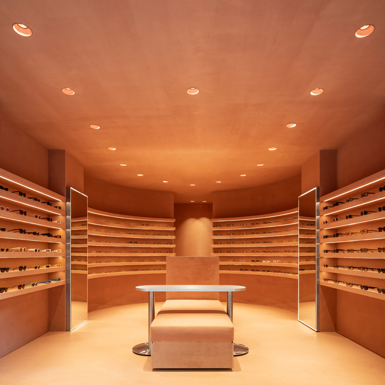 instruments are located. Curved walls are adorned with shelves of varying heights, illuminated with LED strips that serve as displays for the eyewear collection.