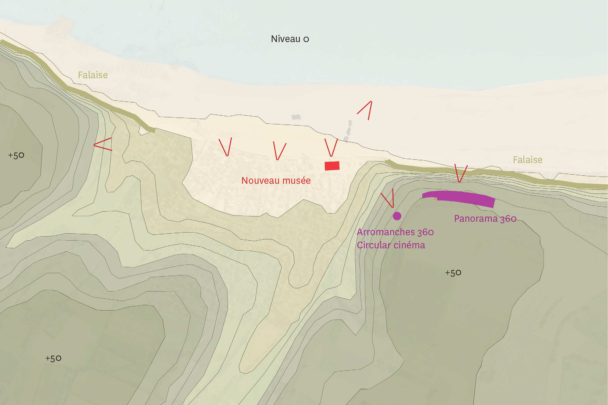 The D-Day Museum in Arromanches was the first museum created on this theme in the aftermath of the Second World War. A new page in the museum's history was written in 2024 with the opening of the new building designed by Projectiles. This landscape-museum is imagined as a “ whole ” belonging to a much vaster museum system stretching from east to west (from cliff to cliff) and from north to south (the horizon of the village).