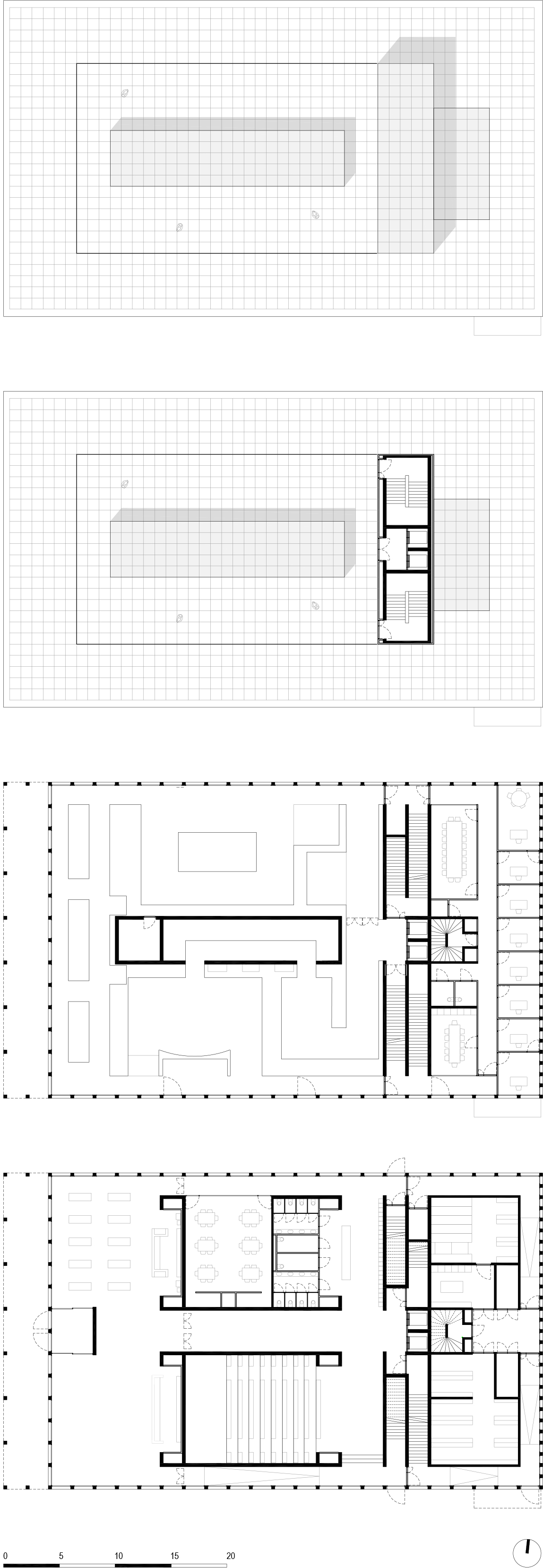 1층의 공공 공간과 광장, 거리는 박물관까지 이어져있다. 1층의 작품들과 카드, 사물이 풍경과 서로 잘 어울린다. 지붕으로 이어진 구조물과 파사드, 갤러리 벽과 투영이 사라지고 대체적으로 부지와 대조를 이룬다.