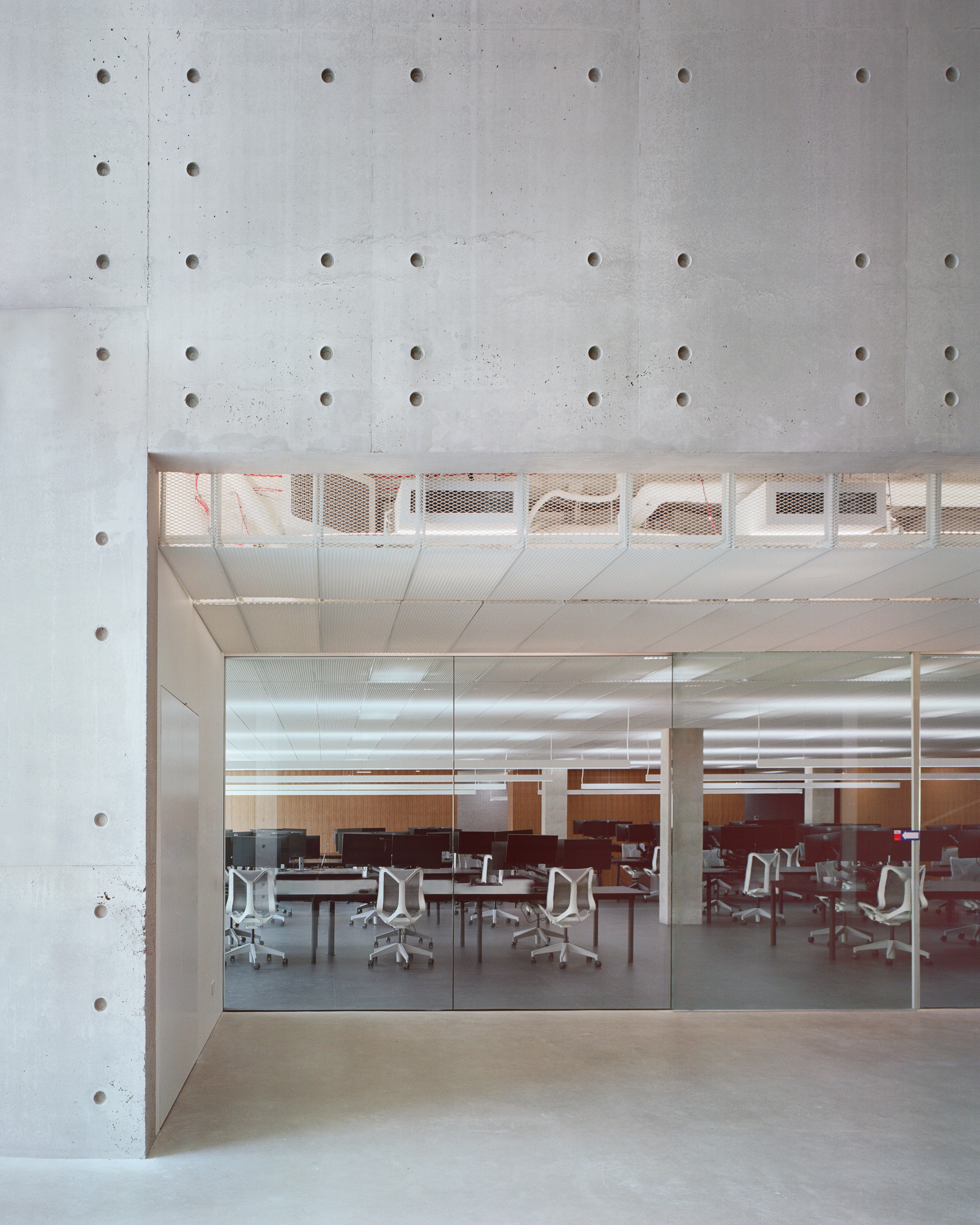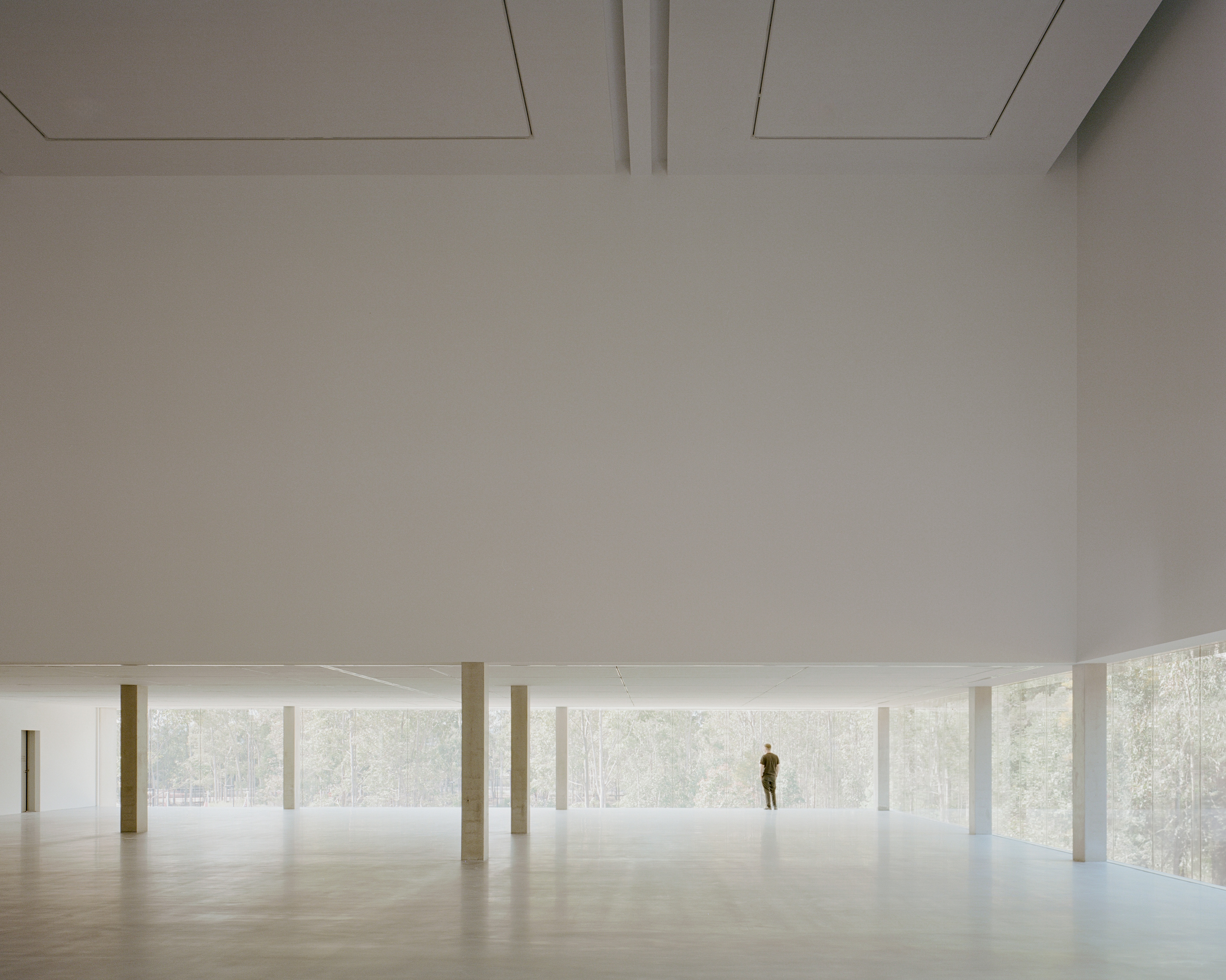 The material palette throughout is minimal and elemental, with the raw expression of materials on display to showcase their natural properties – including mill finish aluminium, off-form concrete walls and polished concrete floors. The colour palette continues the cool tonal range from white, through greys to black.