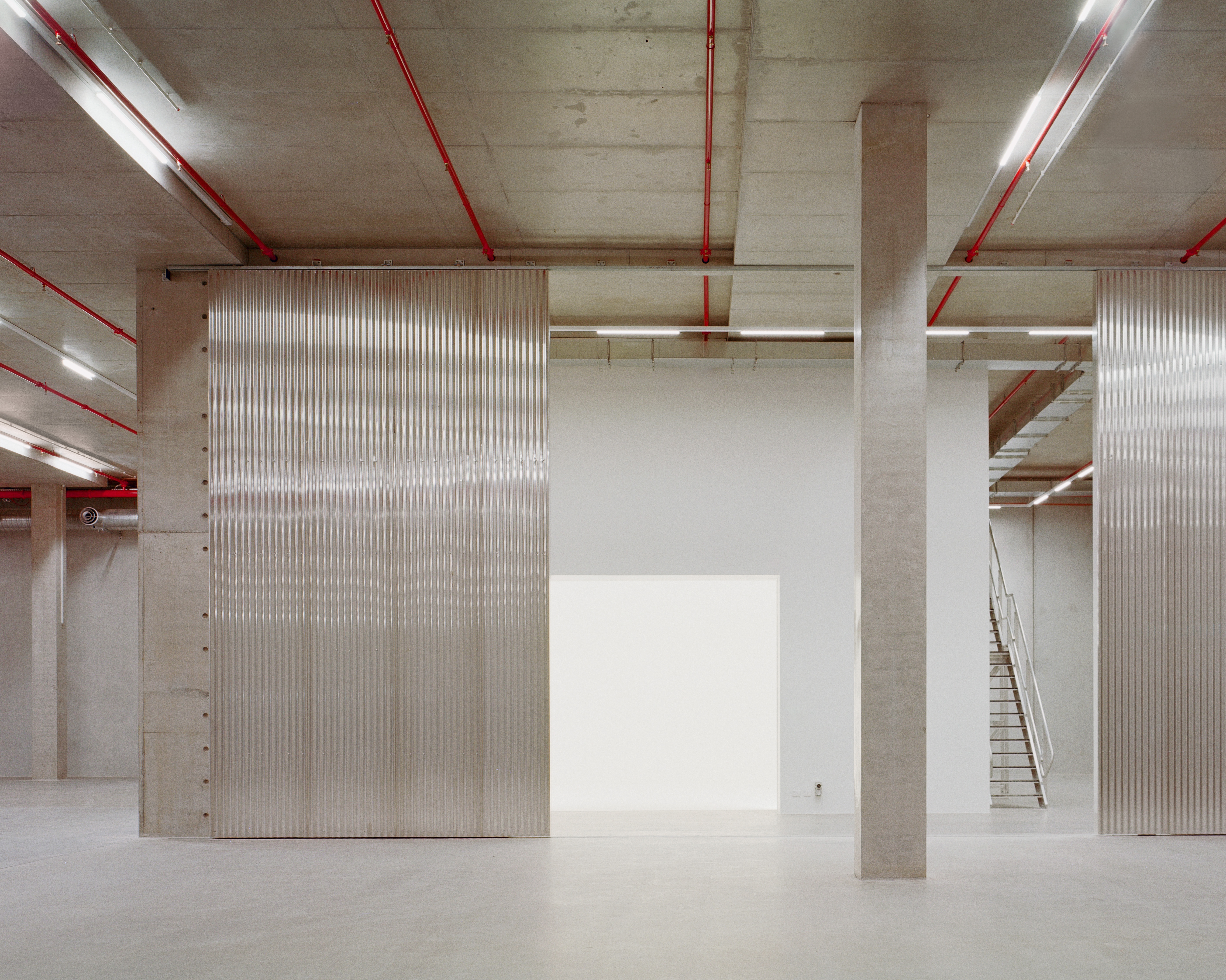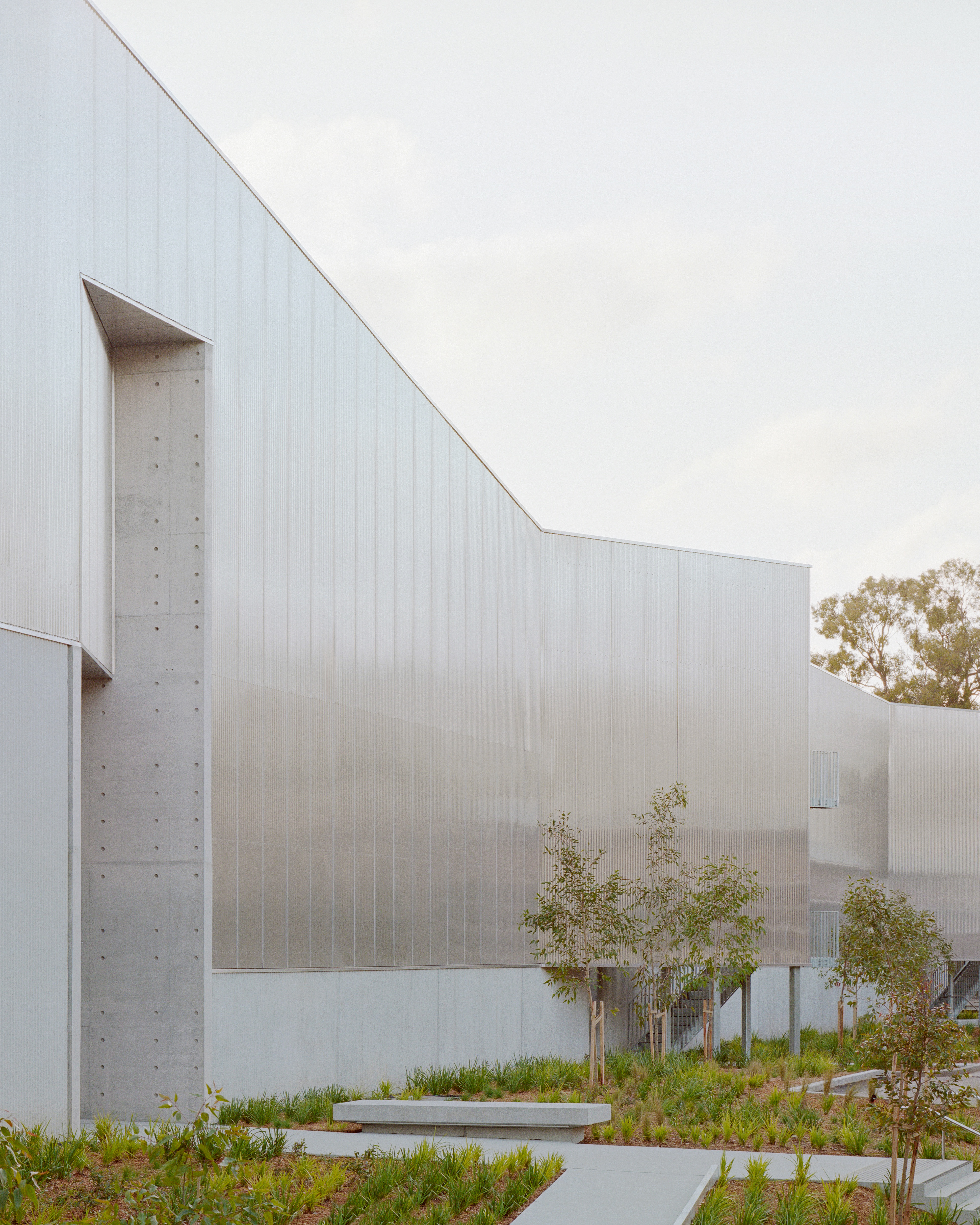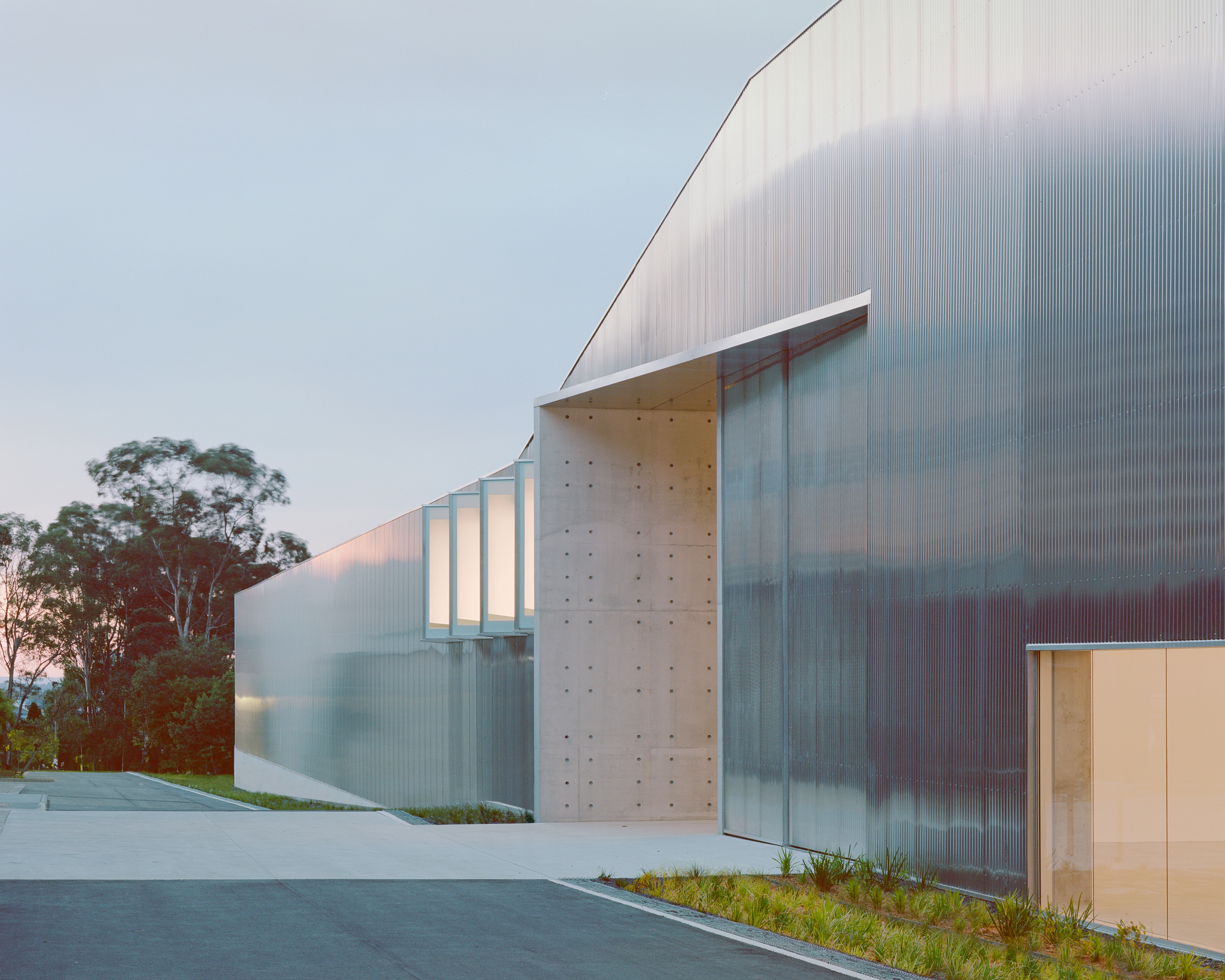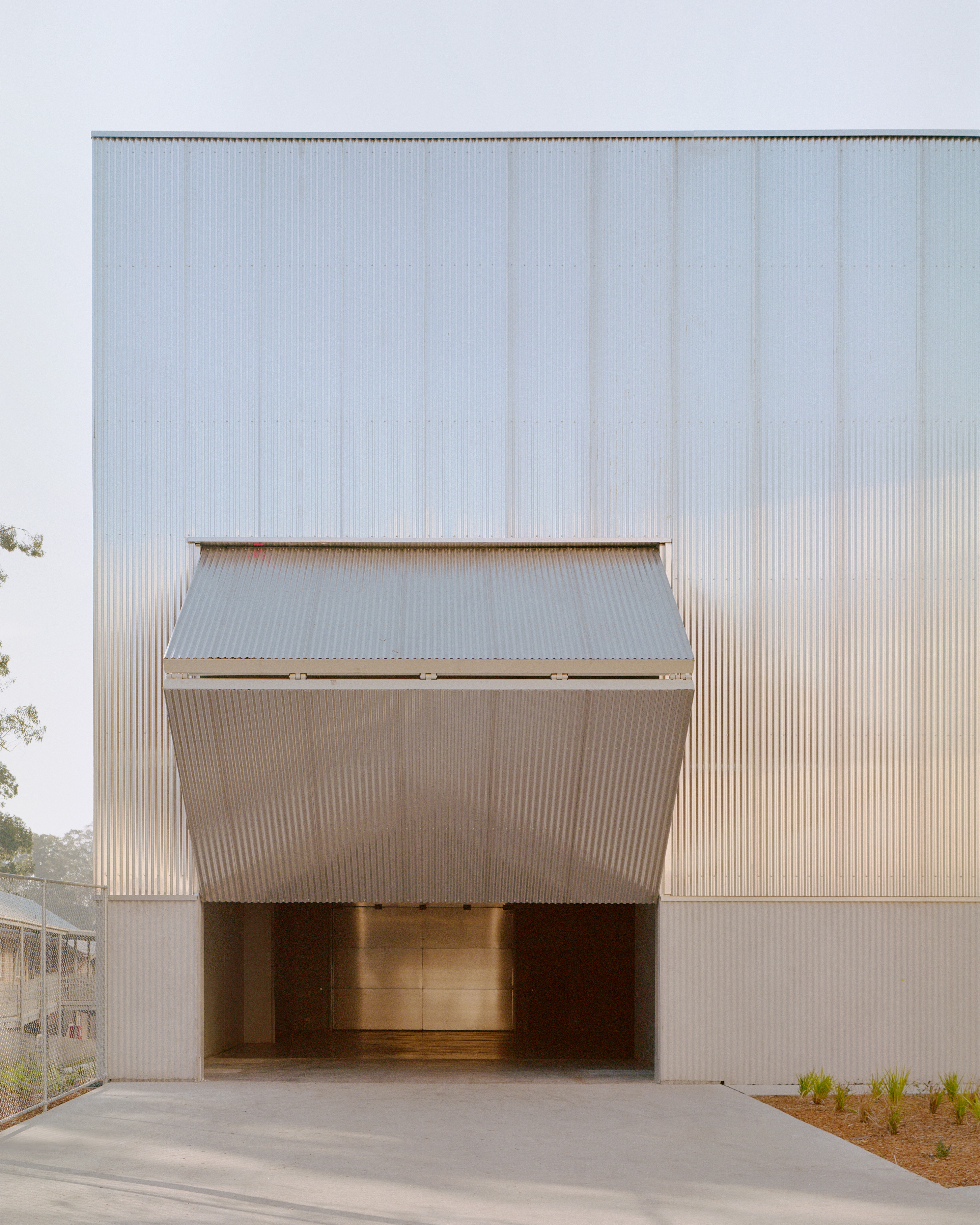 The corrugated aluminium skin provides a singular utilitarian expression in the tradition of the industrial shed. It sits atop a corrugated precast concrete base that protects the aluminium from on-site vehicle movements. Openings within the aluminium skin are formed with folds in and out that respond to the activities within.