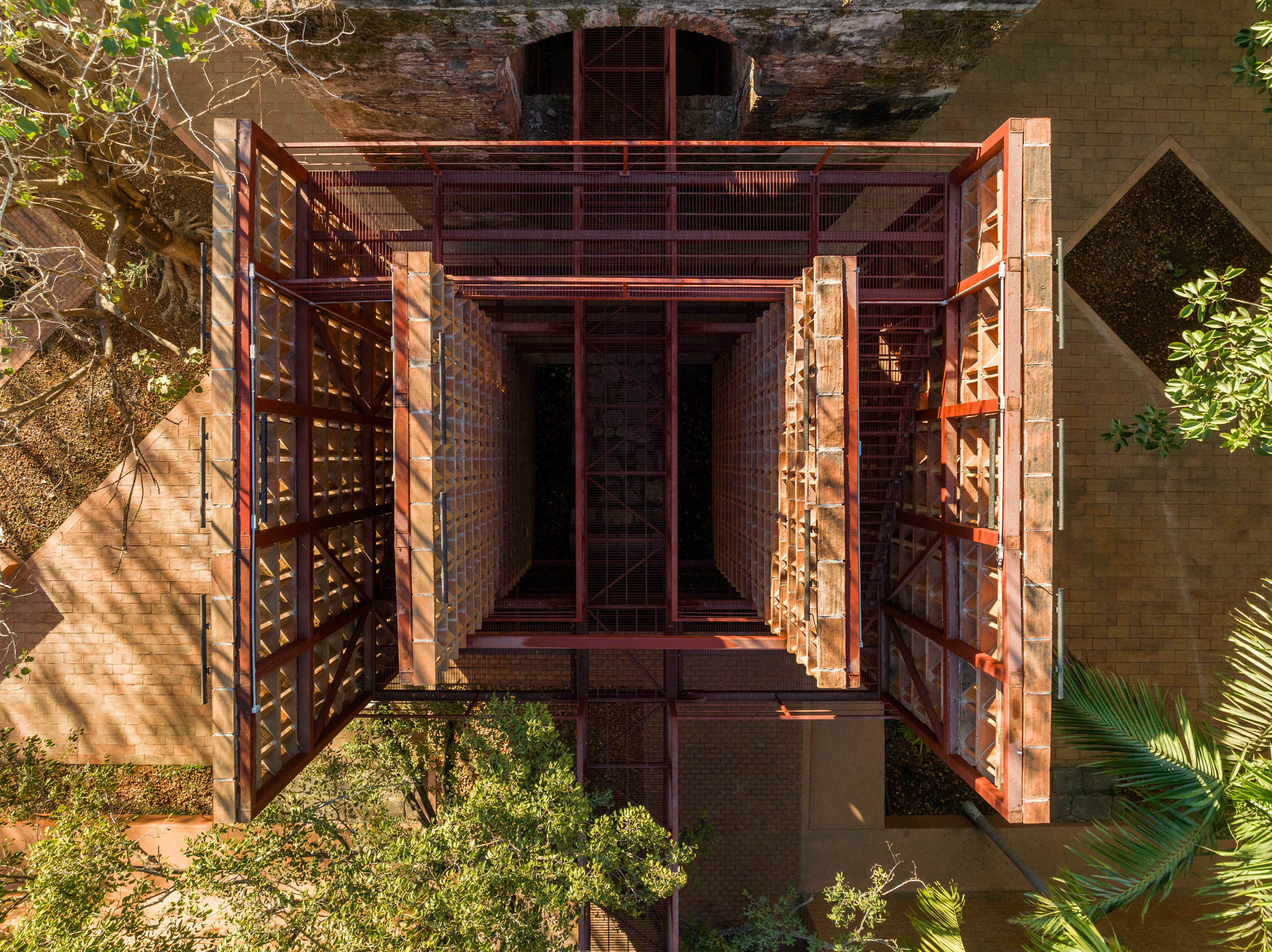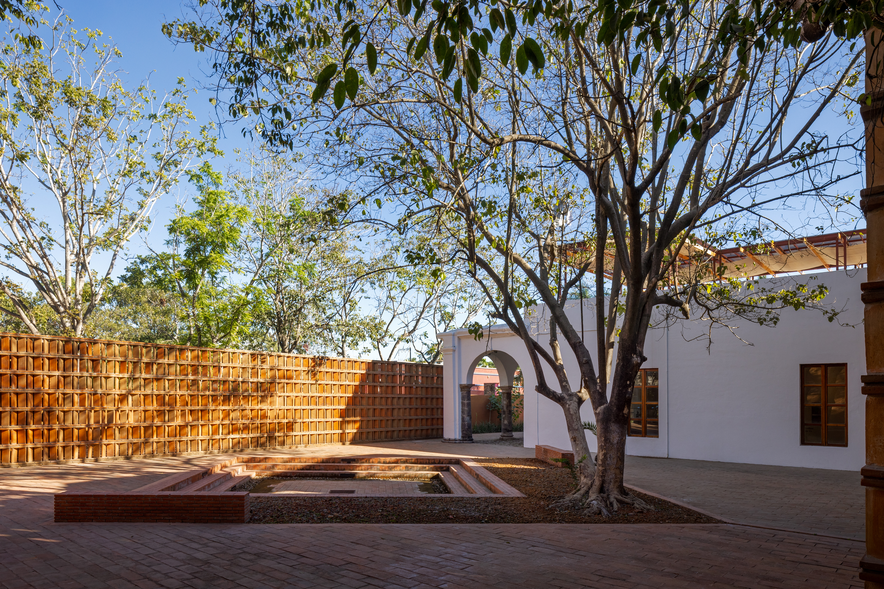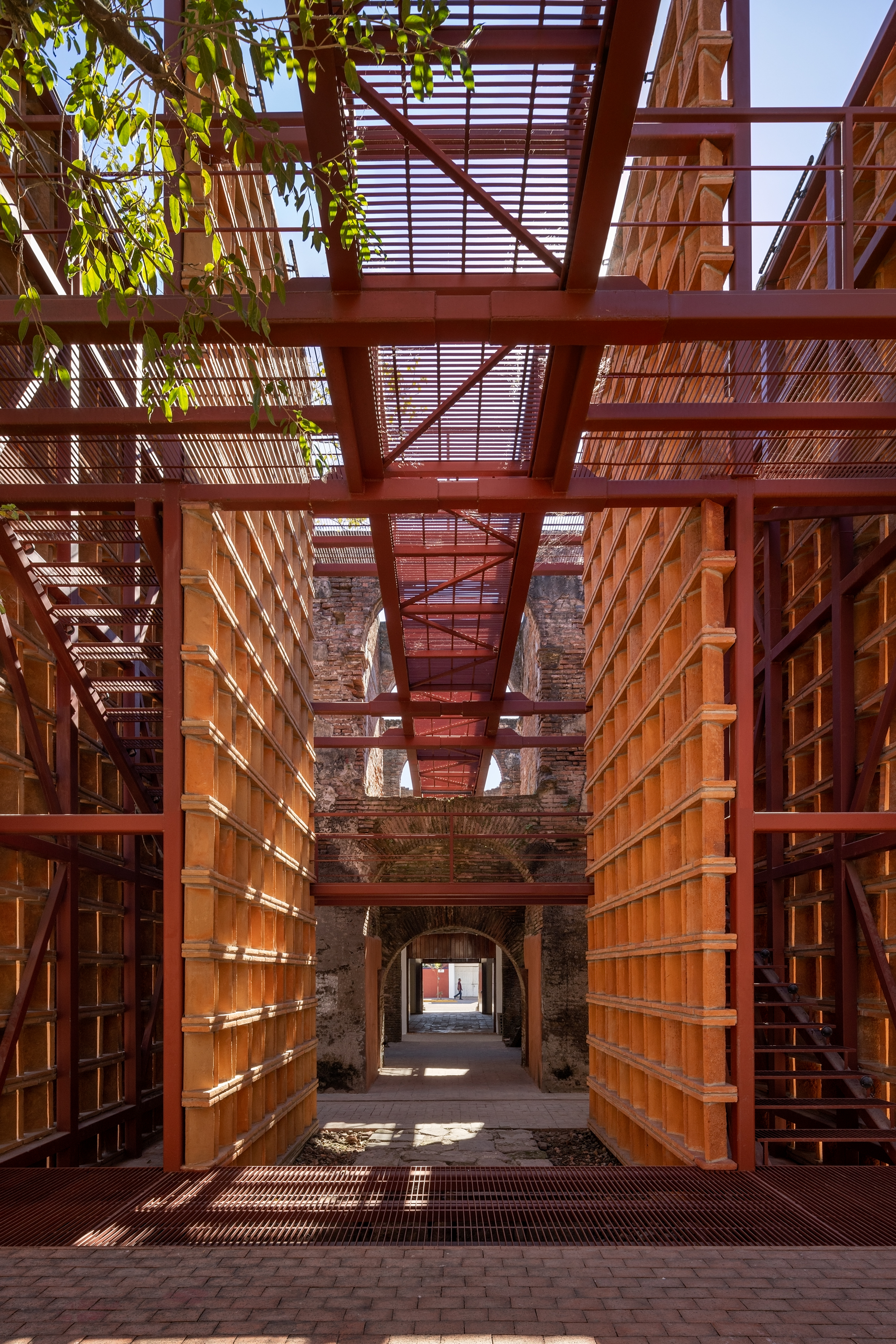 The heart of the courtyards is inhabited by an industrial-style bridge, a viewing platform and vertical walkway that allows visitors to reach the rooftop of the historic building and the rooftop of the workshops. In addition, there is an outdoor forum shaped like a Sikuli, a Huichol structure that represents the composition of the universe and the connection between human beings, nature, and the universe.