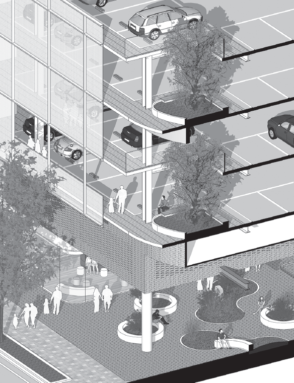 주차구역과 보행통로를 분리하여 안전한 보행환경을 구축하여 일차적으로 이용자의 안전을 확보하는 동시에, 이용자가 보행로를 걸어가면서 외부경관을 조망할 수 있도록 계획하고, 외부에서는 자동차가 아니라 사람이 움직이는 모습이 주차장의 입면으로써 도시적 경관을 이루고자 하였다.