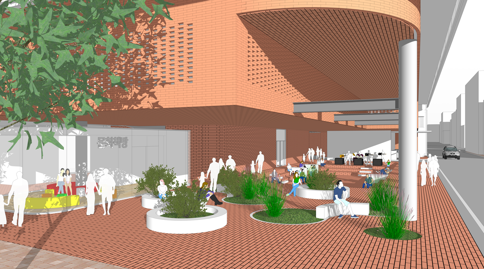 공공건축물로써 주변지역에 대한 공간적이고 경관적인 조화를 고려하여 문화의 거리 활성화의 거점이 되는 복합 문화-휴식 공간을 조성했다. 1층 대부분의 영역을 보행자 공간으로 확보하여 밝고 안전한 외부공간을 계획하고, 이를 통해 주변 가로와의 경계없이 모든 방향에서 시민들의 접근이 가능하여 문화의 거리가 주차장으로 확장되어 다양한 이벤트와 함께 휴게기능을 겸할 수 있도록 계획하였다.