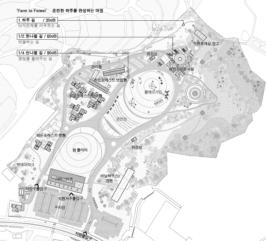 Farm&Forest 타운은 이용하는 사람들에게 휴식의 배경이 되는 바라며, 시골의 작은 마을로 계획하고자 하였다. 방문객의 단편적인 목적의 방문이 아닌, 하루를 온전히 머무를 수 있는 장소를 목표로 ‘하루를 지내는 마을’, ‘이야기가 있는 마을’, ‘오래도록 기억되는 마을’의 이미지를 만들고자 하였다. 자연환경과 주어진 프로그램을 고려한 성격이 다른 3개의 길은 Farm&Forest 타운을 하나의 유기적인 마을로 연결한다. 마을을 이루는 각각의 건축물들은 그 기능에 맞는 다양한 공간 경험을 제공하면서 다양한 건축적 장치를 통해 조화로운 마을의 분위기를 만든다. 마을의 곳곳을 연결하는 길의 흐름은 자연의 색을 가지는 포장재료를 사용하였으며, 그 길을 따라 곳곳에 영역성을 만드는 담장은 돌담으로 계획하여 마을의 전체적인 분위기를 만든다. 건축물의 형식은 확장성과 가변성을 고려한 모듈화된 구조형식을 제안하고, 목구조를 재해석한 구축 방식을 통해 과거 농촌 마을에서 연상되는 장소의 서정적 경험을 계획하고자 하였다. 파머스마켓은 Farm&Forest 타운의 중심 장소로서 판매, 휴식, 행사, 방문자 관리의 다양한 역할을 수행해야 한다. 도로에서 타운을 인지하게 하는 주요 건물이며, 타운의 첫인상이 된다. ‘농장’ + ‘숲’ 이 가지는 서정적 이미지를 가지는 건축 이미지를 부여하고자 하였다. 파머스 마켓의 공간은 ‘시장’의 개념을 모티브로 하여 다양한 행사를 수용하도록 통합 공간으로 제안하였다. 저층부는 광장과 연결하여 내·외부 공간에서 시장의 기능이 가능하도록 하였다. 반외부 공간을 이용한 별도의 방문자 센터와 화장실을 두어 방문자 동선과 이용자 동선을 분리하였다. 방문자 센터는 ‘집 속의 집’ 개념으로 인지성을 극대화하였다. 히든포레스트 빌리지는 단독으로 독립된 집이 아닌, 숲속 길에 놓인 하나의 마을이다. 각 동을 클러스터화시켜 독립적인 중정 마당을 배치하였다. 각 중정은 빌리지의 성격에 맞는 다양한 행위를 담게 된다. 반려동물의 놀이 공간, 어린이&노인을 위한 특화 외부 공간, 가족 모임, 회사 모임 등의 다양한 성격에 맞는 프로그램 개발이 가능하다. 주차를 위한 차량 동선은 타운의 보행 동선과 최대한 분리 시키고, 단지 내에서 주차의 모습을 보여주지 않도록 계획하여 보행 친화적인 마을 공간을 조성하였다.