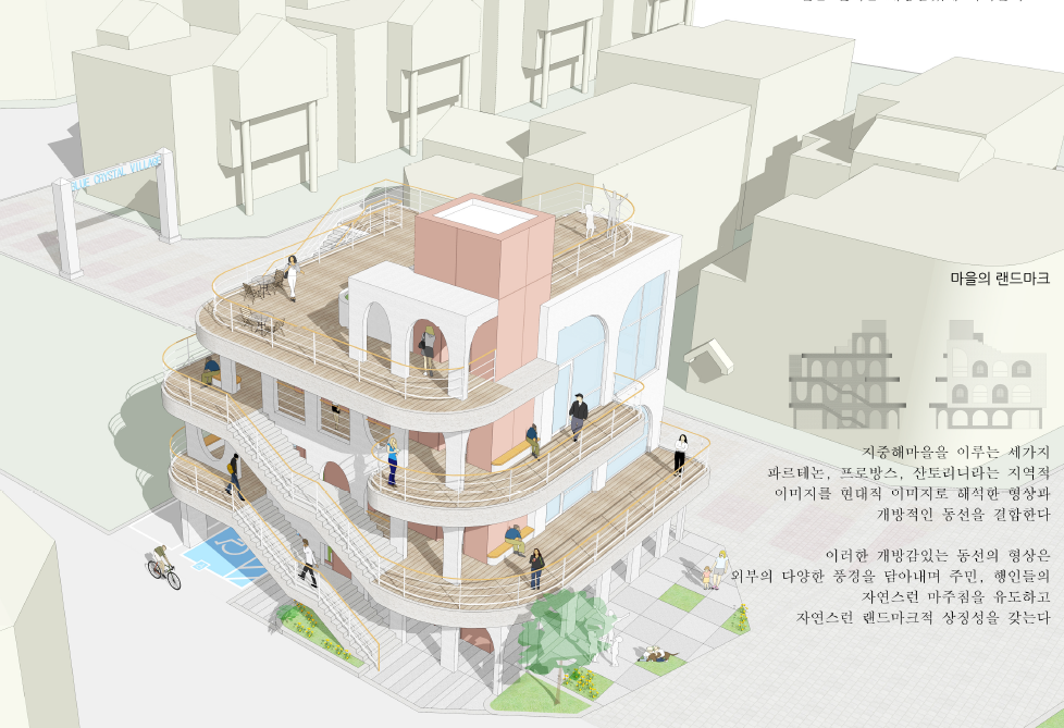아산의 지중해 마을이라는 관광지에 들어설 이 공모의 중요 과제중 하나는 가변성을 고려한 계획이다. 관광지로서 포용할 수 있는 공간, 주민들의 자치편의 공간 등 필요에 따라 변하는 공간의 가변성이다.우리는 공간의 가변성과 더불어 지역주민과 관광객들의 자유로운 접근을 포용 할 수 있는 개방의 공간을 제안한다. 공공의 건축으로서 좀더 열린 자세와 메인 상권 거리방향으로 후퇴된 공간의 영역을 모든 사람에게 내어줌으로서 좀 더 편안한 접근을 유도 하였다.