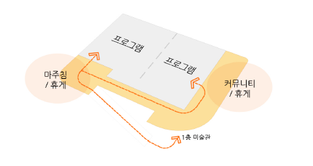 또한 관광지라는 동선의 흐름을 고려하여 그 동선의 연속성을 공간과 결합하였다.프로그램은 외부동선을 따라 자연스레 연결하였다. 층별 프로그램을 감싸고 있는 외부 동선이자 공간은 마주침의 공간이자 풍경을 담아내는 갤러리가 된다.