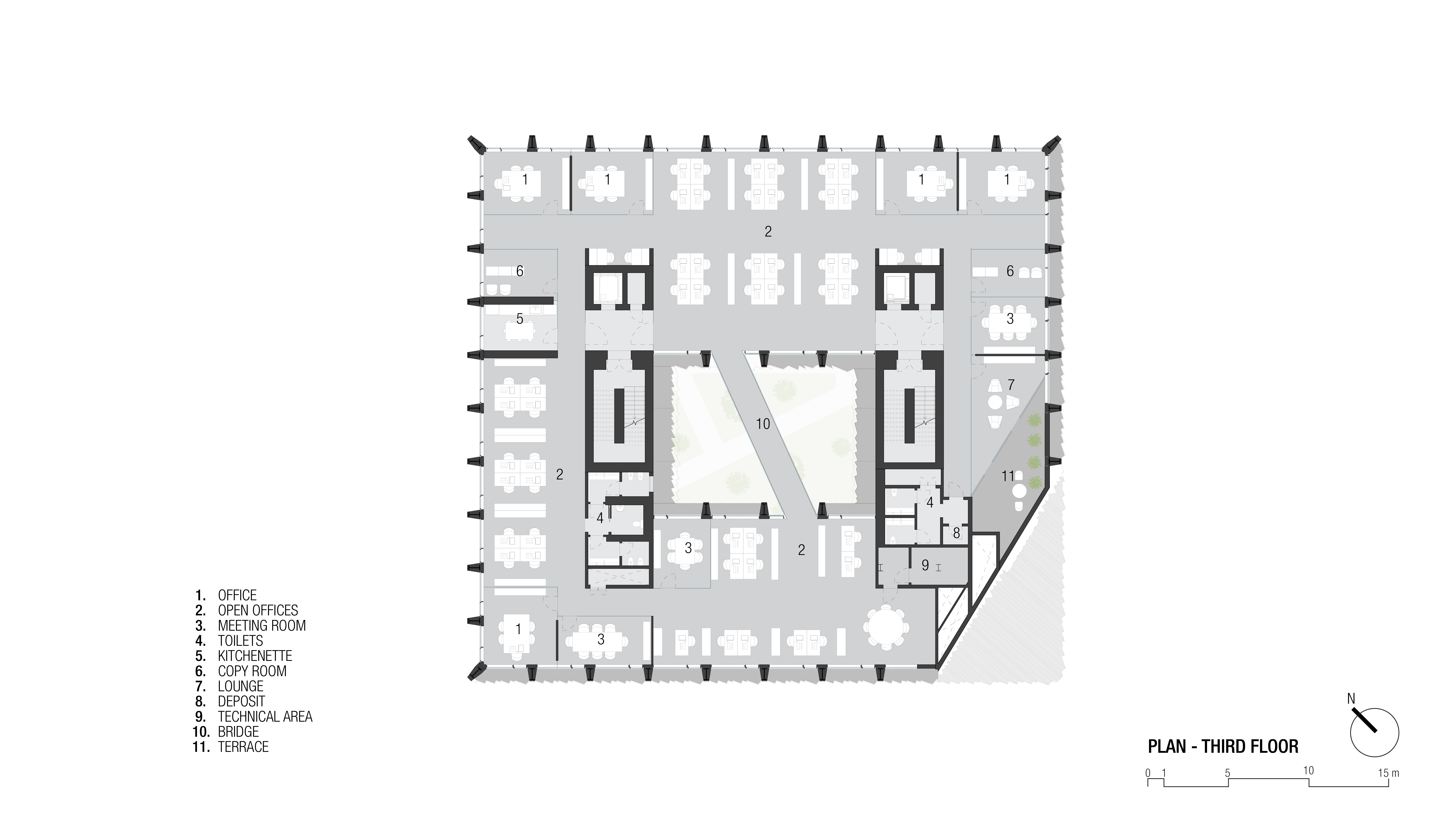 The new HQ is conceived as NZEB (nearly Zero Energy Building) and features geothermal heat pumps and radiant ceilings to further save energy and obtain additional internal comfort. It stands out as a recognizable landmark that both rises above and integrates itself with the surroundings a radical approach towards sustainability with intelligent geometry.