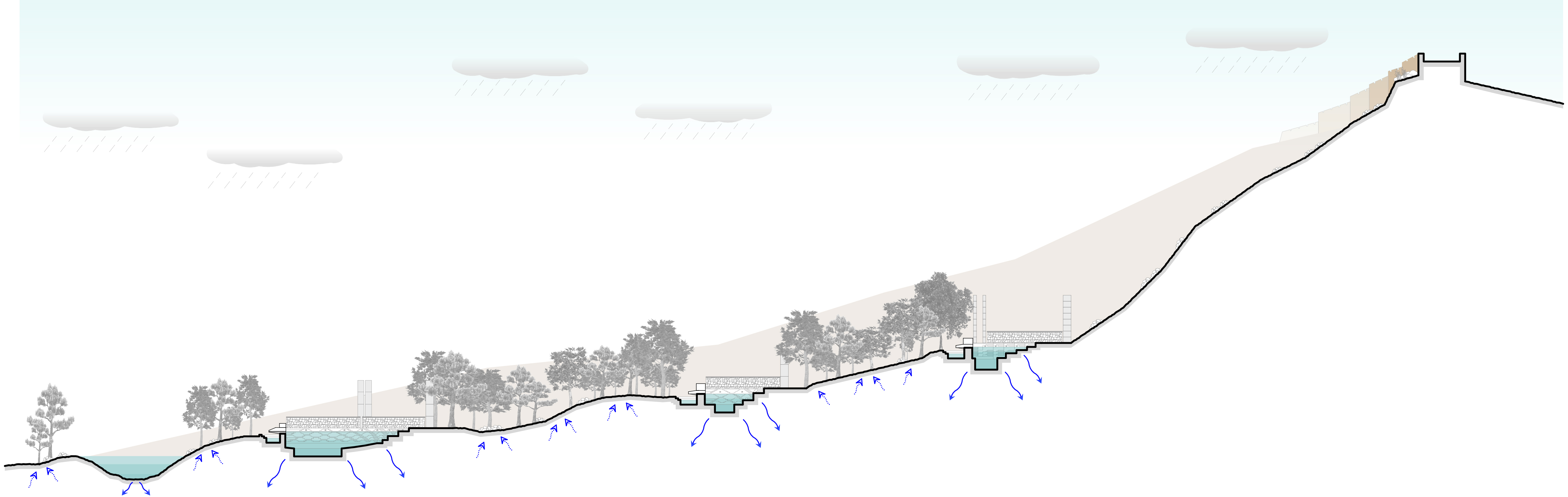 The proposal replaces the trees with water, the nurturing source of all growth, as the primary symbol. The memorial and landscape encapsulate 50 recharge reservoirs that irrigate 150 acres of planted dense vegetation. In so doing, they will nourish forestation and give birth to an ecological transformation.