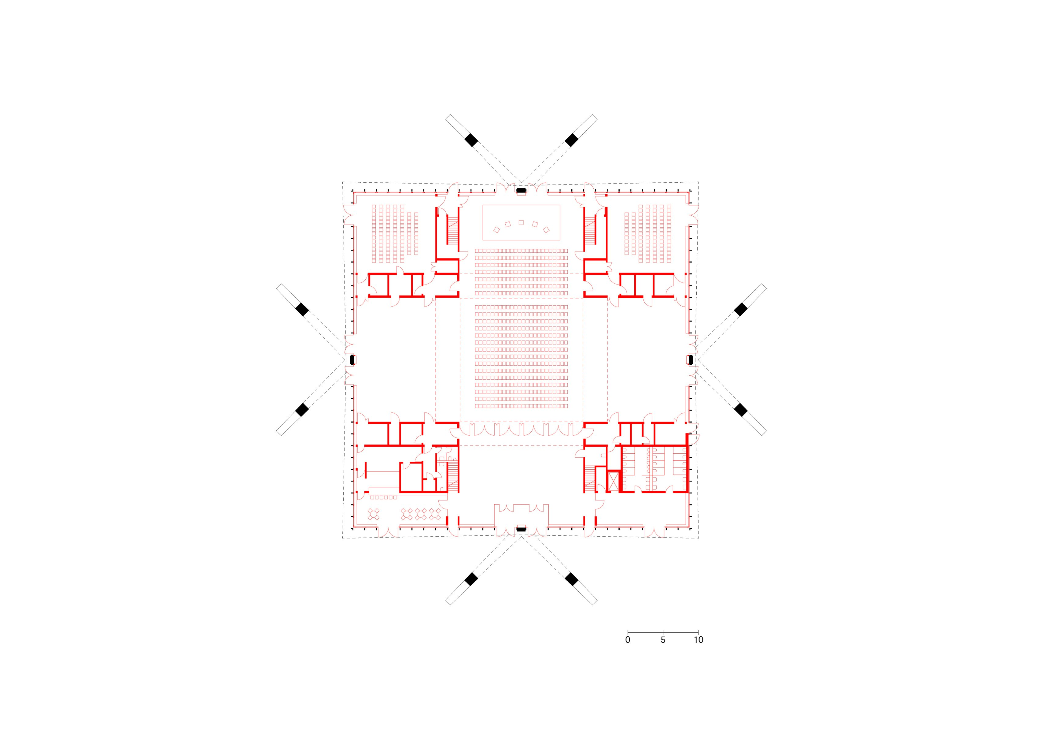 The new structures inside the hall, which follow Müther’s square grid design, enhance the experience of the open space beneath the curved roof. In order to create the detailed room schedule requested by the by the authorities of the state capital of Magdeburg, the design includes four cubes in the corners of the hall, each with a floor area of 15 x 15 meters. The galleries on these cubes are linked by bridges. The flexibly usable layout creates smaller rooms that can be combined for events, seminars, exhibitions, and eateries, accommodating up to 500 people in the center of the hall.