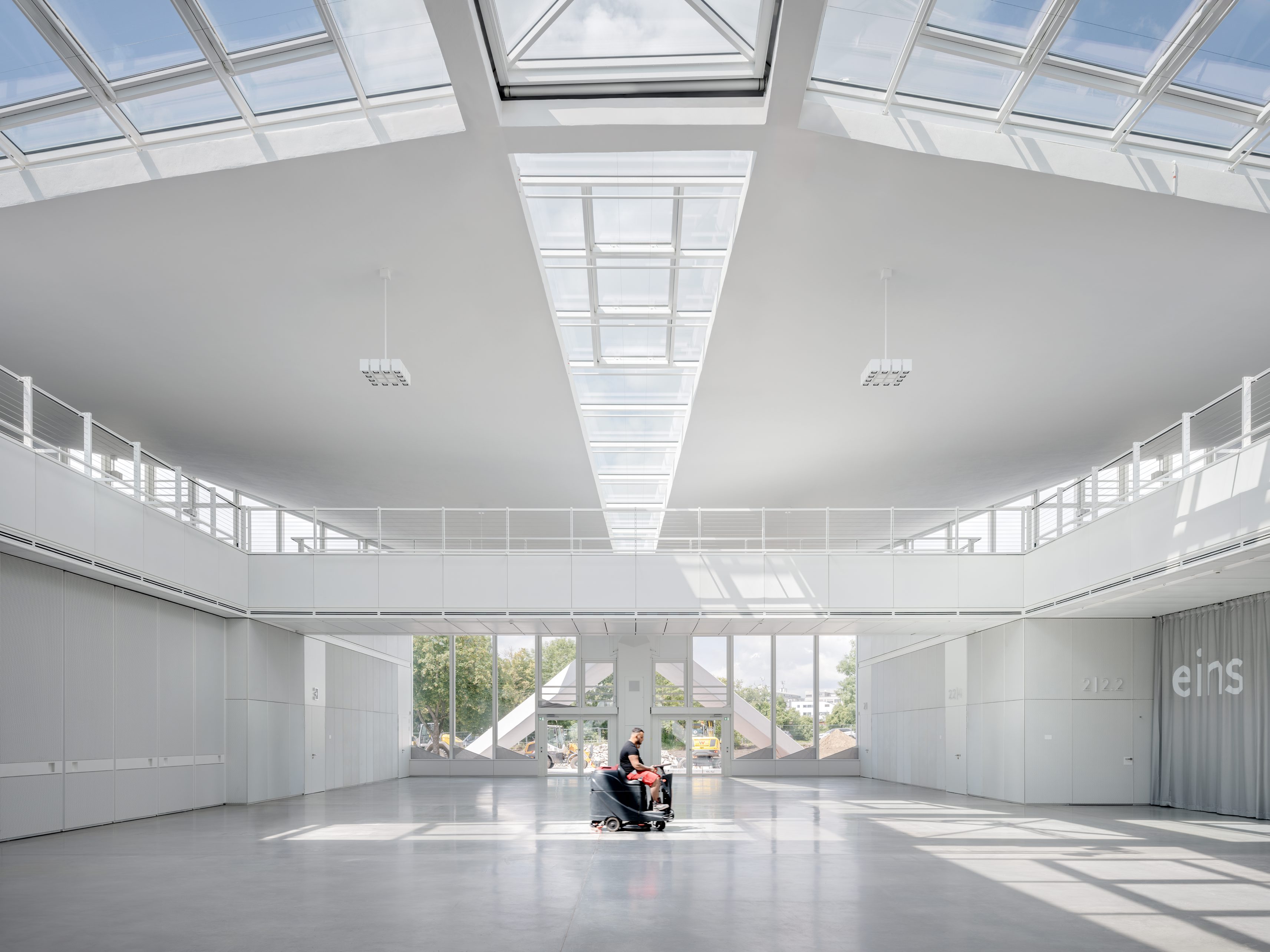 The concrete shells were repaired and upgraded using carbon reinforced concrete, thereby not only restoring the structural strength of the roof but also increasing it. Additionally, the rooflights running between the shells were reopened. These were originally filled with glass bricks but were closed shortly after the building’s completion due to leakages.