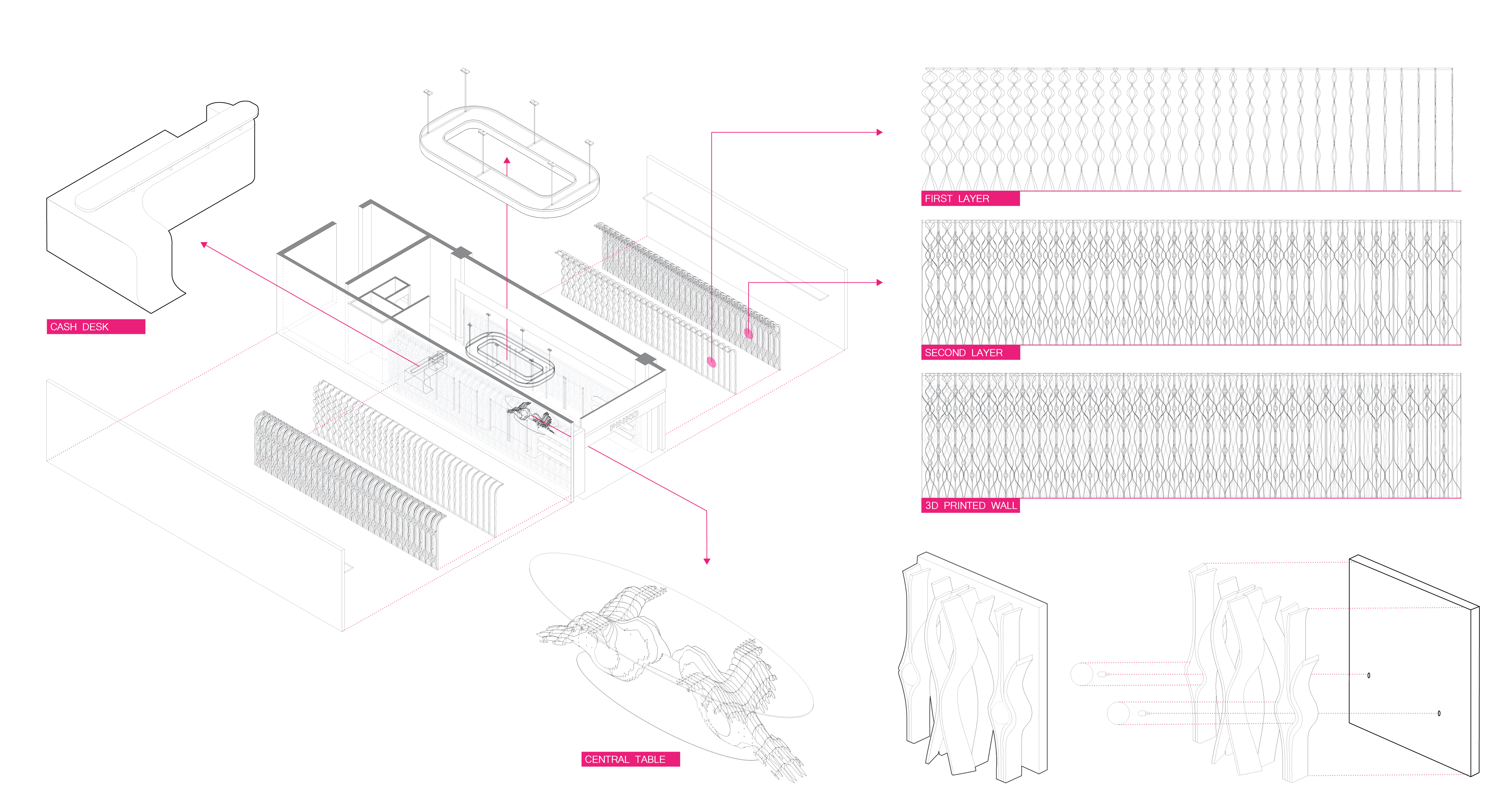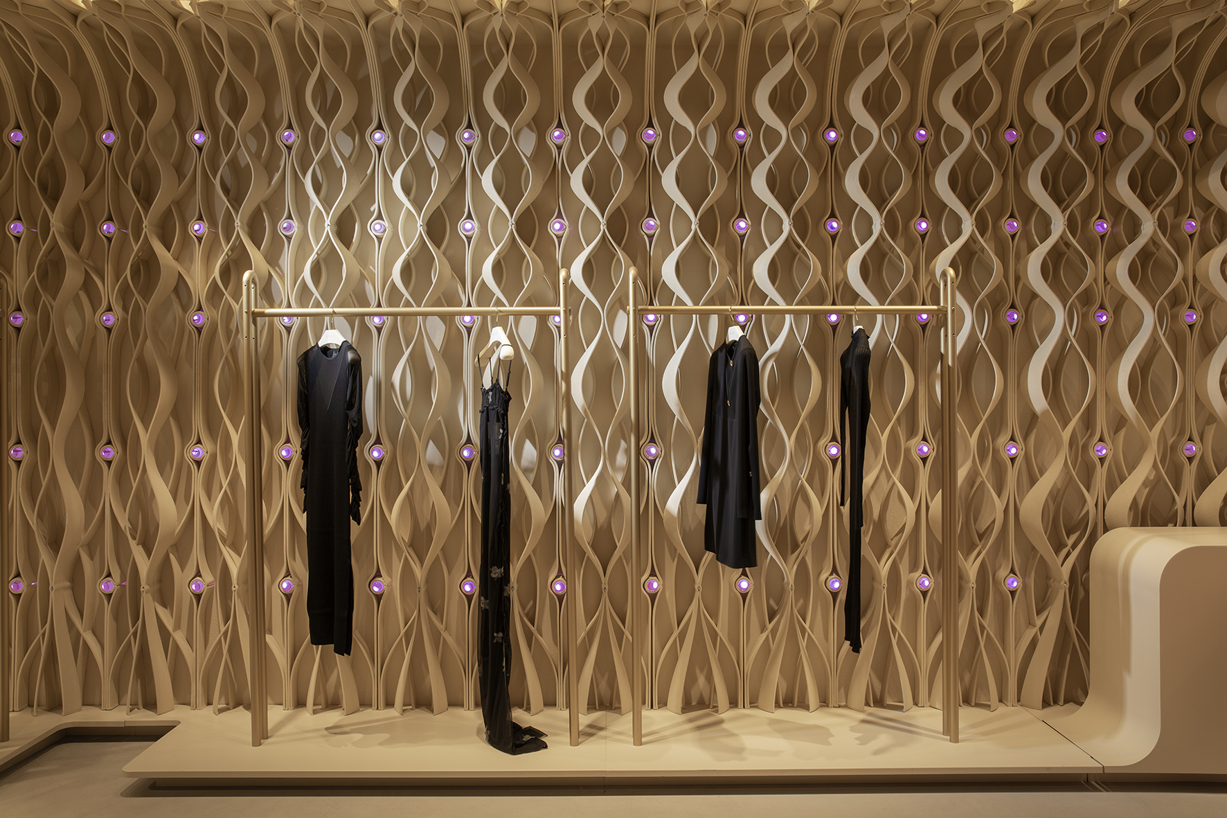 Under the vision of Carmelo Zappulla and his team, this metaphor is reinvented and translated through the use of the latest computational tools into an intricate skin that envelops the shop, made through 3D printing. The arrangement of this skin as a cladding follows a sequence that is composed from two layers of overlapping ‘threads’, going from an initial simple and linear arrangement to then transforming into sinuous and complex patterns that give depth and textural richness to the space.