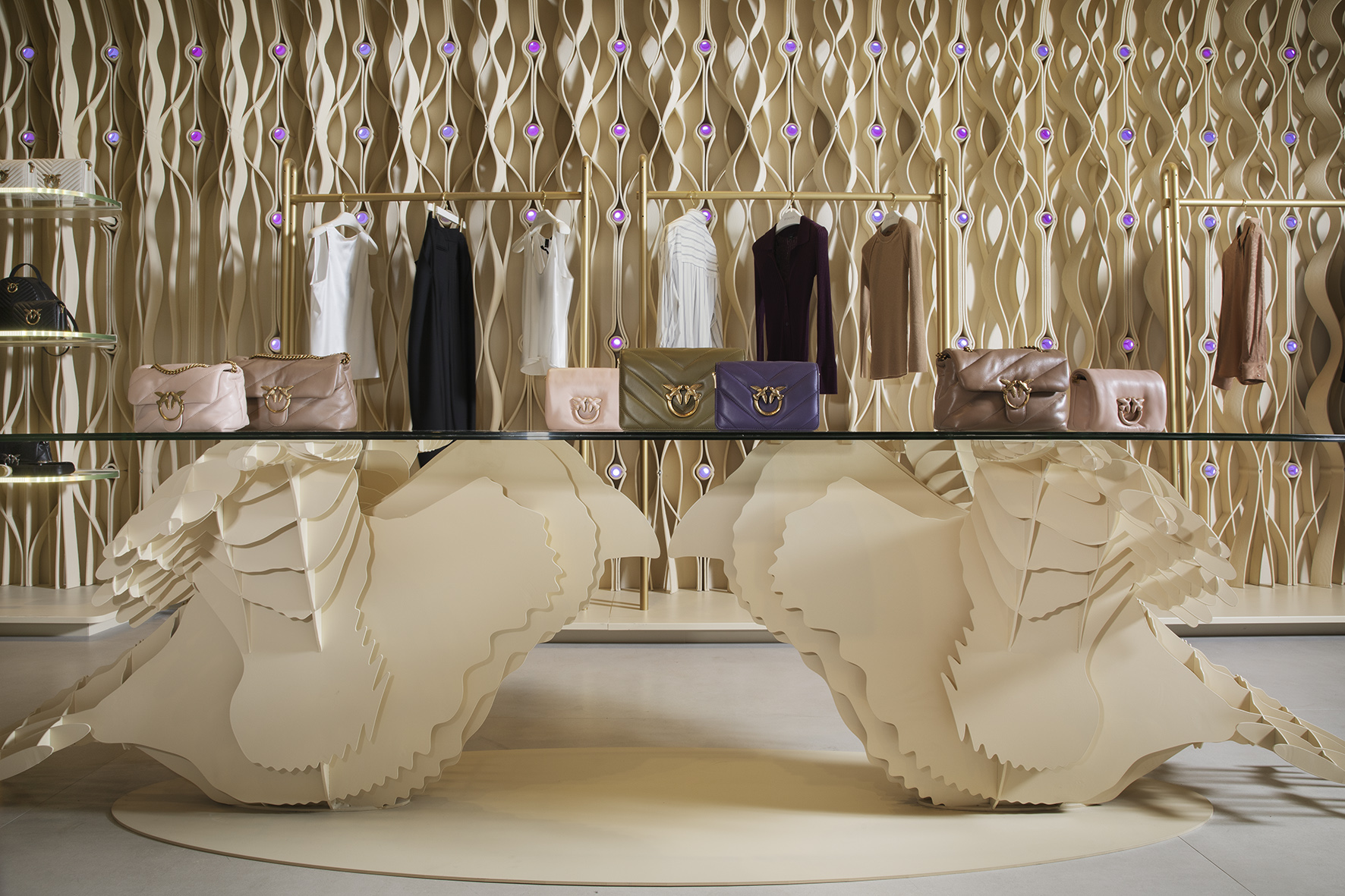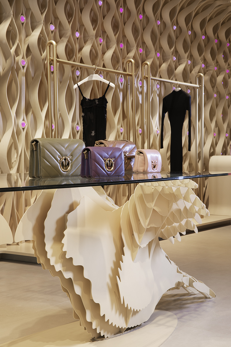 The main source of inspiration for this project was the intricate weaving of the fabrics from which Pinko's designs are made and the iconic swallows in the brand's logo. ‘We imagined them flying with outstretched wings, gracefully and deftly weaving the lines that form the walls of the shop, weaving the delicate branches together to form the nest. Only instead there were ingenious mechanical arms programmed to replace them,’ explains Zappulla.