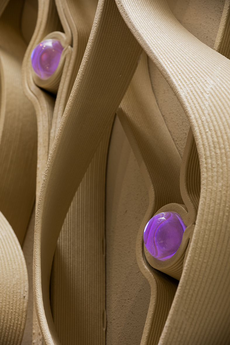 Given the complexity of the three-dimensional mesh, the production process involved creating prototypes using a novel technique in which robots 3D printed directly onto custom-made moulds. The material of choice was PIPG, - composed of 70% recycled PET-G and developed to address both environmental concerns and the need for high