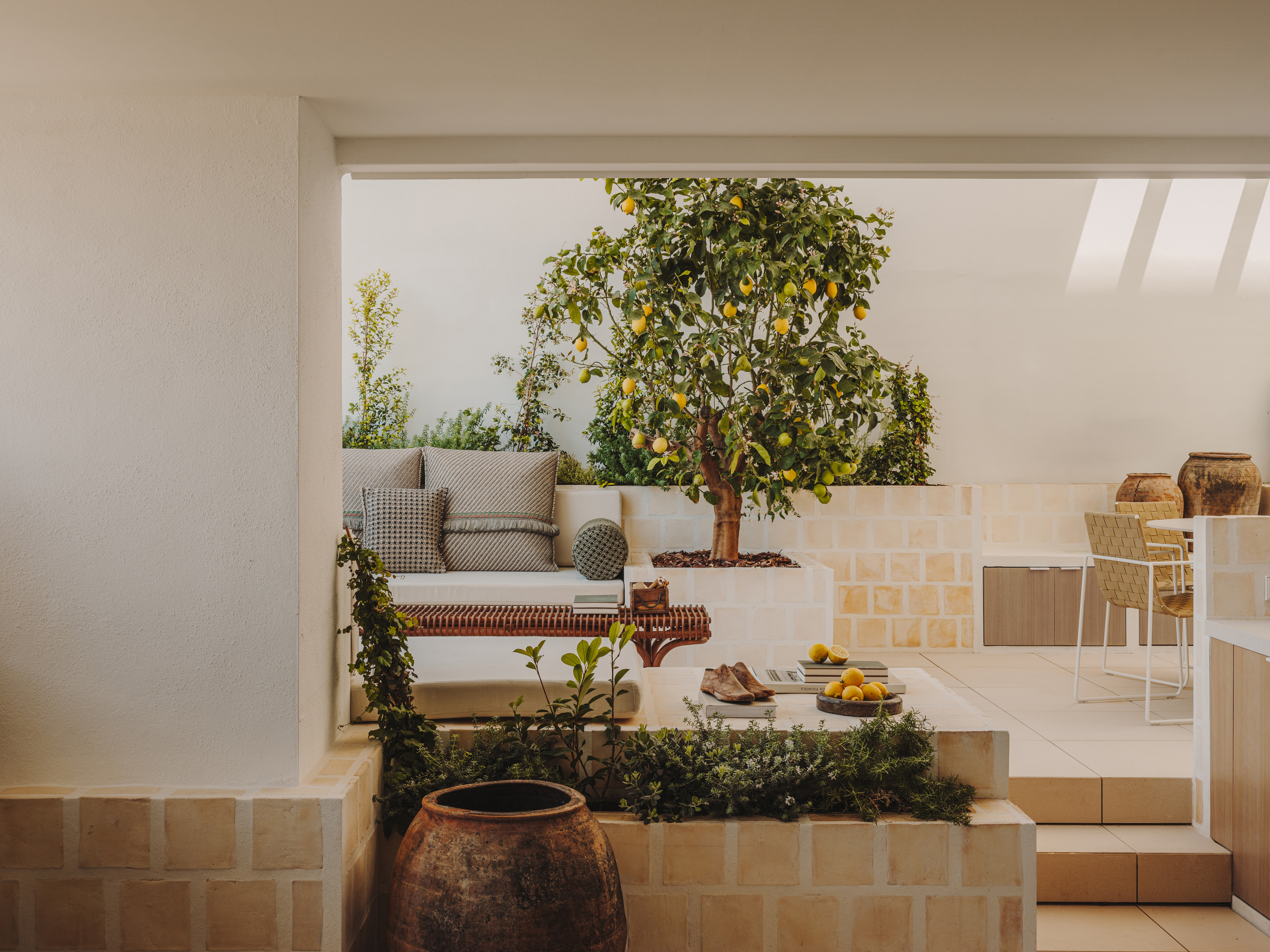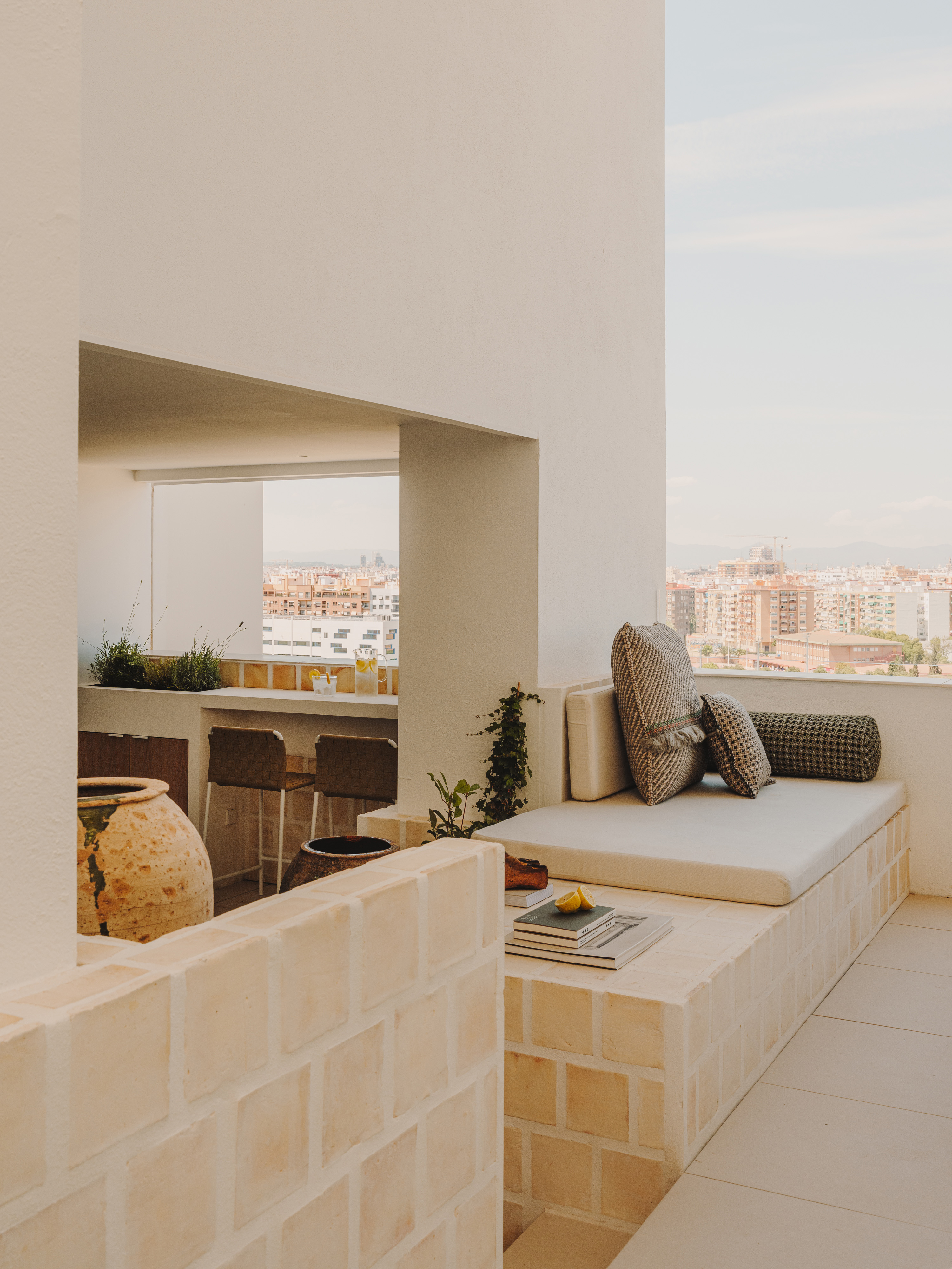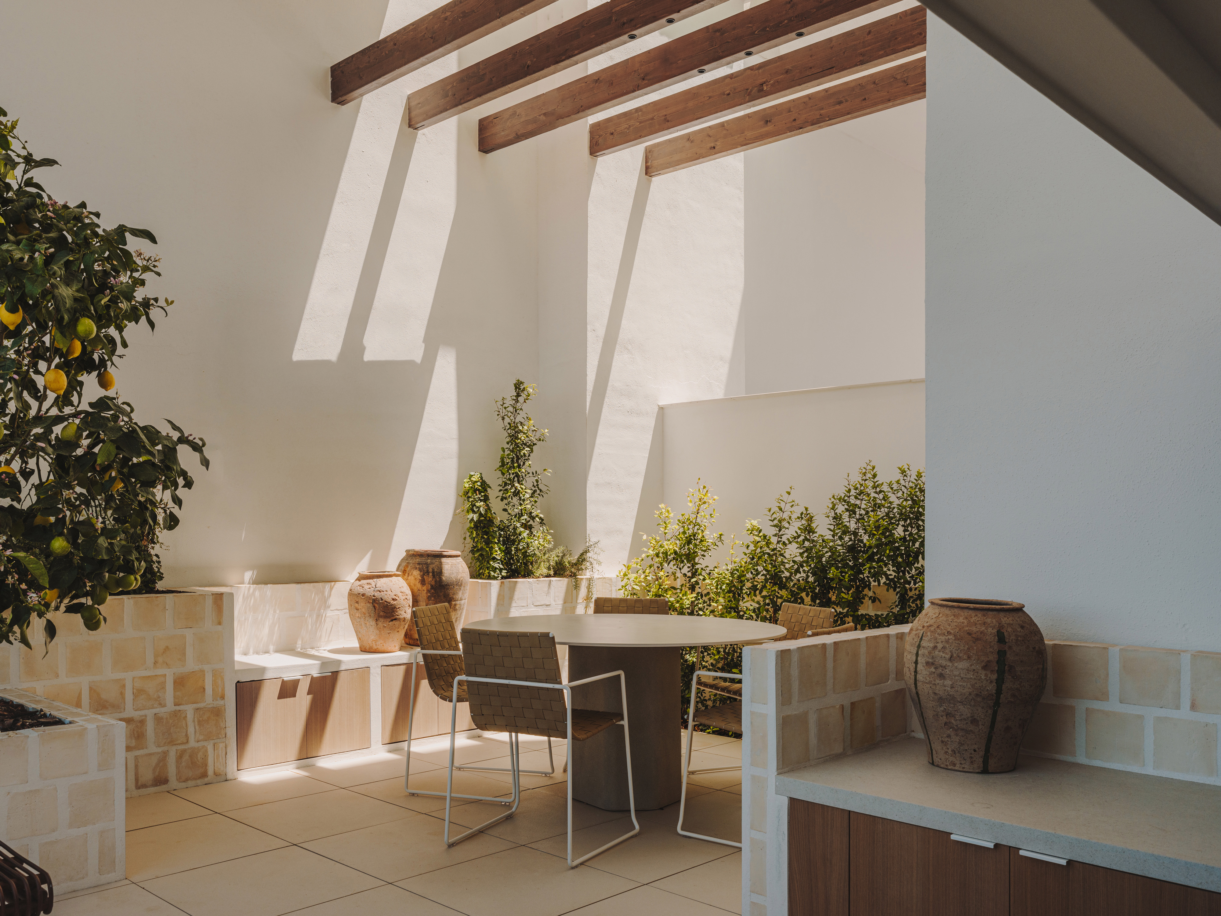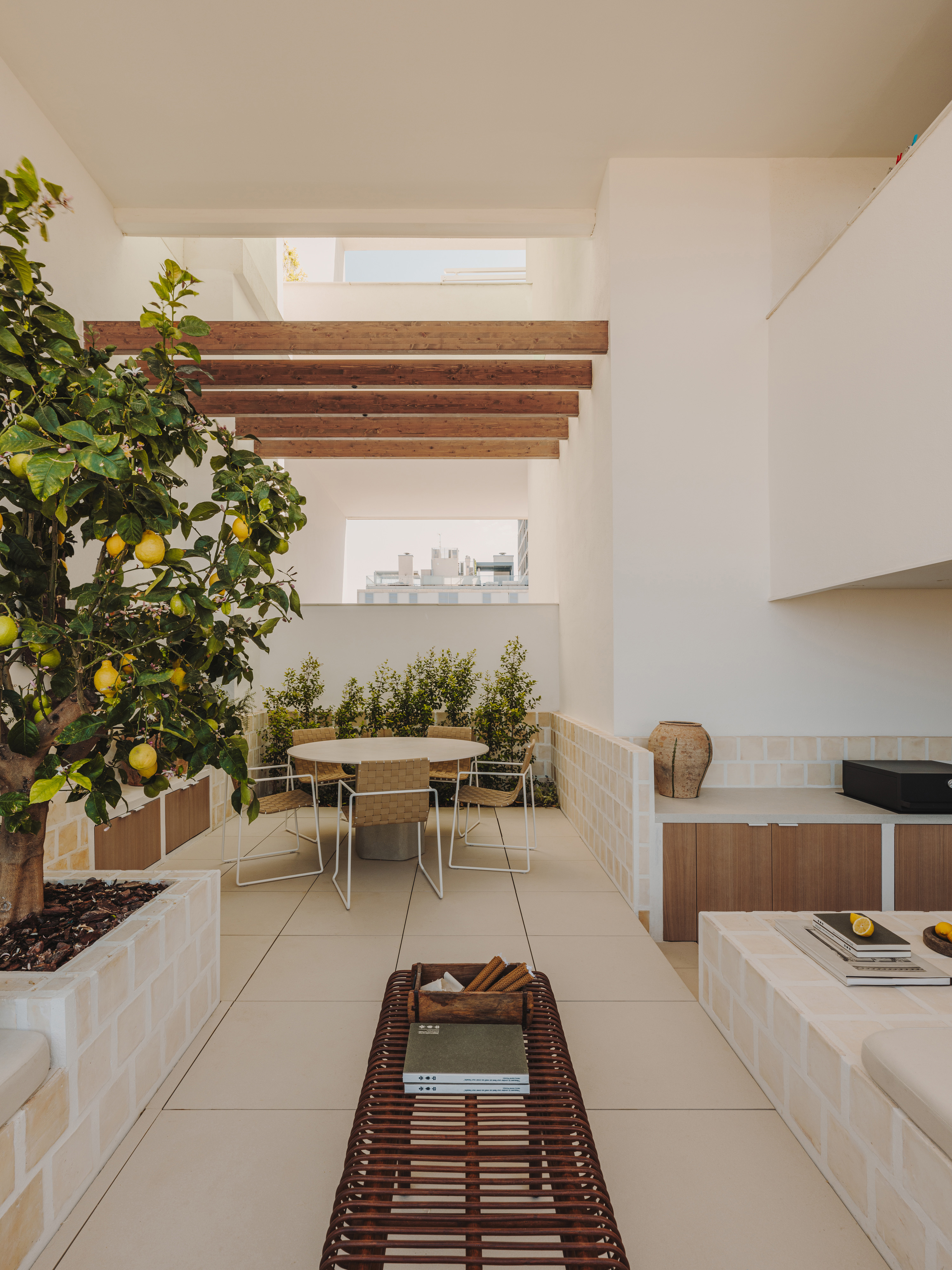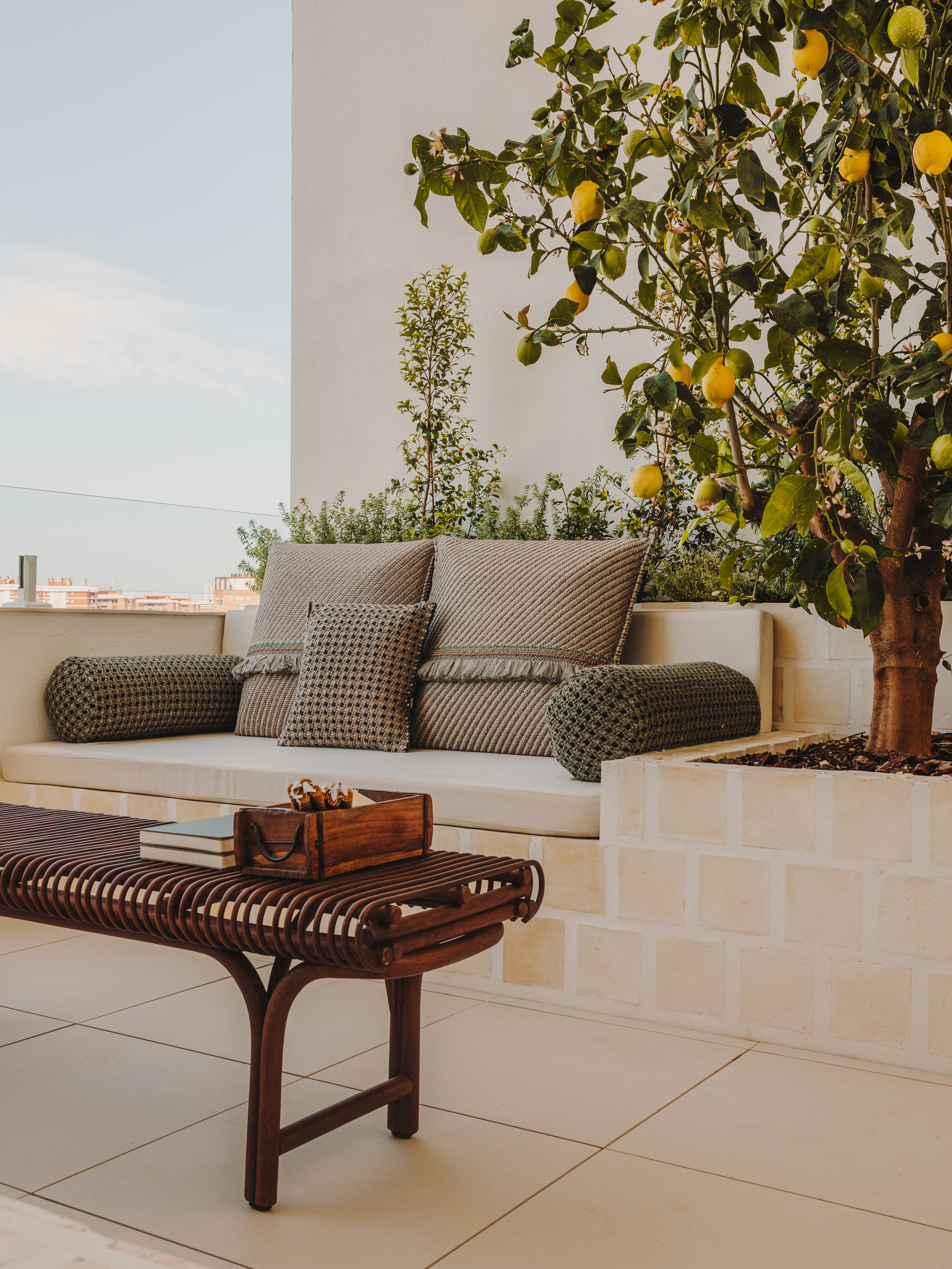 terrace reinterprets the Valencian agricultural tradition through the creation of raised beds and planting areas, bringing textures and vegetation that evoke an elevated orchard.