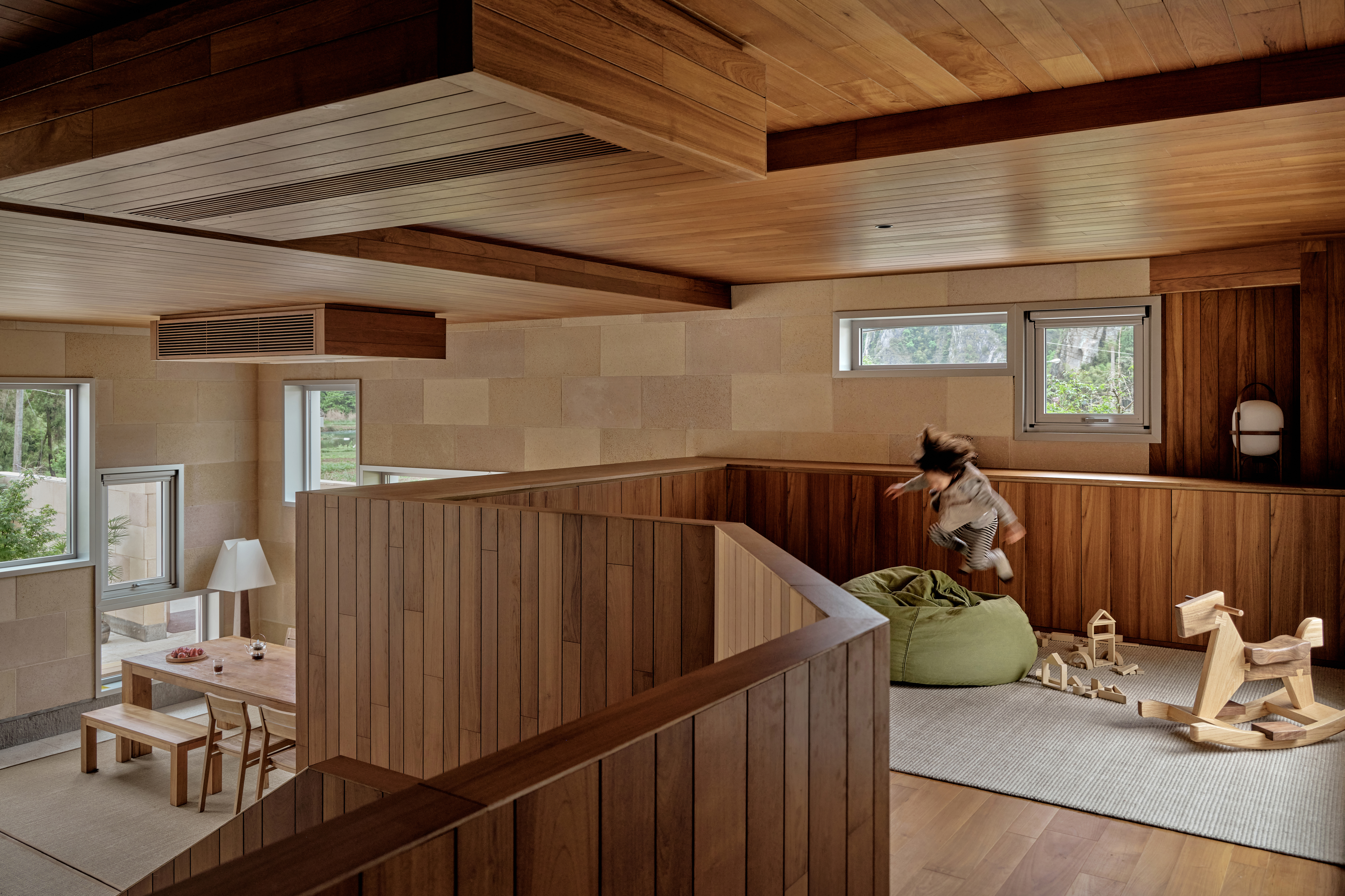 The upper area above the main hall has been thoughtfully designed with children in mind, featuring a continuous space that seamlessly connects to both the main hall and the side hall. This layout allows children to play freely while observing the activities of their elders, fostering a sense of connection within the family. Parents and grandparents can easily interact with the children and supervise them closely from any vantage point. The semi-high cabinet serves a dual purpose, providing storage and ensuring the safety of the children. This small mezzanine area is dedicated to safe playful exploration for children.