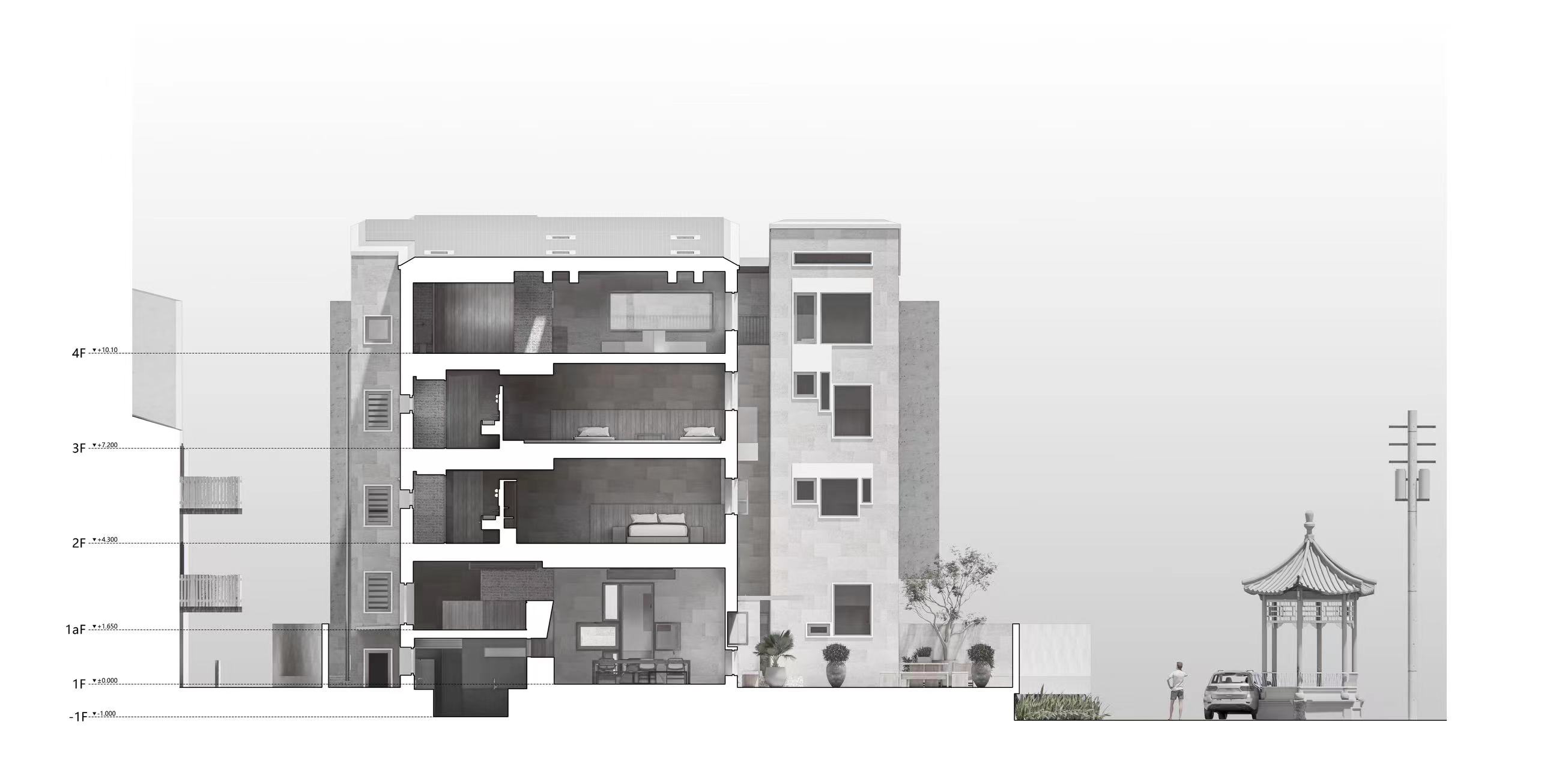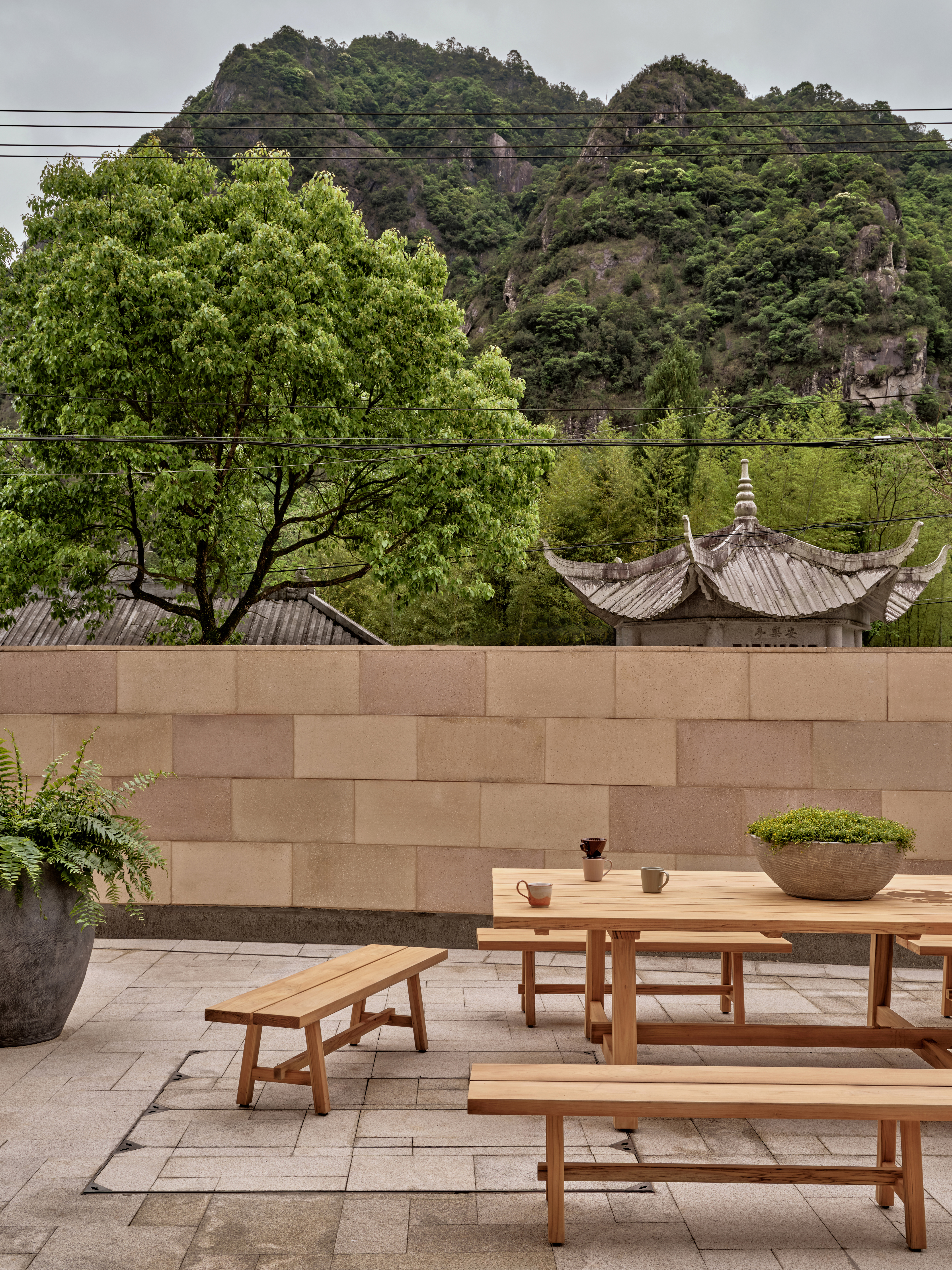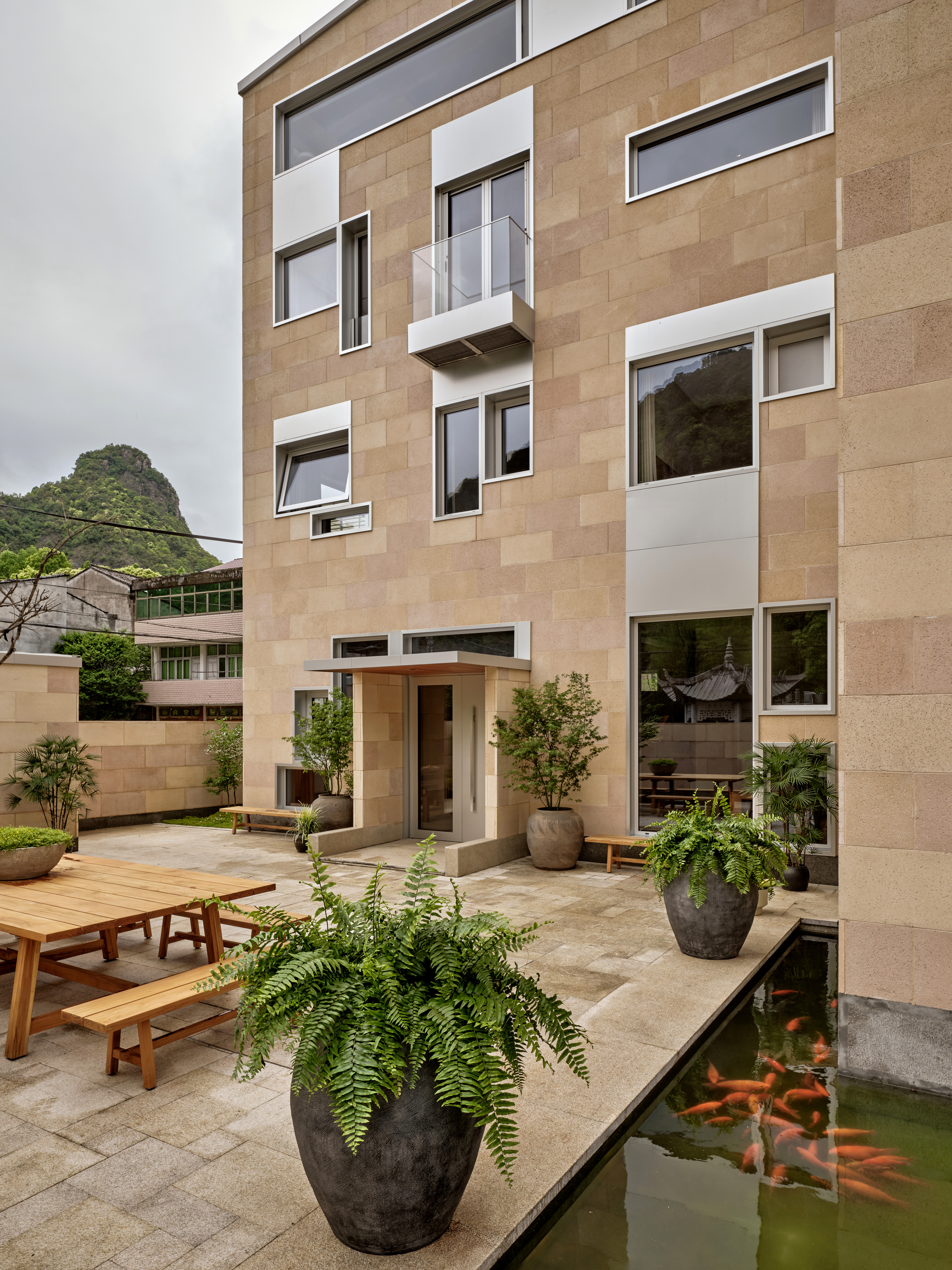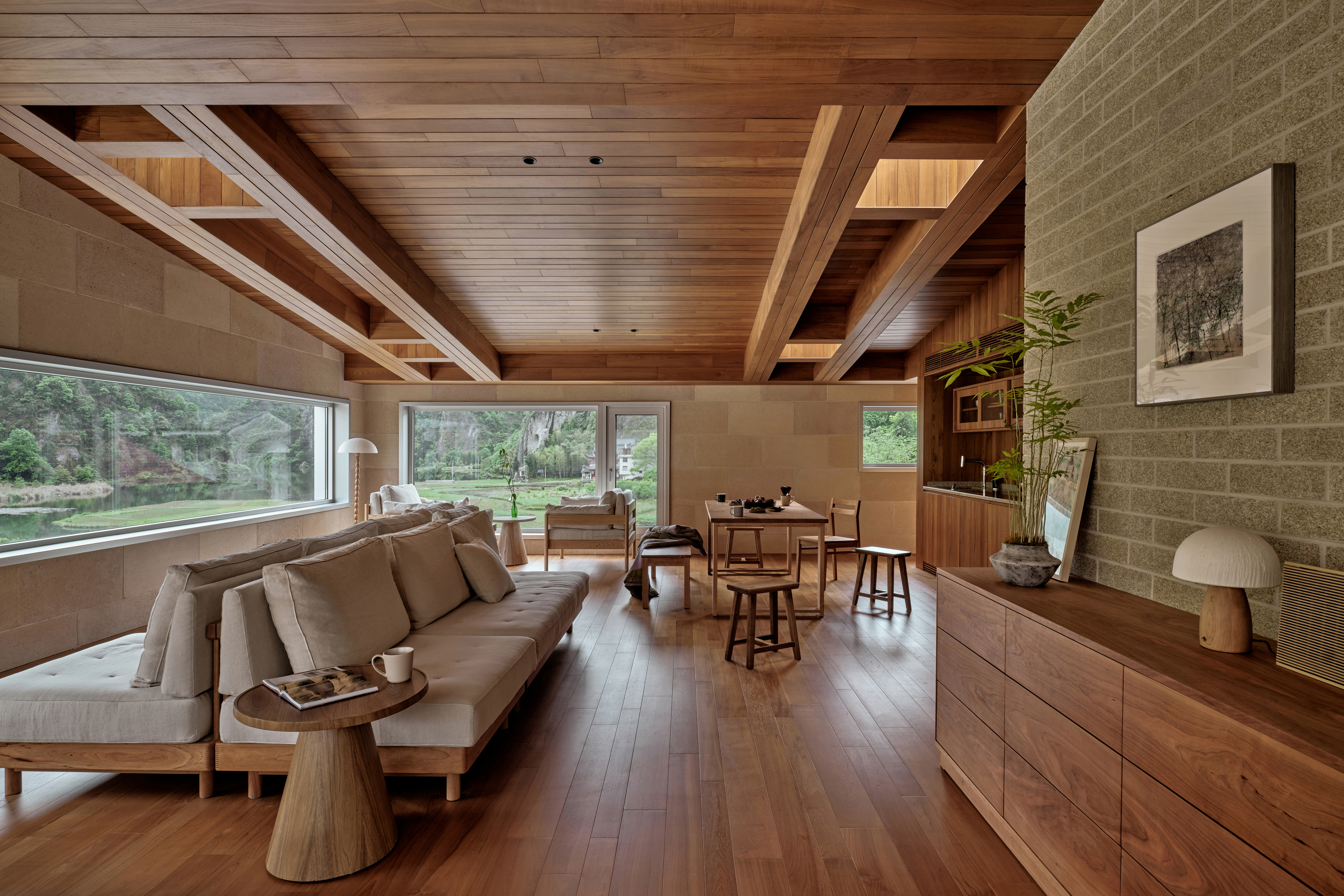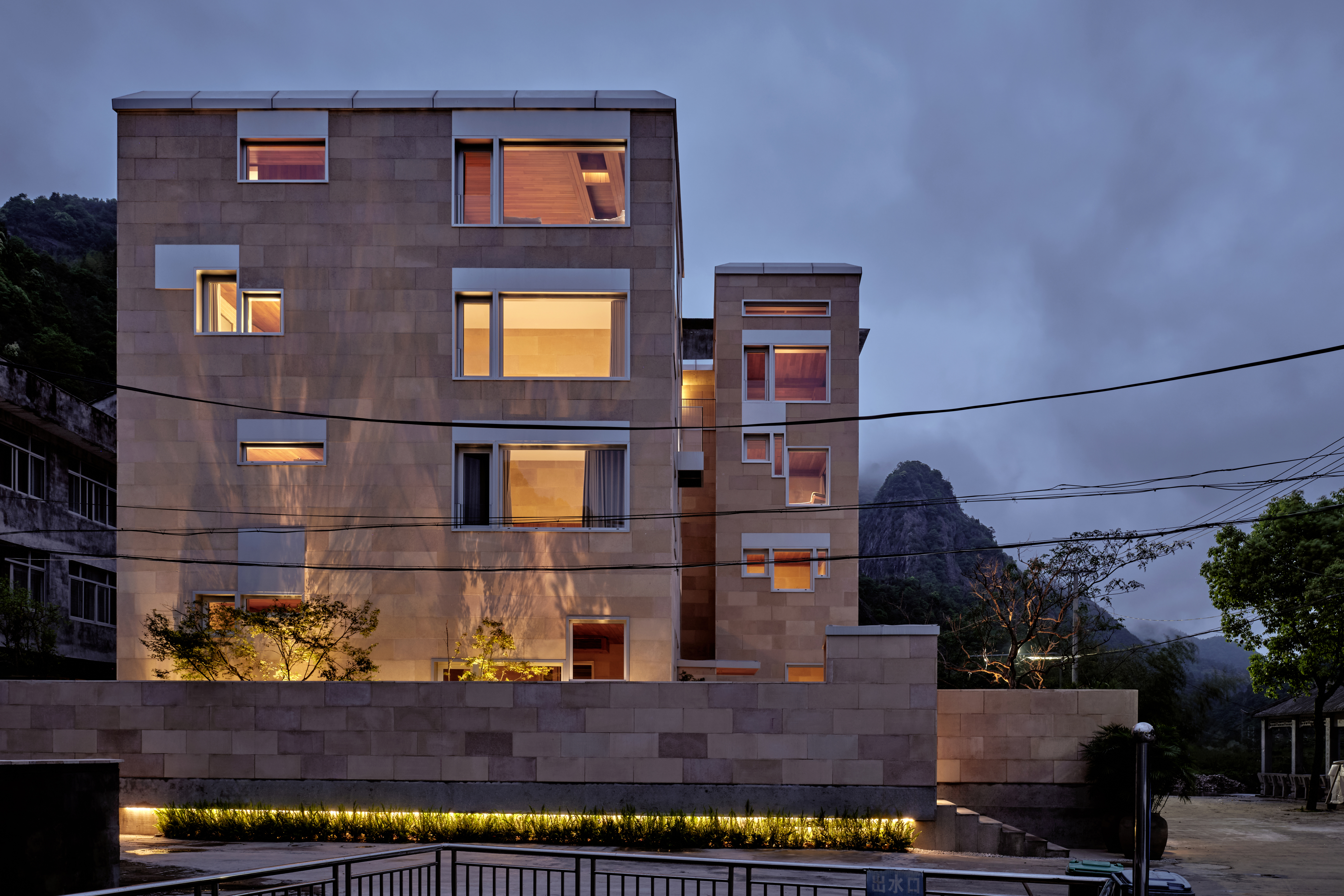 The design of the doors and windows reflects designer Dongzi Yang's impression of Jiangnan. "The vernacular houses exude a sense of layered and staggered orderliness, creating a picturesque scene when viewed from a distance through the misty rain. The glowing windows piercing through the haze form an abstract composition of varying sizes of cubes, leaving a lasting impression. Beyond its natural beauty, Jiangnan offers an abundance of natural light and flowing wind, elements often artificially replicated in urban settings. Various Associates intended to seamlessly blend urban lifestyle with rural architecture, crafting a residence that perfectly complements modern living while embracing the tranquility of Yongjia."