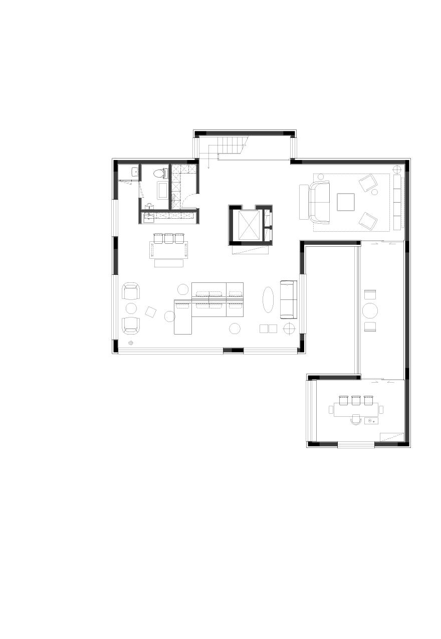 In the living room on the top floor, four groups of sofas and a small dining table are strategically arranged, offering designated areas for enjoying the scenery, sipping tea, eating snacks, watching movies, and engaging in conversations. This versatile environment encourages relaxed and comfortable gatherings, where the serene beauty of the countryside unfolds just beyond the expansive windows.