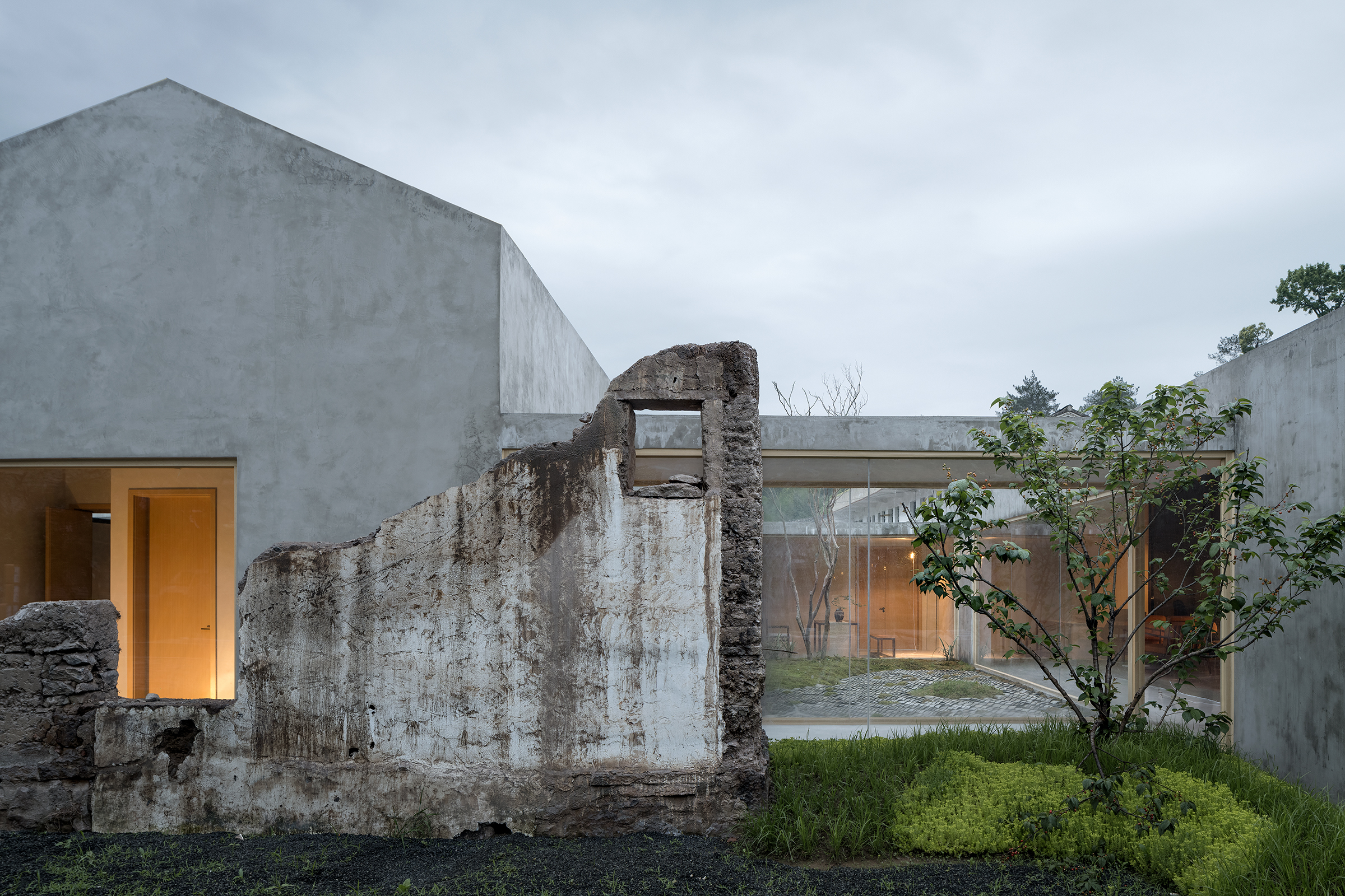Historical folk houses were traditionally constructed using rammed earth walls and bricks, but rammed earth walls are susceptible to weathering and erosion. In the current state, both the roofs and the rammed earth walls of the two buildings have deteriorated and cannot serve as the structural components of new buildings. Therefore, the Villagers' Home is built with new concrete walls, which contrast sharply with the original rammed earth walls. This design not only incorporates new technology, but also harmonizes with the surrounding environment and resolves the conflict with the village, creating a transition between the past and the present.