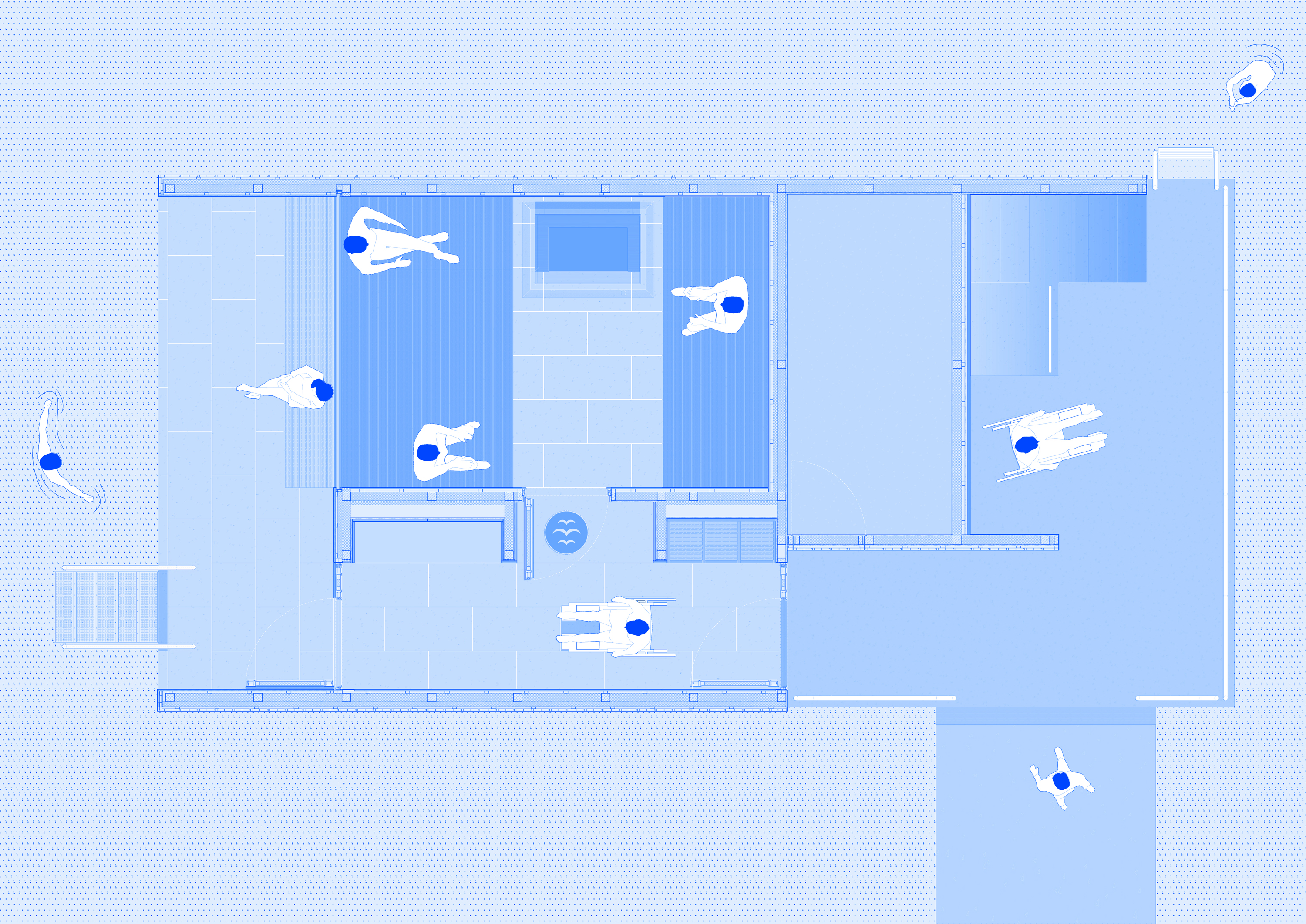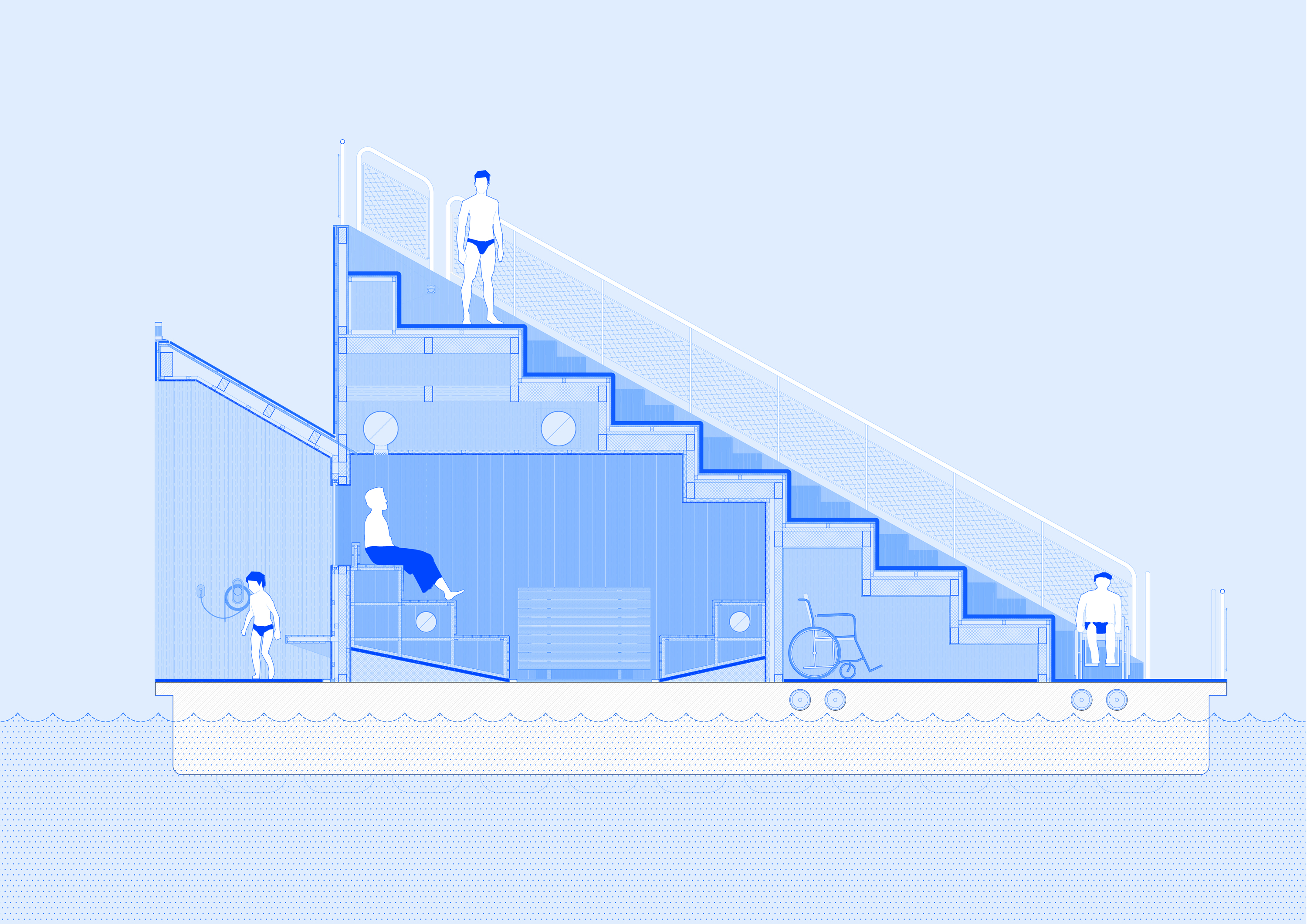 Two years after the inauguration of the Munch Museum, Estudio Herreros has completed “Tros- ten”, a small architectural manifesto built on the Oslo´s Fjord. The Floating Sauna commissioned by the non-profit Oslo Sauna Association is align- ing with their vision of “bringing sauna to the people.” Following the tradition of architectural follies, the project features a distinct volume and silhouette with a strong, colorful component, serving as a point for both individual and collec- tive use, offering retreat and contemplation at the foot of the Munch Museum. The program is divided into a sauna cabin with direct access to the water and an amphitheater facing the fjord allowing for small events. The construction com- bines sustainable design through an ambitious energy system that ensures consistent heat at all levels; conscious use of natural and recycled ma- terials; and social inclusion, being the first univer- sally accessible sauna with a steam recirculation system that facilitates heat for convenient use, also when seated in a wheelchair.