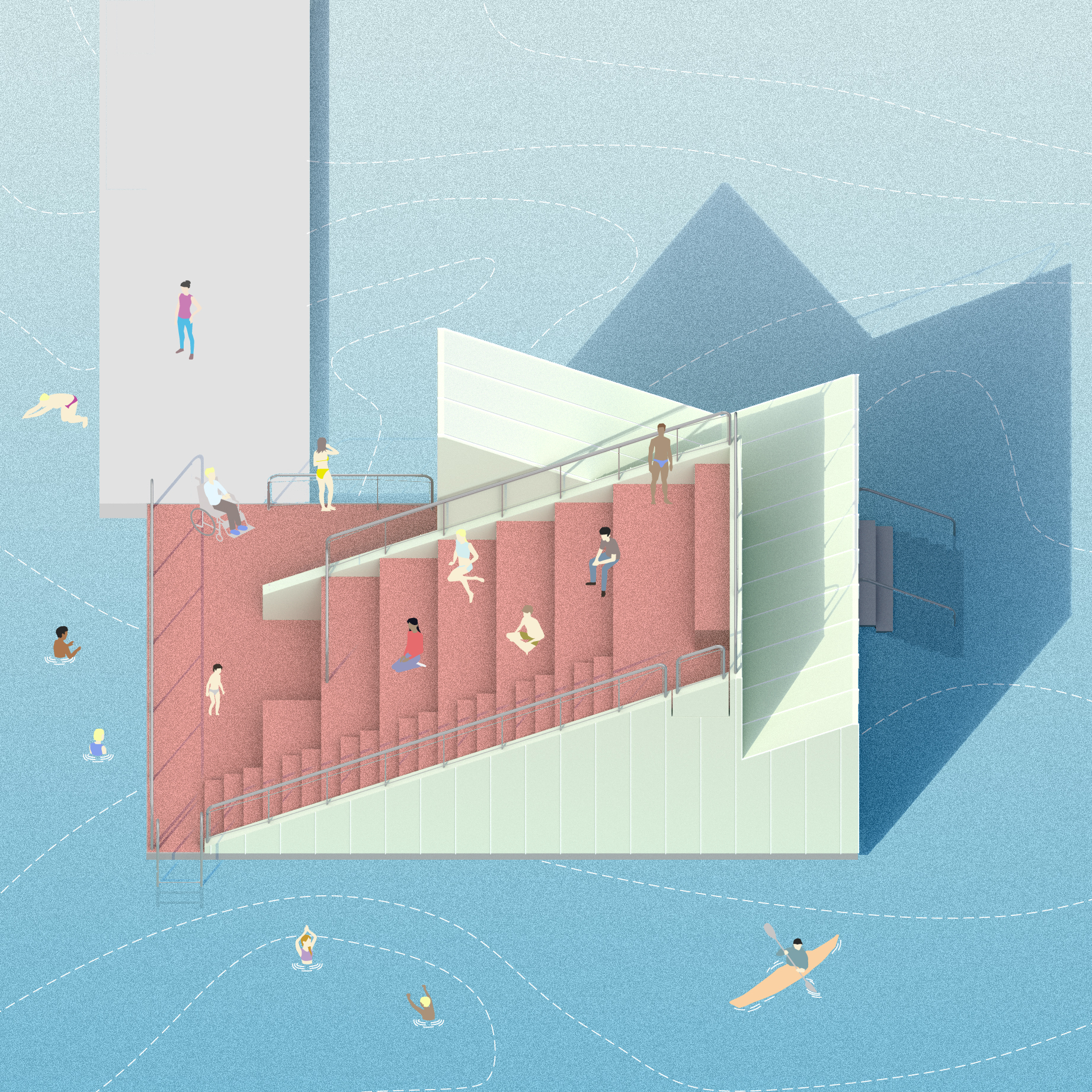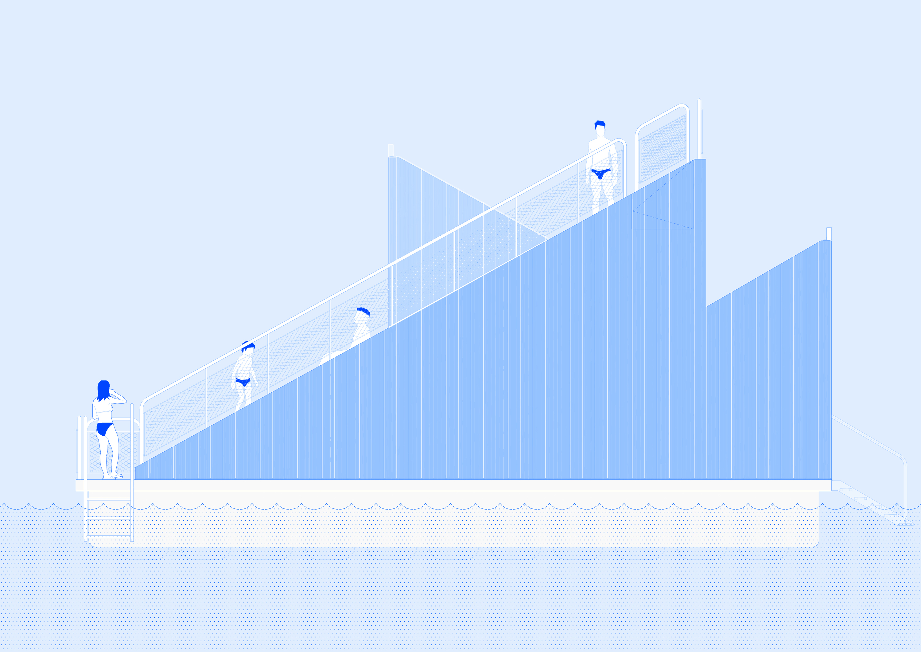 Two years after the inauguration of the Munch Museum, Estudio Herreros has completed “Tros- ten”, a small architectural manifesto built on the Oslo´s Fjord. The Floating Sauna commissioned by the non-profit Oslo Sauna Association is align- ing with their vision of “bringing sauna to the people.” Following the tradition of architectural follies, the project features a distinct volume and silhouette with a strong, colorful component, serving as a point for both individual and collec- tive use, offering retreat and contemplation at the foot of the Munch Museum. The program is divided into a sauna cabin with direct access to the water and an amphitheater facing the fjord allowing for small events. The construction com- bines sustainable design through an ambitious energy system that ensures consistent heat at all levels; conscious use of natural and recycled ma- terials; and social inclusion, being the first univer- sally accessible sauna with a steam recirculation system that facilitates heat for convenient use, also when seated in a wheelchair.