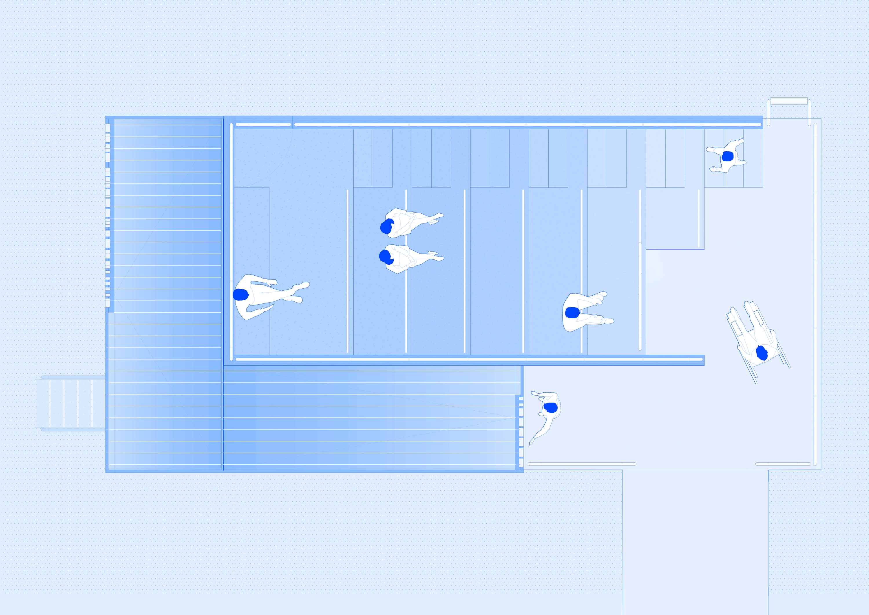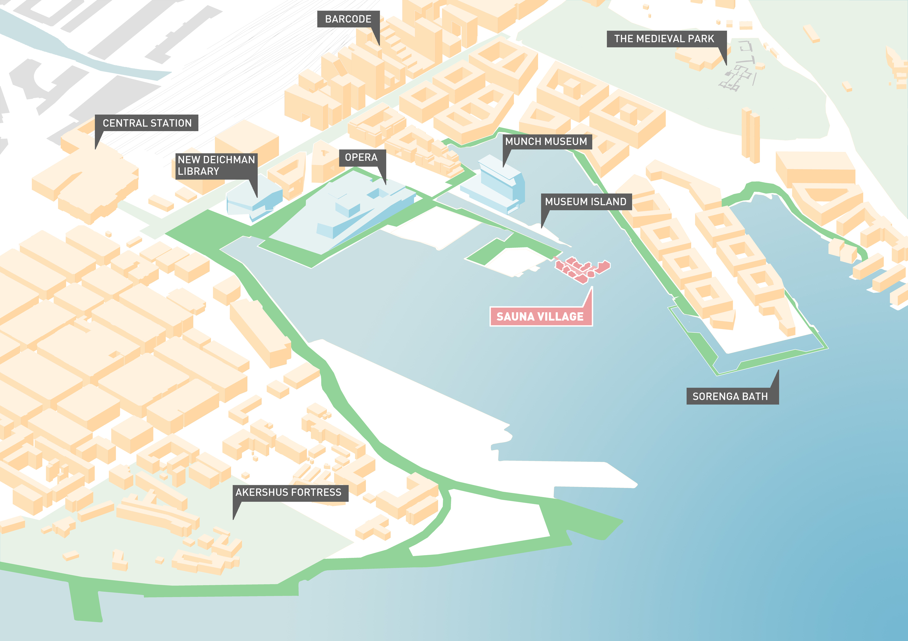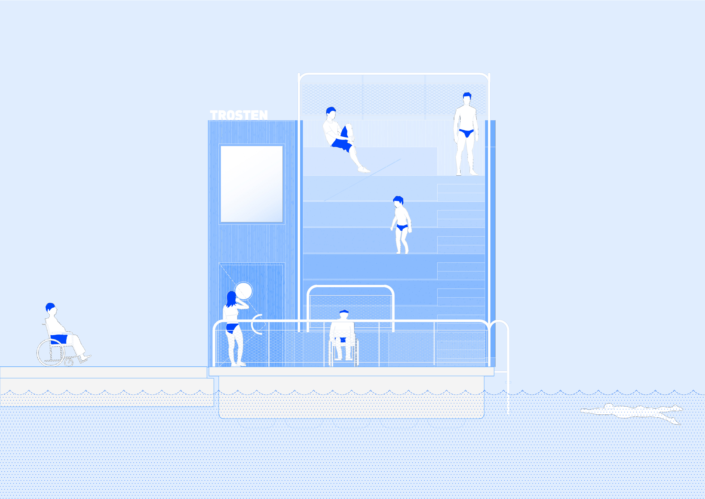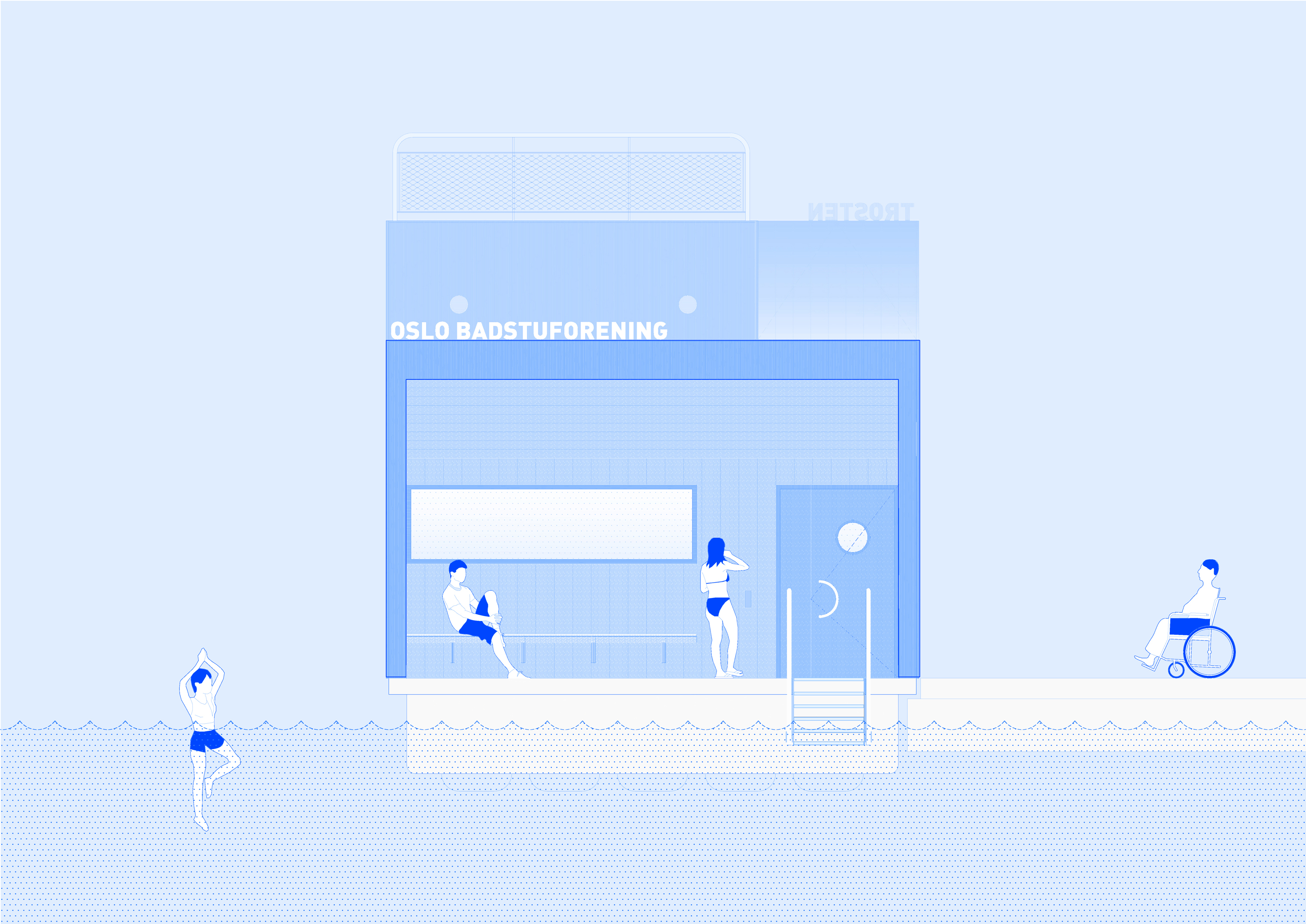 The recognizable volume of Trosten is the latest addition to the cluster of floating saunas designed by different architects at the mouth of the Aker- selva River. The sauna village dissolves the bound- ary between peninsula and fjord water while being part of the Harbour Promenade that has emerged after the historic container port disap- peared. This promenade now offers 7km of public space including walking, jogging, and biking cir- cuits, as well as seating areas, beaches, solariums, and bathing platforms active year-round.