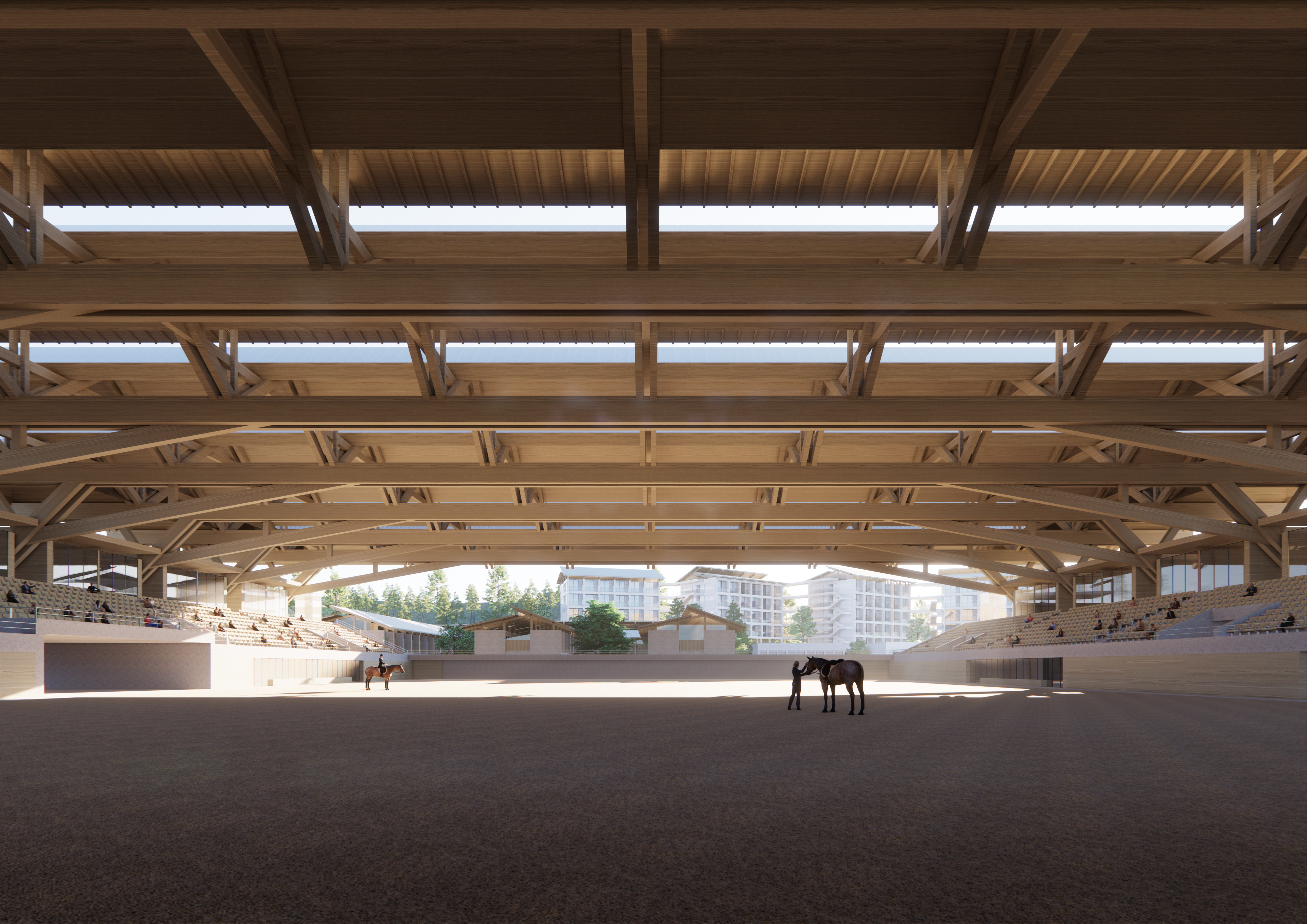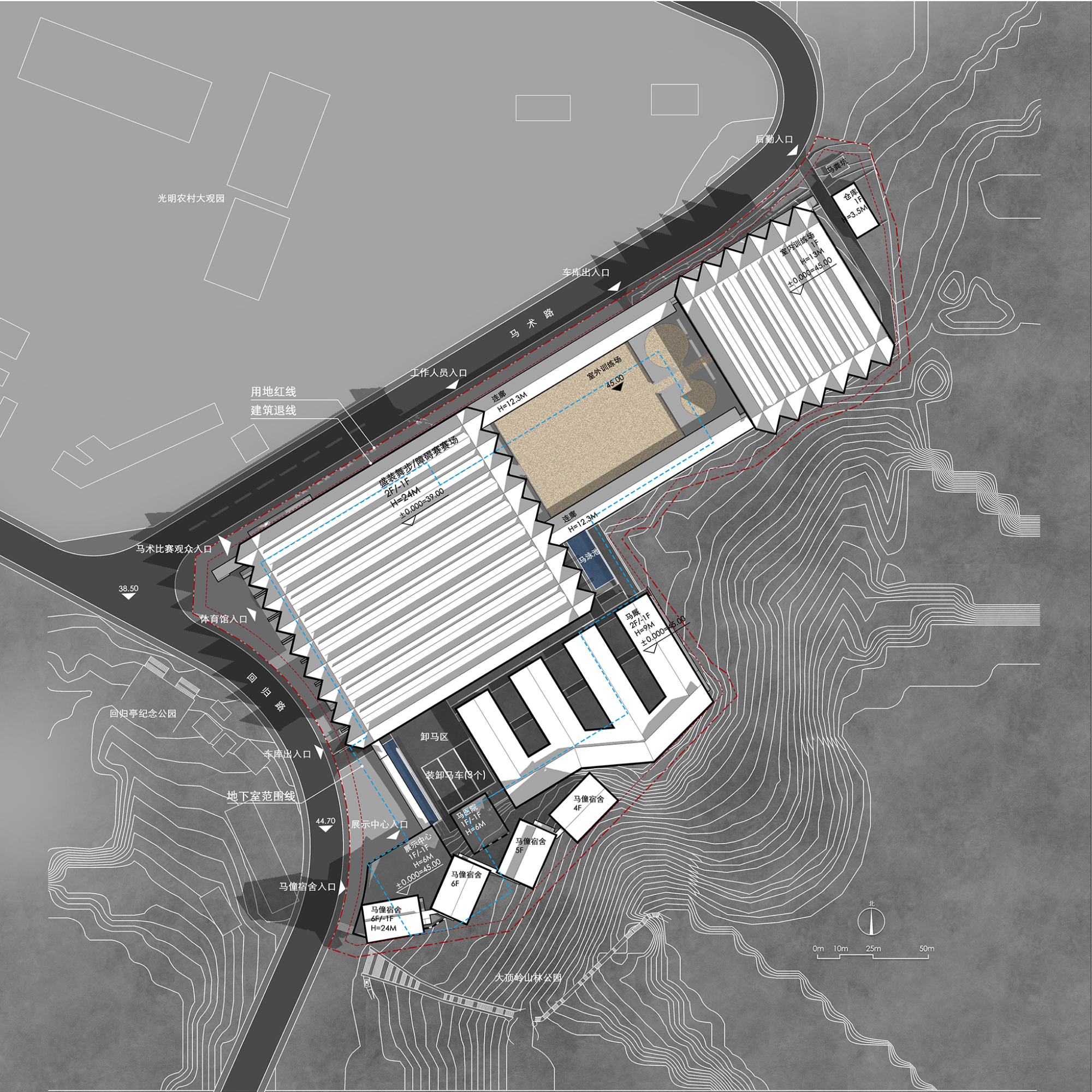 시설에는 약 200마리의 말을 수용할 수 있는 마구간과 메인 경기장, 실내 훈련장, 야외 훈련장, 이벤트 공간이 마련되어 있다. 행사장의 지상층은 서로 다른 고도에 분포하는 다양한 스케일의 ‘갤러리’를 통해 상호적으로 연결되어 있다. 복도는 빛과 바람, 풍경이 건물을 관통하여 자연 요소와의 반복적인 조우를 통해 중국적인 문화 분위기를 고조시킨다. 행사장 내부는 개방적으로 계획할 수 있는 충분한 공간을 두어 승마 문화에 대한 몰입감 있는 경험을 선사한다.